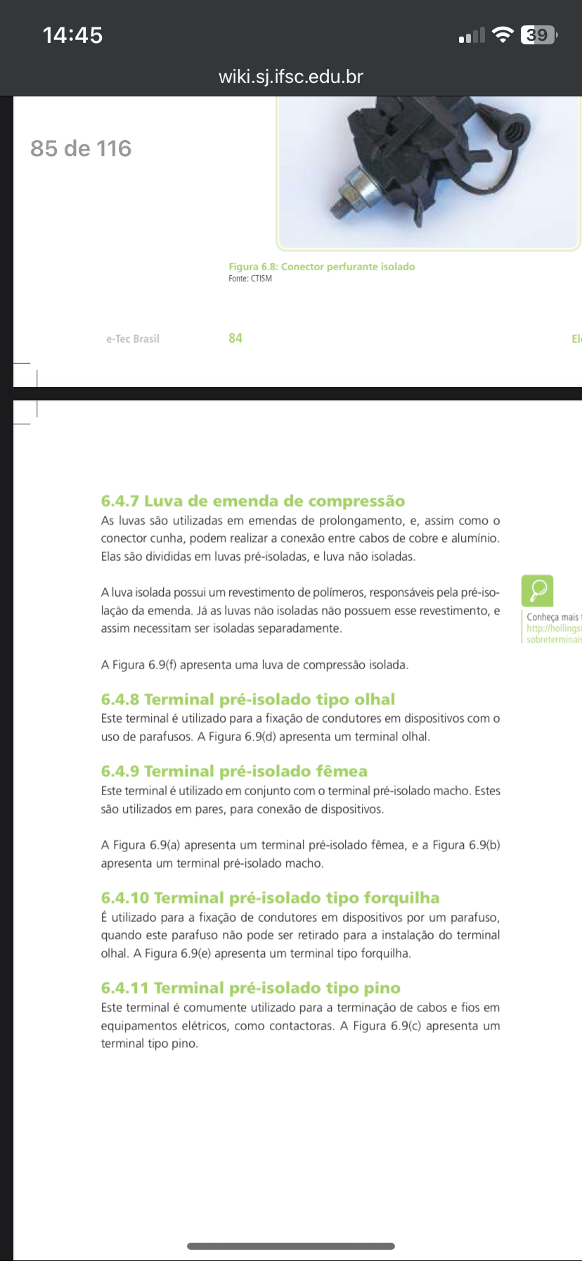 14:45 39 wiki.sj.ifsc.edu.br 85 de 116 Figura 6.8: Conector perfurante isolado Fonte: CTISM e-Tec Brasil 84 6.4.7 Luva de emenda de compressão As luvas são utilizadas em emendas de prolongamento, e, assim como o conector cunha, podem realizar a conexão entre cabos de cobre e Elas são divididas em luvas pré-isoladas, e luva não A luva isolada possui um revestimento de polímeros, responsáveis pela pré-iso- lação da emenda. Já as luvas não isoladas não possuem esse revestimento, e Conheça mais assim necessitam ser isoladas separadamente. http://hollings sobreterminais A Figura 6.9(f) apresenta uma luva de compressão isolada. 6.4.8 Terminal pré-isolado tipo olhal Este terminal é utilizado para a fixação de condutores em dispositivos com o uso de parafusos. A Figura 6.9(d) apresenta um terminal olhal. 6.4.9 Terminal pré-isolado fêmea Este terminal é utilizado em conjunto com terminal pré-isolado macho. Estes são utilizados em pares, para conexão de dispositivos. A Figura 6.9(a) apresenta um terminal pré-isolado fêmea, e a Figura 6.9(b) apresenta um terminal pré-isolado 6.4.10 Terminal pré-isolado tipo forquilha É utilizado para a fixação de condutores em dispositivos por um parafuso, quando este parafuso não pode ser retirado para a instalação do terminal olhal. A Figura 6.9(e) apresenta um terminal tipo forquilha. 6.4.11 Terminal pré-isolado tipo pino Este terminal é comumente utilizado para a terminação de cabos e fios em equipamentos elétricos, como contactoras. A Figura 6.9(c) apresenta um terminal tipo pino.
