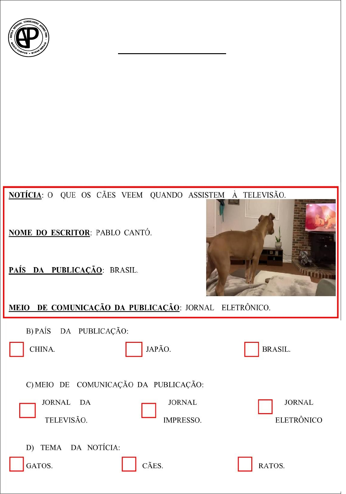 ESCOLA ESTADUAL CONSELHEIRO AFONSO PENA LINGUAGENS ESCOLA:____________________________________________________________ NOME:______________________________________________________________ TURMA:__________________________ DATA:_____________________________ Questão 1: Observe a imagem: Questão 2: A capa abaixo representa: Questão 3: V Questão 4: Observe a charge abaixo: Questão 5: OBSERVE A CAMPANHA PUBLICITÁRIA ABAIXO E RESPONDA: Fonte: http://revistacrescer.globo.com A IMAGEM ACIMA RETRATA UMA CAMPANHA DE: ( ) ( ) ( ) Questão 6: O TRENZINHO DE SEU NICOLAU UM DIA SEU NICOLAU FOI ESPIAR A VELHA ESTAÇÃO E DISSE: QUE TRISTEZA NO MEU CORAÇÃO! É QUE O VELHO TRENZINHO, SEU COMPANHEIRO, SERIA VENDIDO PARA O FERRO VELHO. ENTÃO, SEU NICOLAU RESOLVEU O PROBLEMA : COMPROU O TRENZINHO E NUNCA MAIS FICOU SOZINHO. AGORA A CRIANÇADA VIVE BRINCANDO NO SEU QUINTAL, SÓ SE HOUVE DIZER: POSSO BRINCAR NO SEU TRENZINHO, SEU NICOLAU? ASSIM TODO DIA É PURA BRINCADEIRA, NICOLAU ACENDE A CALDEIRA E APITA : PIUIIIIIIIII...... E NA CALDEIRA TODA AMASSADA FAZ PIPOCAS PARA A CRIANÇADA. TEXTO ADAPTADO: ( RUTH ROCHA ) 1) QUAL É O TÍTULO DA HISTÓRIA? _ _ 2) O TEMA DA HISTÓRIA È: ( ) A VENDA DO VELHO TRENZINHO. ( ) UM DIA NO CIRCO. ( ) A BRINCADEIRA NO PARQUE. 3) O QUE FEZ NICOLAU? ( ) COMPROU UM CARRO ( ) COMPROU UMA FAZENDA Questão 7: O ELEFANTE ACROBATA ZIMBO ERA UM ELEFANTINHO DO CIRCO ZABUMBA. ZIMBO VIVIA MUITO TRISTE. SABEM POR QUÊ? ELE ERA TÃO DESAJEITADO QUE NÃO APRENDIA A FAZER NADA NO CIRCO. ZIMBO FICAVA OLHANDO OS TRAPEZISTAS E PENSAVA: __ AH! QUEM ME DERA SER UM TRAPEZISTA! UM DIA, O TREINADOR DO CIRCO LHE DISSE: __ SE VOCÊ QUISER, APRENDERÁ QUALQUER COISA. É SÓ TREINAR. ANIMADO POR ESTE CONSELHO, O ELEFANTE COMEÇOU A TREINAR TODOS OS DIAS PARA TRABALHAR NO CIRCO. DEPOIS DE ALGUM TEMPO, NÃO HAVIA OUTRO ELEFANTE QUE FIZESSE QUALQUER ACROBACIA MELHOR QUE ELE. SUBIA NO BUMBO, TOCAVA TAMBOR COM A TROMBA E DANÇAVA NAS PATAS TRASEIRAS. AS CRIANÇAS IAM AO CIRCO SÓ PARA VÊ-LO. __ VIVA ZIMBO! VIVA O ELEFANTE ACROBATA! – GRITAVAM. O AMOR DA CRIANÇADA FAZIA ZIMBO FICAR MUITO FELIZ. D´OLIM MAROTE RESPONDA: 1) QUAL O TÍTULO DO TEXTO? _ _ 2) QUANTOS PARÁGRAFOS O TEXTO TEM? _ _ __________________________ 3) O QUE ELE FEZ DEPOIS DO CONSELHO? _ __ _ _ 4) QUAIS AS PRINCIPAIS ACROBACIAS QUE ELE APRENDEU? _ __ _ 5) O QUE A CRIANÇADA GRITAVA? _ _ Matemática Questão 8: Escreva em forma de algarismos: 0. Duzentos e vinte e cinco: 0. Trezentos e trinta: 0. Quatrocentos e dois: 0. Quinhentos e cinquenta e sete: e)Cento e oitenta e quatro: f)Setecentos e sessenta e nove: Questão 9: Escreva por extenso: a)204 b)320 c)189 d)543 e)400 Questão 10: Forme os numerais: 0. 2 centenas + 6 dezenas + 4 unidades: 0. 3 centenas + 8 dezenas +9 unidades: 0. 5 centenas + 9 dezenas: 2. 4 centenas + 5 unidades: Questão 11: Observe os números abaixo e faça o que se pede: 58 – 27 – 35 – 12 – 42 – 169 – 7 – 94 - 281 1. Copie os números acima na ordem crescente: 1. Copie os números acima na ordem decrescente: 1. Copie todos os números pares: 1. Copie todos os números ímpares: 1. Escreva por extenso o maior número representado acima: 1. Qual é o triplo do menor número representado acima? Ciências Naturais Questão 12: Quando se comemora o dia do meio ambiente? A) 25 de Dezembro B) 01 de Janeiro C) 05 de Junho D) 25 de Junho Questão 13: O que podemos encontrar no ambiente natural? A) Plantas, a terra, o ar, a água. B) Piscina, quadro de basquete, plantas. C) plantas, campo de futebol, o ar. D) Piscina, Plantas, campo de futebol. Questão 14: Em quantas regiões está dividido o Brasil? a) 5 regiões b) 15 regiões c) 10 regiões d)6 regiões Ciências Humanas Questão 15: Questão 16: Observe as imagens e circule as situações nas quais não está acontecendo o diálogo entre as pessoas: Questão 17: 3) Observe a imagem: O “Abaporu” foi a tela mais cara vendida até hoje no Brasil, qual foi o artista que pintou o quadro? A) Oswaldo de Andrade B) Tarsila do Amaral C) Frida Kahlo D) Rafael Sanzio Questão 18: Afirmando que a razão era a melhor forma de conseguir liberdade, o iluminismo foi: a) Uma forma de governo b) Um movimento filosófico e cultural c) Um protesto feito por intelectuais d) Um movimento econômico image4.jpeg image5.jpeg image6.jpeg image7.jpeg image8.jpeg image9.png image10.png image11.jpeg image12.jpeg image13.png image14.jpeg image15.png image16.jpeg image17.jpeg image18.jpeg image19.png image1.emf image2.jpeg image3.jpeg