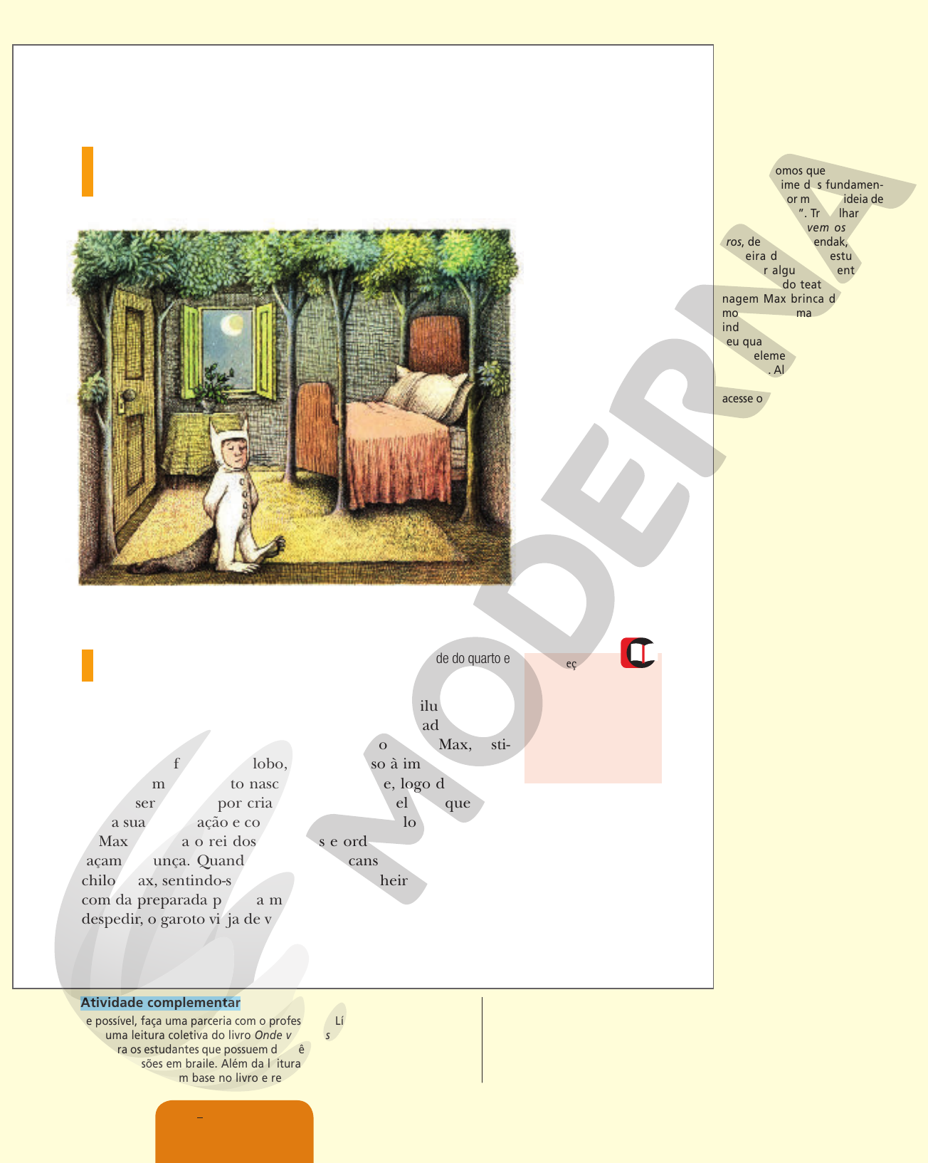171o BIMESTRE Um espaço para a imaginação Você já imaginou ser diferente de quem você é? O que você gostaria de brincar de ser? Feche os olhos e experimente! Para onde sua imaginação leva você? Quais são as ideias que vêm à sua mente? Respostas pessoais. 7 Observe a imagem acima: quais elementos fazem parte da realidade do quarto e quais parecem ter saído da imaginação? Resposta pessoal. No livro Onde vivem os monstros, do escritor e ilustrador es- tadunidense Maurice Sendak (1928-2012), publicado original- mente em 1963 nos Estados Unidos, o personagem Max, vesti- do com uma fantasia de lobo, dá livre curso à imaginação. De repente, em seu quarto nasce uma floresta e, logo depois, ele passa a ser visitado por criaturas gigantes e peludas que habi- tam a sua imaginação e com as quais brinca ao longo da noite. Max se torna o rei dos monstros e ordena que seus súditos façam bagunça. Quando as criaturas, cansadas, tiram um co- chilo, Max, sentindo-se sozinho, sente um cheiro delicioso: é a comida preparada por sua mãe. Então, sem nem ao menos se despedir, o garoto viaja de volta ao seu quarto para jantar. 8 SENDAK, Maurice. [Sem título]. 1 ilustração. 1963. In: ______. Onde vivem os monstros. São Paulo: Cosac Naify, 2009. M A U R IC E S E N D A K • Conheça a história do personagem Max no livro: SENDAK, Maurice. Onde vivem os monstros. São Paulo: Cosac Naify, 2009. 17 R ep ro du çã o pr oi bi da . A rt. 1 84 d o C ód ig o P en al e L ei 9 .6 10 d e 19 d e fe ve re iro d e 19 98 . Orientações A partir deste momento do So- brevoo, inicia-se a exploração de alguns elementos consti- tuintes da linguagem teatral, contemplando a habilidade (EF69AR26) da BNCC. Como acontecerá no Capítulo 5 deste livro, propomos que o estudan- te se aproxime dos fundamen- tos teatrais por meio da ideia de “brincar de ser”. Trabalhar com o livro Onde vivem os mons- tros, de Maurice Sendak, é uma maneira de levar o estudante a pensar alguns elementos da linguagem do teatro: o perso- nagem Max brinca de ser um monstro, usa uma fantasia (uma indumentária), e o espaço de seu quarto se torna um híbrido entre elementos reais e outros ficcionais. Além disso, é sua ima- ginação que permite que ele acesse outro mundo. Sobre as atividades 7. Converse com a turma e ins- tigue os estudantes a lembrar das brincadeiras de faz de con- ta das quais já participaram; ou das vezes em que se fantasia- ram etc. 8. Podem ser apontados como elementos da realidade: a porta, o tapete, a cama, a ja- nela com a paisagem noturna e o vaso com a planta sobre uma mesa. Max e sua fantasia também fazem parte dos ele- mentos da realidade, porém já estabelecem a transição para o mundo da imaginação, este composto, por sua vez, das ár- vores, seus galhos e folhagens. Atividade complementar Se possível, faça uma parceria com o professor de Língua Portuguesa e orga- nize uma leitura coletiva do livro Onde vivem os monstros, de Maurice Sen- dak. Para os estudantes que possuem deficiência visual, pode-se tentar dispo- nibilizar versões em braile. Além da leitura, os estudantes podem assistir ao filme produzido com base no livro e refletir juntos sobre as brincadeiras de faz de conta e o fértil imaginário infantil. O filme e o livro podem também ser associados à discussão dos medos infantis apresentada no Capítulo 8 des- te livro por meio da obra da artista Rivane Neuenschwander. Sugestão para o estudante ONDE vivem os monstros. Direção: Spike Jonze. Estados Unidos, 2010, 101 min. 18 Brincar de ser outra coisa e inventar lugares imaginários também pode ser um recurso na criação de músicas, dos mais diversos tipos musicais. As músicas apresentadas a você neste capítulo são todas de um mesmo gênero, chamado de canção. É assim que são de- nominadas as músicas que têm uma letra, ou seja, um texto para ser cantado. Nelas, as palavras contam histórias e falam de sentimentos. Assim, abrem possibilidades para muitas criações e dão asas também para que a gente se imagine em diferentes situações de vida. Além disso, a canção é provavelmente o tipo de música mais ouvido no cotidiano das pessoas. Um dos mais conhecidos artistas brasileiros é o carioca Chico Buarque de Hollanda (1944-). Além de canções, ele compôs letras e músicas para peças de teatro. Em uma delas, feita para o musical Os Saltimbancos, vários animais imaginam como se- riam suas cidades ideais. Leia a seguir alguns trechos dela. Os Saltimbancos Obra teatral baseada no conto Os músicos de Bremen, dos Irmãos Grimm. Fala de quatro bichos (o Jumento, a Galinha, a Gata e o Cachorro) que, sentindo- -se explorados por seus donos, resolvem fugir. Nessa fuga, encontram- -se e formam uma banda. Juntos, libertam-se da opressão dos donos e seguem para a cidade, para tentar a sorte como músicos. Imaginar e cantar A C E R V O U H /F O LH A P R E S S OS SALTIMBANCOS. Direção: Antonio Pedro. Tradução e adaptação: Chico Buarque de Hollanda. Rio de Janeiro (RJ), 1977. 18 R ep ro du çã o pr oi bi da . A rt. 1 84 d o C ód ig o P en al e L ei 9 .6 10 d e 19 d e fe ve re iro d e 19 98 . Orientações Todas as músicas apresentadas neste capítulo são canções. Re- pare que esse termo não define um gênero musical, mas refere- -se apenas ao fato de que são músicas entoadas pela voz hu- mana. Canções podem ser de diferentes gêneros musicais e geralmente têm como parte fundamental uma letra para ser cantada. Neste capítulo fo- camos nas canções de música popular, ótimos exemplos para abordar as relações entre texto e música. Entre os elementos que podem ser destacados estão: a divisão da letra em estrofes; a existên- cia ou não de um refrão que se repete; e a localização das ri- mas. Buscamos construir, assim, referências para atividades de criação de canções; para o re- conhecimento da contribuição dos músicos ao desenvolvimen- to de formas ou gêneros mu- sicais, c