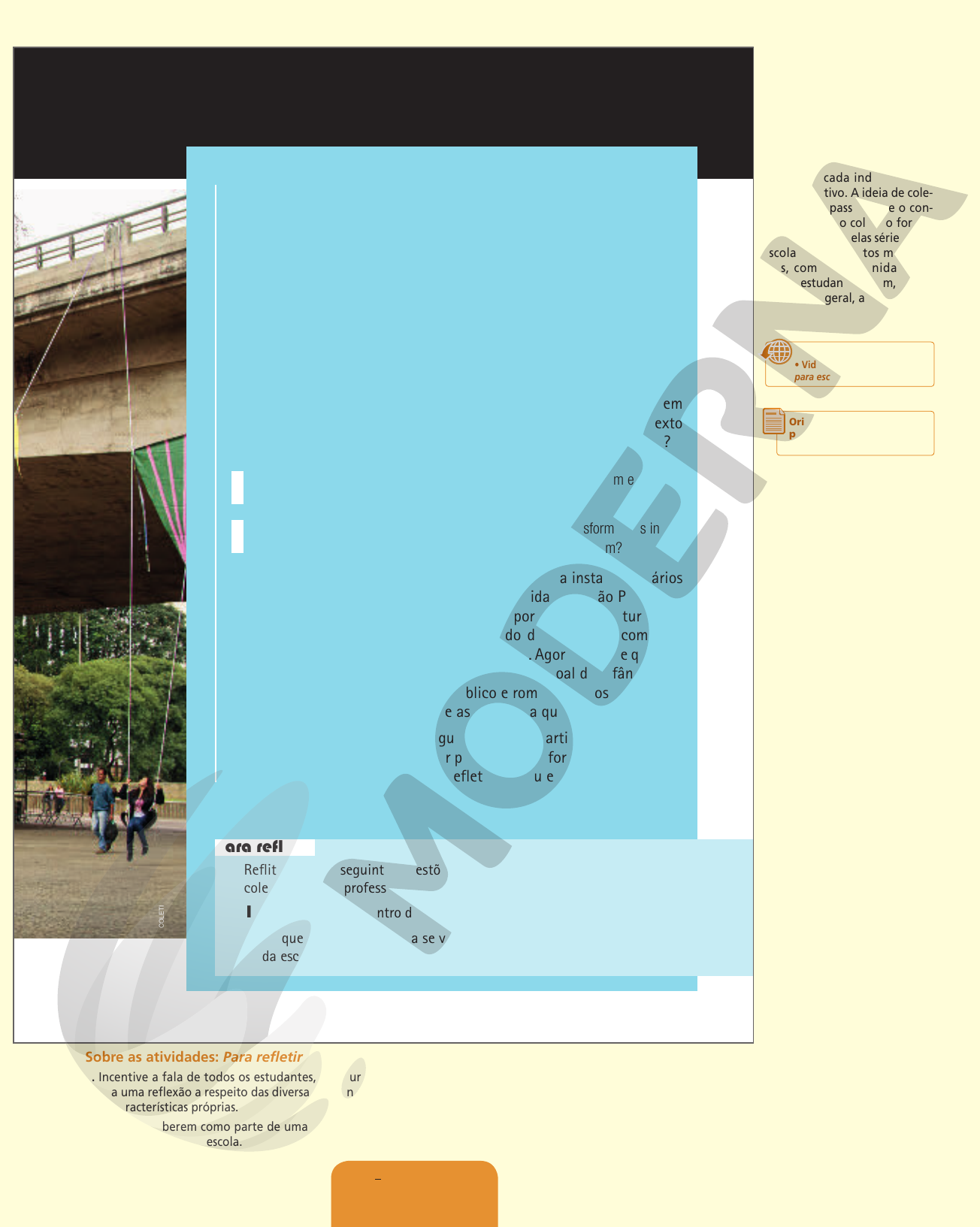 271o BIMESTRE TRANSFORMAÇÕES INDIVIDUAIS, REFLEXOS NO COLETIVO De que modo a arte estimula transformações individuais que se refletem na vida coletiva? Para que transformações aconteçam em um contexto social amplo, é preciso que elas aconteçam também nos indivíduos? Observe a imagem ao lado. O que as pessoas nos balanços parecem estar sen- tindo? Explique. Respostas pessoais. Uma intervenção como a que você vê na imagem sugere transformações indivi- duais ou coletivas? Quais? Como você acredita que elas acontecem? Em 2013, os artistas do coletivo espanhol Basurama instalaram vários balanços em um local histórico no centro da cidade de São Paulo (SP) e convidaram as pessoas que transitavam por lá a se aventurar nos brinquedos, intervindo no cotidiano agitado da metrópole com uma ação geralmente associada ao universo infantil. Agora imagine quantos adultos gostariam de repetir essa experiência pessoal da infância mas não têm coragem de se expor em público e romper com os padrões de comportamento social geralmente associados a quem “já cresceu”! Neste capítulo, ao apresentar algumas obras de artistas contemporâ- neos, convidamos você a vivenciar possíveis transformações internas e a pensar em como elas podem se refletir em seu entorno. 1 2 Reflita sobre as seguintes questões e compartilhe suas respostas com os colegas e com o professor. 1 Como você se vê dentro do coletivo que é a sua turma escolar? 2 De que forma a sua turma se vê inserida em um coletivo maior, dentro da escola? Respostas pessoais. Para refletir C O LE T IV O B A S U R A M A Respostas pessoais. 27 Sobre o capítulo O objetivo deste capítulo é que os estudantes percebam que, ao tratarmos de coletividade, não estamos nos referindo ape- nas aos outros ou a algo exter- no e impessoal. A intenção é promover reflexões acerca do papel que cada indivíduo tem em um coletivo. A ideia de cole- tividade perpassa desde o con- texto escolar (o coletivo forma- do pela turma, pelas séries, pela escola) até contextos mais am- plos, como a comunidade em que os estudantes vivem, ou, de modo mais geral, a sociedade. Sobre as atividades: Para refletir 1. Incentive a fala de todos os estudantes, assegurando que inclusive os mais tímidos se posicionem. Conduza com a turma uma reflexão a respeito das diversas personalidades presentes, que, quando somadas, resultam no coletivo e dão a ele características próprias. 2. Ao se perceberem como parte de uma coletividade, os estudantes podem refletir sobre sua atuação nesse coletivo mais amplo, ou seja, a escola. Orientações para o professor acompanham o Material Digital Audiovisual Material Digital Audiovisual • Video: Co: uma performance para escadas 28 Transformações cotidianas Você vai conhecer a seguir alguns artistas que fizeram de suas obras ou propostas artísticas disparadores para reflexões que buscam transformar o modo de pensar e de agir dos indivíduos em suas atividades cotidianas. As instruções de Yoko Ono PEÇA SANDUÍCHE DE ATUM Imagine mil sóis no céu ao mesmo tempo. Deixe-os brilhar por uma hora. Então, deixe-os gradualmente derreter no céu. Faça um sanduíche de atum e coma-o. 1964, primavera [Traduzido pelos autores desta obra] Leia a tradução do texto na imagem acima. Em seguida, procure seguir a “instru- ção” contida nele. Como você se sentiu realizando essa proposta? A artista japonesa Yoko Ono (1933-) publicou, em 1964, o livro Grapefruit, em que apresenta diversas “instruções” que en- volvem propostas simples e convidam o leitor a ressignificar al- gumas de suas ações corriqueiras. Por que você acha que Yoko Ono criou essas instruções? Resposta pessoal. Quais transformações essas instruções podem provocar no público? 1 Resposta pessoal. 2 3 Resposta pessoal. “T U N A FI SH S A N D W IC H P IE C E” © Y O K O O N O 1 96 4/ 20 18 – T H E G IL B ER T A N D L IL A S IL VE R M A N FL U XU S C O LL EC TI O N G IF T. M U SE U D E A R TE M O D ER N A , N O VA Y O R K 2828 R ep ro du çã o pr oi bi da . A rt. 1 84 d o C ód ig o P en al e L ei 9 .6 10 d e 19 d e fe ve re iro d e 19 98 . Nesta seção, são apresentados artistas contemporâneos que se inspiram em ações cotidianas em suas produções. Unidades temáticas da BNCC: Artes visuais; Dança; Artes inte- gradas. Objetos de conhecimento: Contextos e práticas; Materia- lidades; Elementos da lingua- gem; Processos de criação; Arte e tecnologia. Habilidades em foco nesta seção: (EF69AR01) Pesquisar, apre- ciar e analisar formas distintas das artes visuais tradicionais e contemporâneas, em obras de artistas brasileiros e estrangei- ros de diferentes épocas e em diferentes matrizes estéticas e culturais, de modo a ampliar a experiência com diferentes con- textos e práticas artístico-visuais e cultivar a percepção, o imagi- nário, a capacidade de simboli- zar e o repertório imagético. (EF69AR02) Pesquisar e anali- sar diferentes estilos visuais, contextualizando-os no tempo e no espaço. (EF69AR04) Analisar os ele- mentos constitutivos das artes visuais (ponto, linha, forma, di- reção, cor, tom, escala, dimen- são, espaço, movimento etc.) na apreciação de diferentes produ- ções artísticas. (EF69AR05) Experimentar e analisar diferentes formas de expressão artística (desenho, pintura, colagem, quadrinhos, dobradura, escultura, modela- gem, instalação, vídeo, fotogra- fia, performance etc.). (EF69AR09) Pesquisar e analisar diferentes formas de expressão, representação e encenação da dança, reconhecendo e apre- ciando composições de dança de artistas e grupos brasileiros e es- trangeiros de diferentes épocas. (EF69AR10) Explorar elementos constitutivos do movimento co- tidiano e do movimento dança- do, abordando, criticamente, o desenvolvimento das formas da dança em sua história tradicio- nal e contemporânea. (EF69AR14) Analisar e experi- mentar diferentes elementos (figurino, ilumin