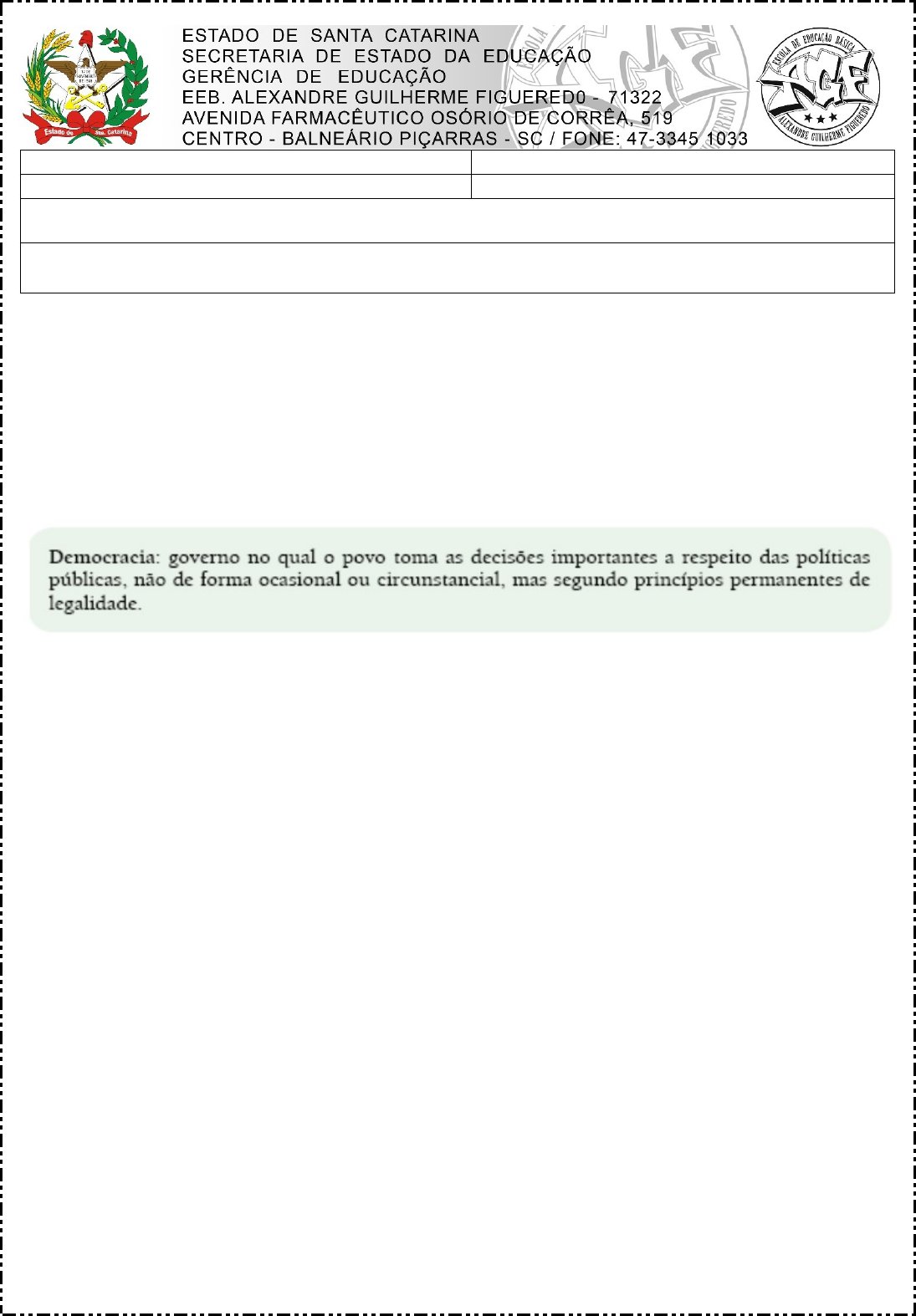 DISCIPLINA: SOCIOLOGIA TURMA: 3ano4 Professor: Aldo Cândido Atividade14: 17 a 24/06/2024 Nome do (a) aluno (a): Maria Eduarda Reck Data da atividade devolvida: __21__/__06__/2024. Olá, estudante! Para ajudar em seus estudos, leia o enunciado abaixo e em seguida responda a atividade: ______________________________________________________________________________________ ATIVIDADE: Responda ao que se pede. O conceito de democracia apresentado acima se relaciona diretamente com a prática de: a) ( ) Unidade sindical b) ( ) Socialização da riqueza c) ( ) Estabilidade constitucional d) ( X ) Autodeterminação das minorias image1.jpeg image2.png