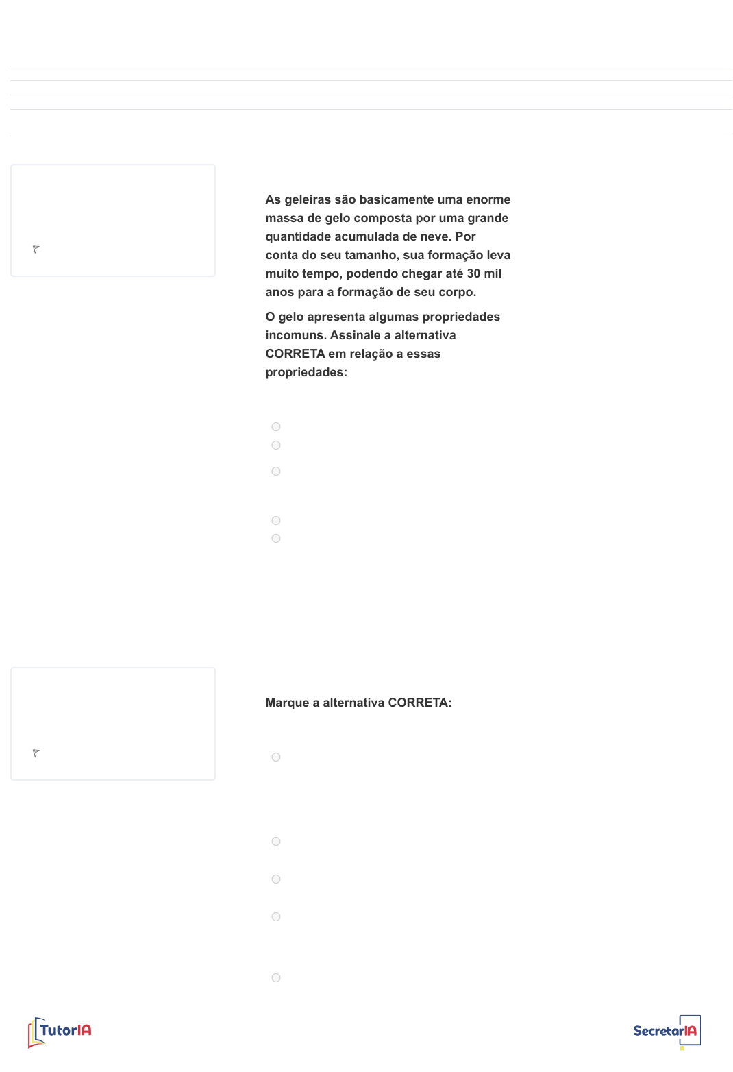 QUESTÃO Não respondido Vale 1,0 ponto(s). Marcar questão QUESTÃO Não respondido Vale 1,0 ponto(s). Marcar questão Iniciado em domingo, 23 jun. 2024, 20:25 Estado Finalizada Concluída em domingo, 23 jun. 2024, 21:25 Tempo empregado 1 hora Avaliar 0,0 de um máximo de 10,0(0%) 1 As geleiras são basicamente uma enorme massa de gelo composta por uma grande quantidade acumulada de neve. Por conta do seu tamanho, sua formação leva muito tempo, podendo chegar até 30 mil anos para a formação de seu corpo. O gelo apresenta algumas propriedades incomuns. Assinale a alternativa CORRETA em relação a essas propriedades: Escolha uma opção: a. O gelo é mais denso do que a água. b. Sua temperatura de fusão é extremamente alta. c. O gelo é constituído exclusivamente por moléculas de água, a qual é formada por um átomo de oxigênio ligado covalentemente a dois átomos de hidrogênio. d. A densidade do gelo é de 0,99 g/cm³. e. O gelo é muito mais forte do que a maioria das rochas. A resposta correta é: O gelo é constituído exclusivamente por moléculas de água, a qual é formada por um átomo de oxigênio ligado covalentemente a dois átomos de hidrogênio. 2 Marque a alternativa CORRETA: Escolha uma opção: a. A facilidade de um poluente atingir a água subterrânea aumenta com a presença da matéria orgânica no solo local. A matéria orgânica no solo tem grande capacidade de absorver uma gama variada de metais pesados e moléculas orgânicas, protegendo a água subterrânea deles. b. Os aquíferos confinados ou semiconfinados são mais vulneráveis à contaminação por poluentes do que os freáticos. c. As fontes de poluição que atingem as águas subterrâneas podem ser pontuais, lineares ou difusas. d. O único problema causado pela superexplotação das águas subterrâneas é o risco de exaurir o aquífero, obrigando a abertura de um novo poço em outro local para atender a demanda por água. e. As águas subterrâneas não têm grande alcance social, pois não podem ser usadas para consumo humano por apresentarem nível de contaminação, em geral, maior que o das águas superficiais. QUESTIONÁRIO Avaliação Final https://api.whatsapp.com/send?phone=5511978370544 https://api.whatsapp.com/send?phone=5511978370544 QUESTÃO Não respondido Vale 1,0 ponto(s). Marcar questão QUESTÃO Não respondido Vale 1,0 ponto(s). Marcar questão QUESTÃO Não respondido Vale 1,0 ponto(s). A resposta correta é: As fontes de poluição que atingem as águas subterrâneas podem ser pontuais, lineares ou difusas. 3 Algumas fontes de energia pouco exploradas podem, no futuro, ser a solução para a questão energética brasileira. Elas são as apostas do Proinfa (Programa de Incentivo às Fontes Alternativas), iniciativa de 2002 do governo brasileiro. Nesse programa, tem destaque: Escolha uma opção: a. A energia eólica, por ser a mais barata e a mais limpa, mas causando grande impacto ambiental. b. O biodiesel, produzido de plantas como o dendê, a mamona, a soja, o babaçu, o amendoim e o algodão, que terá como grandes vantagens a redução da poluição e a economia no uso do petróleo. c. A energia da biomassa gerada pela queima de material orgânico que tem como grande vantagem a produção de lenha, graças às extensas áreas florestais brasileiras. d. O gás natural, que pode ser aproveitado de várias maneiras, e o fato de o Brasil possuir autossuficiência em sua produção, graças aos poços da Bacia de Santos. e. A energia solar, que é a mais renovável de todas, de mais fácil aproveitamento, tendo como desvantagem a poluição que causa. A resposta correta é: O biodiesel, produzido de plantas como o dendê, a mamona, a soja, o babaçu, o amendoim e o algodão, que terá como grandes vantagens a redução da poluição e a economia no uso do petróleo. 4 Assinale a alternativa verdadeira: Escolha uma opção: a. As marés, geradas pela atração gravitacional da água dos oceanos pela Lua e pelo Sol não são capazes de transportar sedimentos. b. As crostas oceânicas são criadas nas dorsais mesoceânicas em que as placas se chocam. c. As ondas são geradas por movimentos tectônicos e a medida que se aproximam da costa arrebentam na zona de surfe. d. A refração das ondas resulta em correntes longitudinais e em deriva litorânea. e. Os processos geológicos predominantes nas bacias oceânicas são a deformação, intemperismo e a erosão. A resposta correta é: A refração das ondas resulta em correntes longitudinais e em deriva litorânea. 5 É inegável que a construção civil desempenha um papel importantíssimo no desenvolvimento do país. Por outro https://api.whatsapp.com/send?phone=5511978370544 https://api.whatsapp.com/send?phone=5511978370544 Marcar questão lado, também é inquestionável que as obras produzem um volume enorme de resíduos sólidos de construção e demolição (RSCD). A reciclagem e o reaproveitamento de RSCD é uma forma racional de minimizar os impactos ambientais decorrentes das obras civis, além de agregar valor à própria edificação. O cimento betuminoso usinado a quente (CBUQ) é um produto derivado do petróleo, o qual tem aplicações nas obras de pavimentação urbana. Sobre o CBUQ é correto afirmar que: I. Agregados miúdos (areia) e graúdos (brita) são misturados com um ligante CAP (cimento asfáltico do petróleo) para formar o CBUQ. II. A reciclagem de CBUQ é feita com a reutilização de material fresado, que são misturados com ligantes asfálticos novos e, se necessário, também são acrescentados agregados novos, emulsões asfálticas e até cimento Portland. III. A reciclagem de CBUQ só é possível nos casos de fresagem profunda, a qual promove boa aderência do CAP; ao passo que não há aderência do material reciclado se a fresagem for rasa. Está(ão) correta(s) a(s) afirmativa(s): Escolha uma opção: a. I e III. b. I e II. c. II e III. d. I, II e III. e. Apenas a I. A resposta correta é: I