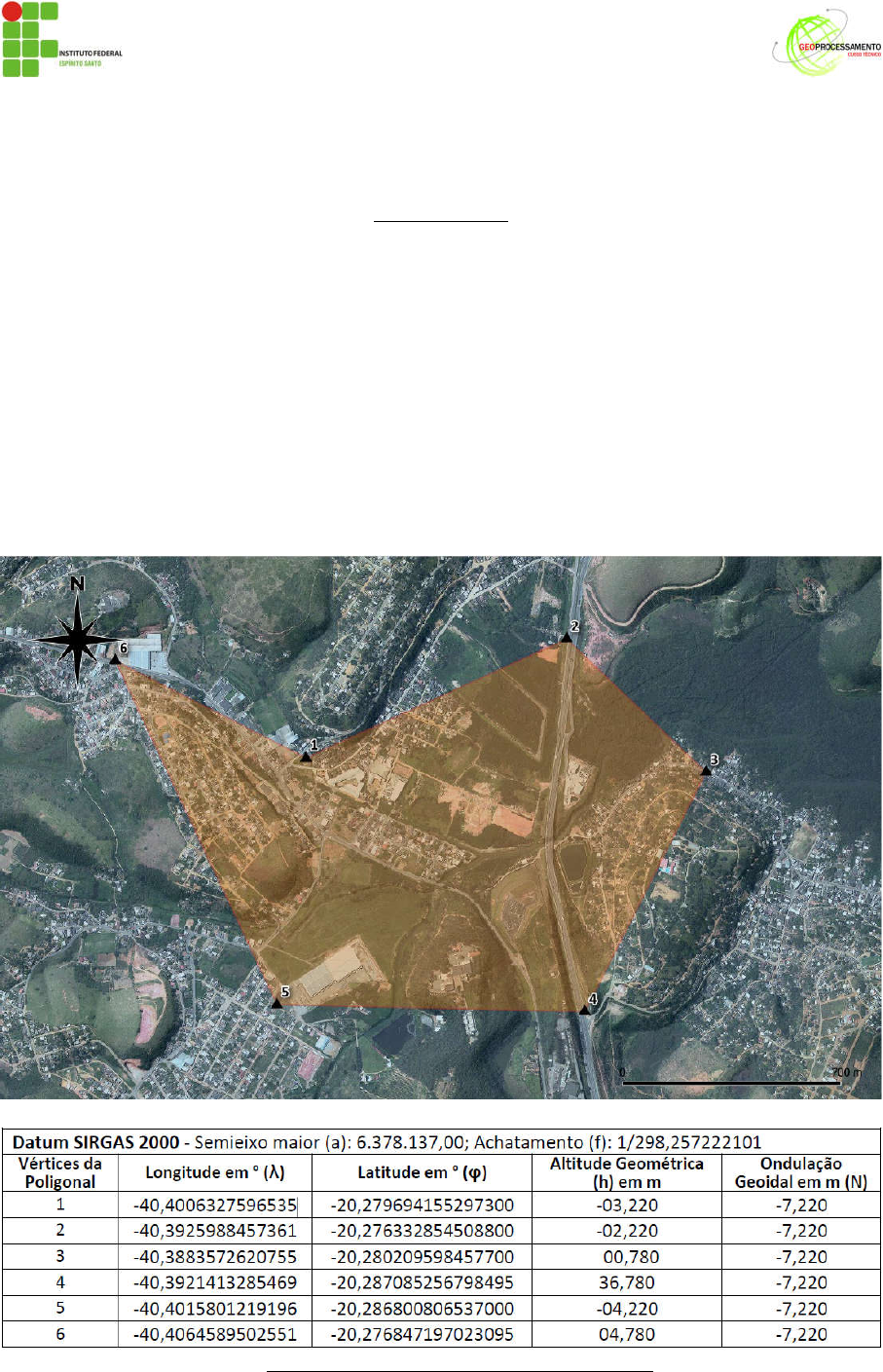 INSTITUTO FEDERAL DE EDUCAÇÃO, CIÊNCIA E TECNOLOGIA DO ESPÍRITO SANTO CURSO TÉCNICO EM GEOPROCESSAMENTO Geodésia Geométrica e Espacial – PGGEO1 Módulo 4. Coordenadas Cartesianas e Elipsoidais Trabalho Prático Prof. Wimerson Sanches Bazan Aluno: RAMIRO MOREIRA SILVA JUNIOR Trabalho Prático (30 pts) Objetivo: Compreender e aplicar os conceitos de relacionados aos principais sistemas de coordenadas adotados em Geodésia, calculando transformações de coordenadas de Datum. 1. IMPLEMENTAÇÃO DOS PROCEDIMENTOS PARA TRANSFORMAÇÃO DE COORDENADAS E DATUM A poligonal da figura abaixo possui 6 vértices cujas coordenadas geodésicas (λ, φ, h) são fornecidas em uma tabela, em graus decimais, referenciadas ao Datum SIRGAS 2000. Cada vértice possui um valor de ondulação geoidal (N) interpolado via Qgis, com base no modelo geoidal MAPGEO 2015. Com base nos dados fornecidos, apresente todos os passos e cálculos utilizados para responder às questões abaixo, na forma de relatório técnico: 1.1) Calcular e apresentar as coordenadas em graus sexagesimais, além da altitude elipsoidal (H) dos vértices de 1 a 6 (apresente os resultados em uma tabela). Longitude (λ) Latitude (φ) Vértices da Poligonal ° ' " ° ' " Altitude Ortométrica em m (H) 1 -40 24 2,278 -20 16 46,899 4,000 2 -40 23 33,356 -20 16 34,798 5,000 3 -40 23 18,086 -20 16 48,755 8,000 4 -40 23 31,709 -20 17 13,507 44,000 5 -40 24 5,688 -20 17 12,483 3,000 6 -40 24 23,252 -20 16 36,650 12,000 Memória de Cálculo: Para o Vértice 1, temos: Longitude (λ): -40,4006327596535 → - 40° 24′ 2,278′′ Latitude (φ): -20,279694155297300 → - 20° 16' 46,899" Altitude Geométrica (h): -3,22 m Ondulação Geoidal (N): -7,22 m Altitude Ortométrica (H) → H = h - N → H = -3,22 - (-7,22) → H = 4,00 m 1.2) Com vistas ao SIRGAS 2000, calcular os valores da primeira excentricidade ao quadrado (e2) e segunda excentricidade ao quadrado (e’2). SIRGAS 2000 SAD-69 e2 = 0,006694380023 e2 = 0,006694541855 e'2 = 0,006739496775 e'2 = 0,006739660796 1.3) Calcule o raio de curvatura da seção normal primeiro vertical (N), pequena normal (N’) e raio de curvatura da seção meridiana (M) para os 6 vértices da poligonal. Calcule o raio médio de curvatura (R) para os 6 vértices e identifique a maior diferença encontrada entre os raios médios calculados tomando como referência aquele calculado para o primeiro vértice. Na sua opinião, essa diferença é significativa? Se sim, fundamente o seu argumento com base nos resultados encontrados e nos conceitos vistos em aula sobre a influência da curvatura terrestre (apresente os resultados em uma tabela). Vértices da Poligonal N N' M R Diferenças em m 1 6380703,265 6337988,412 6343089,661 6361868,665 0,000 2 6380702,450 6337987,603 6343087,229 6361867,039 1,626 3 6380703,390 6337988,537 6343090,033 6361868,914 -0,249 4 6380705,058 6337990,194 6343095,008 6361872,240 -3,576 5 6380704,989 6337990,125 6343094,803 6361872,103 -3,438 6 6380702,574 6337987,727 6343087,601 6361867,288 1,377 A maior diferença encontrada entre os raios médios foi no ponto 4 onde o valor foi de -3,576 m. 1.4) Converta as coordenadas dos seis vértices para o sistema cartesiano geocêntrico (X, Y, Z), referenciadas ao mesmo Datum SIRGAS 2000 (apresente os resultados em uma tabela). Vértices da Poligonal X Y Z 1 4557895,016 -3879159,507 -2196766,192 2 4558537,840 -3878604,551 -2196417,480 3 4558713,806 -3878172,514 -2196821,105 4 4558282,404 -3878324,466 -2197547,574 5 4557622,464 -3879057,487 -2197503,820 6 4557589,428 -3879698,633 -2196473,319 Memória de Cálculo: Para o Vértice 1, temos: X = (N + h). cos (�) . Cos (λ) X = (6380703,265 + (−3,22)) . cos (-20,279694155297300) . cos (-40,4006327596535) X = 4557895,016 Y = (N + h). cos (�) . sen (λ) Y = (6380703,265 + (-3,22)) . cos (-20,279694155297300) . sen (-40,4006327596535) Y = -3879159,507 Z = [N (1 - e²) + h] . sen(�) Z = [6380703,265 . (1 - 0,006694380023) + (-3,22)] . sen (-20,279694155297300) Z = -2196766,192 1.5) Demonstre que os 6 vértices da poligonal, cujas coordenadas cartesianas geocêntricas foram calculadas no exercício 4), pertencem de fato ao elipsoide SIRGAS 2000. Vértices da Poligonal (X²/a²)+(Y²/a²)+(Z²/b²) = 1 1 1,000 2 1,000 3 1,000 4 1,000 5 1,000 6 1,000 1.6) Com base nas coordenadas calculadas no exercício 4, converta as coordenadas e o Datum de referência dos 6 vértices, de modo que passem a ser referenciadas ao sistema de coordenadas geodésicas (λ, φ, h) e Datum SAD-69 (apresente os resultados em uma tabela). Transf. de Datum DX DY DZ SIRGAS 2000 -> SAD-69 67,350 -3,880 38,220 Vértices da Poligonal X (SAD-69) Y (SAD-69) Z (SAD-69) λ (SAD-69) radianos φ (SAD-69) radianos h (SAD-69) 1 4557962,366 -3879163,387 -2196727,972 -0,7051172620188 -0,3539389032535 11,073 2 4558605,190 -3878608,431 -2196379,260 -0,7049770451772 -0,3538802375098 12,082 3 4558781,156 -3878176,394 -2196782,885 -0,7049030160767 -0,3539478989118 15,081 4 4558349,754 -3878328,346 -2197509,354 -0,7049690596405 -0,3540679013029 51,072 5 4557689,814 -3879061,367 -2197465,600 -0,7051337961500 -0,3540629370486 10,066 6 4557656,778 -3879702,513 -2196435,099 -0,7052189474462 -0,3538892149765 19,072 Memória de Cálculo: Para o Vértice 1, temos: DX = 67,350 | DY = -3,880 | DZ = 38,220 Sistema cartesiano Geocêntrico SAD-69 XSAD-69 = XSIRGAS 2000 + DX → XSAD-69 = 4557895,016 + 67,350 → XSAD-69 = 4557962,366 YSAD-69 = YSIRGAS 2000 + DY → YSAD-69 = -3879159,507 + (-3,880) →YSAD-69 = -3879163,387 ZSAD-69 = ZSIRGAS 2000 + DZ = ZSAD-69 = -2196766,192 + 38,220 → ZSAD-69= -2196727,972 1º Distância Horizontal do vértice 1 da poligonal a origem do sistema cartesiano geocêntrico: p = √ (X²SAD-69 + Y²SAD-69) → p = √ (4557962,366² + (-3879163,387²)) → p= 5985225,936 m 2º Latitude reduzida: θ = arctg (ZSAD-69 . a / p . b) θ = arctg (-2196727,972 . 6378160,00 / 5985225,936 . 6356774,719) → θ = -0,352848404689 3º Lat