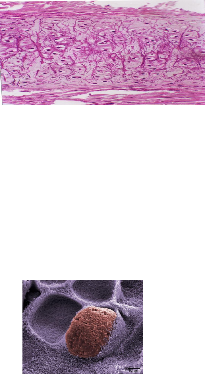 Tecido Cartilaginoso Figura 1 – Tecido Cartilaginoso Elástico O tecido cartilaginoso é um tipo especializado de tecido conjuntivo cuja consistência é rígida. Desempenha a função de suporte de tecidos moles, reveste superfícies articulares, absorvendo choques mecânicos, e diminui o atrito, facilitando o deslizamento dos ossos nas articulações. A cartilagem é essencial para a formação e o crescimento dos ossos longos na vida intrauterina e depois do nascimento. Composição 1. Células Condroblastos (célula jovem) – sua proliferação resulta em crescimento da cartilagem. - Multiplicam-se e formam os condrócitos. Condrócitos – condroblastos maduros circundados por matriz dentro de espaços chamados condroplastos. 2. Material Extracelular Matriz cartilaginosa – composta por colágeno e/ou elastina, proteoglicanos e glicoproteínas multiadesivas. Possui consistência firme, responsável pela turgidez da matriz, devido as ligações eletrostáticas com fibras colágenas, além das moléculas de água presas a glicosaminoglicanas. Pode ser: Interterritorial (entre as células – fibrilas colágeno tipo ll) ou Territorial (cápsula – pobre em colágeno) 3. Pericôndrio É uma camada de tecido conjuntivo denso, responsável por nutrição, oxigenação e eliminação dos refugos metabólicos da cartilagem. Possui vasos sanguíneos e linfáticos, que nutrem o tecido cartilaginoso, avascularizado, através dos capilares do pericôndrio. É a fonte de novos condroblastos. Possuem duas classificações: - Camada profunda: denominada celular ou condrogênica - Camada superficial: denominada fibrosa Pericôndrio Tipos de Cartilagem 1. Hialina É a cartilagem mais abundante no corpo Presente no disco epifisário (crescimento longitudinal do osso) Condrócitos dispostos em fileira (cartilagem seriada) Possuem pericrôndrio Exemplos: Fossas nasais, traqueia e brônquios. Figura 2 – Tecido Cartilaginoso da Traqueia 2. Elástica Possui uma rede de fibras elásticas e fibrilas de colágeno ll São peças isoladas ou associadas à cartilagem hialina O material elástico confere maior elasticidade à cartilagem Possui pericôndrio Exemplos: Pavilhão auditivo, epiglote e laringe Figura 3 – Tecido Cartilaginoso da Orelha 3. Fibrosa Fibras colágenas tipo l constituem feixes Orientação irregular entre os condrócitos ou um arranjo paralelo ao longo dos condrócitos, que dependem das forças que atuam sobre a fibrocartilagem A presença da fibrocartilagem indica a necessidade do local em resistir à compressão e ao desgaste Não possui pericôndrio (as células são nutridas pelo líquido sinovial das cavidades articulares) Exemplos: Discos intervertebrais, sínfise púbica. Figura 4 – Tecido Cartilaginoso do Disco Intervertebral Crescimento da cartilagem Aposicional: Forma uma nova cartilagem a partir das células do pericôndrio. Intersticial: Forma uma nova cartilagem dentro de uma massa de cartilagem preexistente por divisão mitótica. É menos importante e ocorre, na maioria dos casos, apenas nas primeiras fases da vida da cartilagem. A medida que a matriz se torna rígida, a cartilagem cresce somente por aposição. UFF – Universidade Federal Fluminense Curso: Farmácia Aluna: Luísa Nery da Costa Maia Pereira Professora: Ellen Cortez Contreiras Disciplina: Histologia e Embriologia – Turma F1