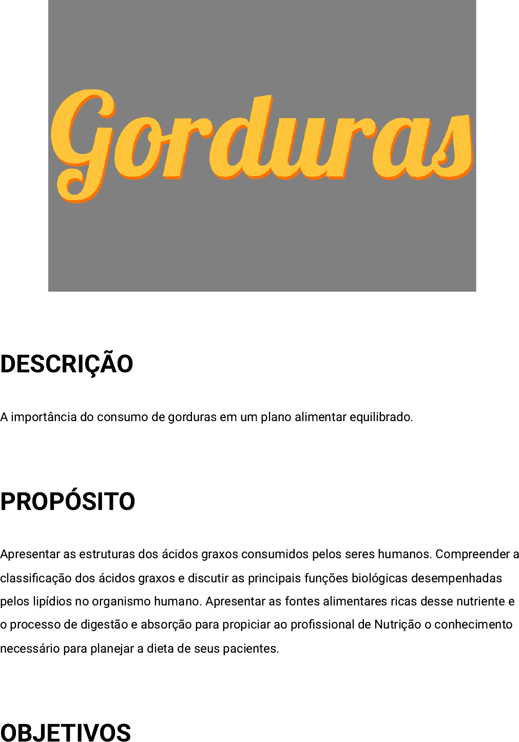DESCRIÇÃO A importância do consumo de gorduras em um plano alimentar equilibrado. PROPÓSITO Apresentar as estruturas dos ácidos graxos consumidos pelos seres humanos. Compreender a classificação dos ácidos graxos e discutir as principais funções biológicas desempenhadas pelos lipídios no organismo humano. Apresentar as fontes alimentares ricas desse nutriente e o processo de digestão e absorção para propiciar ao profissional de Nutrição o conhecimento necessário para planejar a dieta de seus pacientes. OBJETIVOS MÓDULO 1 Definir a estrutura química e a classificação dos lipídios MÓDULO 2 Definir as funções biológicas, as fontes alimentares e a recomendação de consumo dos lipídios MÓDULO 3 Definir o processo de digestão e absorção dos lipídios, destacando o metabolismo das lipoproteínas, a lipólise, a betaoxidação e a formação de corpos cetônicos na geração de energia INTRODUÇÃO Os alimentos fazem parte da rotina diária dos indivíduos. Cada grupo alimentício fornece nutrientes com funções diferentes para o funcionamento do organismo. Conheceremos um pouco mais sobre as gorduras, fazendo uma apresentação da composição química e descrevendo suas funções biológicas, classificações, importâncias nutricionais e fontes alimentares. Vamos compreender o processo de digestão no trato gastrointestinal, no transporte e na absorção dos lipídios no organismo e como ocorre a utilização dos ácidos graxos no metabolismo energético. MÓDULO 1 � Definir a estrutura química e a classificação dos lipídios CONTEXTUALIZAÇÃO A gordura é o macronutriente com mais energia disponível por porção de alimento. Ela está muito bem distribuída nos alimentos, tanto nos de origem vegetal quanto animal, e é necessária para compor as quilocalorias totais (Kcal) fornecidas pela dieta para o metabolismo corporal. As gorduras também são conhecidas como: GRAXAS OU LIPÍDIOS LIPÍDIOS Palavra derivada do termo grego lipos , que significa gordura. Basicamente, os lipídios são substâncias orgânicas, com composição química similar a dos demais macronutrientes, ou seja, com presença de carbono (C), hidrogênio (H) e oxigênio (O) na molécula, que, no entanto, não se solubiliza facilmente em água. Os lipídios são considerados densos energeticamente, pois em cada grama (g) apresentam mais do que o dobro das kcal observadas na mesma quantidade de carboidratos e proteínas e fornecem algumas substâncias essenciais para adequada nutrição corporal. � ATENÇÃO A estrutura química determina a classificação dos lipídios, e o processo digestivo difere bastante do que foi observado para os demais nutrientes, visto que nesse caso estamos lidando com uma substância de baixa solubilidade em água. Além de exercerem função energética, as gorduras são transportadoras de substâncias solúveis em lipídios, como as vitaminas A, D, E e K e são precursoras de hormônios importantes para o funcionamento normal do organismo humano. No entanto, devido ao seu potencial para fornecer energia, o consumo excessivo de lipídios está associado ao acúmulo de tecido adiposo, culminando no aumento do peso corporal, e ao desenvolvimento de doença cardiovascular (DCV). Por isso, esse nutriente faz parte da dieta adequada e as recomendações atuais preconizam uma ingestão entre 25 a 30% do valor energético total (IOM, 2005). ESTRUTURA QUÍMICA E CLASSIFICAÇÃO DOS LIPÍDIOS As gorduras apresentam composição química similar aos carboidratos, devido à presença de carbono, hidrogênio e oxigênio na molécula. No entanto, são diferenciadas por um número distinto de átomos e diferentes ligações na cadeia. � SAIBA MAIS A quantidade de átomos de hidrogênio para cada átomo de oxigênio em uma cadeia de carboidratos é representada em uma razão 2:1, respectivamente, ou seja, para cada átomo de oxigênio na cadeia serão observados 2 átomos de hidrogênio. Isso se mantém constante. No caso dos lipídios, há uma maior proporção de hidrogênios na cadeia, como pode ser observado na forma genérica de um lipídio comum conhecido como estearina (C57H110O6). O termo lipídio representa um grupo bastante heterogêneo de substâncias como: Imagem: Shutterstock.com Óleos (que são substâncias encontradas no estado líquido quando expostas à temperatura ambiente). Imagem: Shutterstock.com Gorduras (substâncias encontradas no estado sólido em temperatura ambiente). Imagem: Shutterstock.com Ceras Imagem: Shutterstock.com Outros compostos derivados de lipídios. A classificação de um lipídio vai variar de acordo com a sua forma, seu tamanho da cadeia de hidrocarbonetos, seu grau de saturação e sua hidrogenação da cadeia. � OS LIPÍDIOS PODEM SER DIVIDIDOS EM TRÊS GRUPOS PRINCIPAIS: LIPÍDIOS SIMPLES, LIPÍDIOS COMPOSTOS E LIPÍDIOS DERIVADOS OU VARIADOS. (MCARDLE, 2019) LIPÍDIOS SIMPLES Esse grupo é formado basicamente pelos triacilgliceróis (conhecidos popularmente como triglicerídeos) que são as substâncias formadas para armazenar gordura nos adipócitos, como são conhecidas as células que compõem o tecido adiposo. Um triacilglicerol é formado pela união de dois grupos distintos: GLICEROL Formado por três moléculas de carbono. ÁCIDOS GRAXOS Que são três cadeias carbônicas que se ligam ao glicerol e recebem o nome de ácido devido à presença de um grupo carboxila em uma extremidade -COOH. METIL Em geral apresenta ainda um grupo na outra extremidade (CH3). Imagem: Nothingserious / Wikimedia Commons / Public domain � Representação gráfica de um triacilglicerol O grupo glicerol isolado não é considerado uma gordura, pois é altamente solúvel em água e não participa diretamente do processo de geração de energia, mas serve de substrato para gliconeogênese. � Os ácidos graxos são considerados unidades mais básicas de um lipídio e são substratos para o processo de geração de energia celular. S