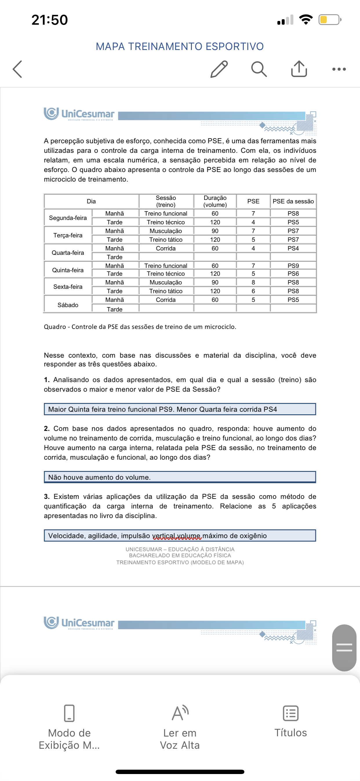 21:50 MAPA TREINAMENTO ESPORTIVO UniCesumar A percepção subjetiva de esforço, conhecida como PSE, é uma das ferramentas mais utilizadas para o controle da carga interna de treinamento. Com ela, os indivíduos relatam, em uma escala numérica, a sensação percebida em relação ao nível de esforço. quadro abaixo apresenta o controle da PSE ao longo das sessões de um microciclo de treinamento. Sessão Dia Duração PSE PSE da sessão (treino) (volume) Manhã Treino funcional 60 7 PS8 Segunda-feira Tarde Treino técnico 120 4 PS5 Manhã Musculação 90 7 PS7 Terça-feira Tarde Treino tático 120 5 PS7 Manhã Corrida 60 4 PS4 Quarta-feira Tarde Manhã Treino funcional 60 7 PS9 Quinta-feira Tarde Treino técnico 120 5 PS6 Manhã Musculação 90 8 PS8 Sexta-feira Tarde Treino tático 120 6 PS8 Manhã Corrida 60 5 PS5 Sábado Tarde Quadro Controle da PSE das sessões de treino de um microciclo. Nesse contexto, com base nas discussões e material da disciplina, você deve responder as três questões abaixo. 1. Analisando os dados apresentados, em qual dia e qual a sessão (treino) são observados o maior e menor valor de PSE da Sessão? Maior Quinta feira treino funcional PS9. Menor Quarta feira corrida PS4 2. Com base nos dados apresentados no quadro, responda: houve aumento do volume no treinamento de corrida, musculação e treino funcional, ao longo dos dias? Houve aumento na carga interna, relatada pela PSE da sessão, no treinamento de corrida, musculação e funcional, ao longo dos dias? Não houve aumento do volume. 3. Existem várias aplicações da utilização da PSE da sessão como método de quantificação da carga interna de treinamento. Relacione as 5 aplicações apresentadas no livro da disciplina. Velocidade, agilidade, impulsão vertical máximo de oxigênio UNICESUMAR EDUCAÇÃO À DISTÂNCIA BACHARELADO EM EDUCAÇÃO FÍSICA TREINAMENTO ESPORTIVO (MODELO DE MAPA) UniCesumar A" - Modo de Ler em Títulos Exibição M... Voz Alta
