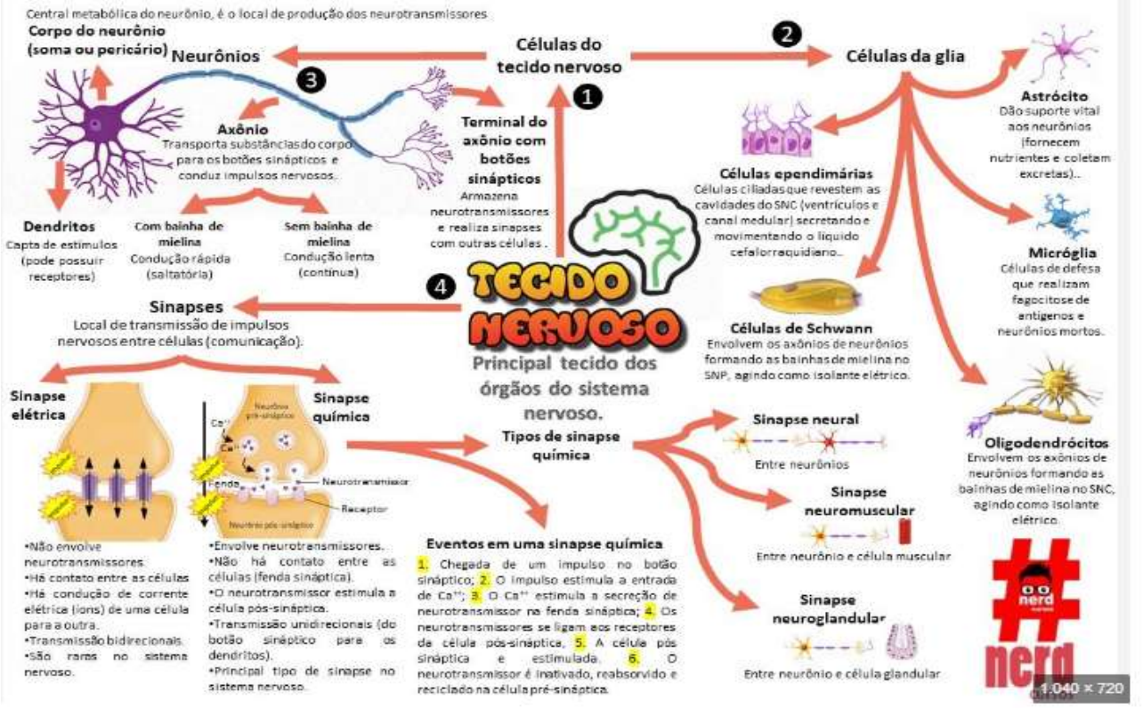 MAPA MENTAL – TECIDO NERVOSO ROTEIRO DE ESTUDOS – NEURÔNIO Nesta imagem A destaca-se um grande neurônio multipolar. Do corpo celular, também chamado pericárdio, saem vários prolongamentos (dendritos ou axônio – identificados como prolongamentos do neurônio). O núcleo do neurônio se situa no centro do pericário, sendo grande e esférico. A cromatina é frouxa e no interior do núcleo observamos um volumoso nucléolo. Além dos neurônios acima descritos, observa-se uma grande quantidade de núcleos, menores que os dos neurônios, os quais representam as células da neuroglia ou células da glia. A maior parte desta imagem é composta de uma “substância” cor de rosa e que, formada de pequenos filamentos. Trata-se de uma grande quantidade de prolongamentos de neurônios e de células da neuroglia, chamada de Neurópilo. Pelas colorações rotineiras não é possível distinguir os prolongamentos, nem saber a que células pertencem. O tecido nervoso requer muita energia e oxigênio para seu funcionamento e por esta razão é muito vascularizado. A massa de tecido cor de rosa possui grande quantidade de pequenas cavidades que são capilares sanguíneos. Na imagem B, o corpo celular dos neurônios apresenta uma grande quantidade de RNA, também é denominado Substância de Nissl. Observe que estes grânulos aparecem em grumos azuis/arroxeados de diversos tamanhos. Ao microscópio eletrônico de transmissão são reconhecidos como porções de retículo endoplasmático granular. Ambas as imagens foram coradas com hematoxilina e eosina. ROTEIRO DE ESTUDOS – CÉLULAS DA GLIA xxxxxxxxxx