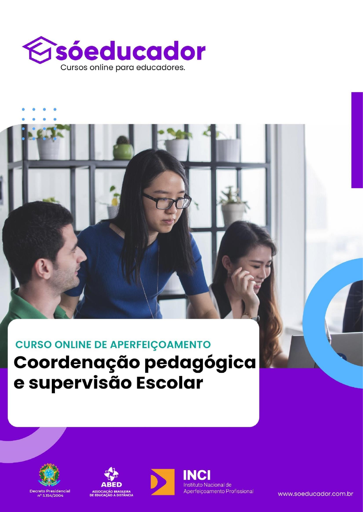 2 www.soeducador.com.br Coordenação Pedagógica e Supervisão Escolar SUMÁRIO A Escola como Local de Trabalho na Perspectiva da Supervisão Escolar ................ 3 A Atuação do Pedagogo e a Supervisão Escolar ...................................................... 3 Conceituando Coordenação Pedagógica .................................................................. 4 O Papel do Coordenador Pedagógico na Organização da Escola ............................ 8 Perfil e Identidade do Coordenador Pedagógico ...................................................... 11 O Perfil do Coordenador Pedagógico diante das Necessidades da Escola ............. 11 Desenvolvimento das Relações Interpessoais da Escola ........................................ 14 A Atuação do Coordenador Pedagógico na Busca da Autonomia da Escola .......... 16 Projeto de Ação Pedagógica/Planejamento Educacional ........................................ 16 Conceito de Projeto Político-Pedagógico ................................................................. 19 O Papel da Coordenação Pedagógica na Elaboração do Projeto Político-Pedagógico ................................................................................................................................ 21 A Coordenação Pedagógica na Busca da Qualidade do Ensino ............................. 24 Conceituando Qualidade do Ensino ......................................................................... 24 O Coordenador Pedagógico e a Formação Continuada ........................................... 30 A Avaliação como Elemento Indispensável da Ação Coordenativa ......................... 33 REFERÊNCIAS: ...................................................................................................... 38 A Escola como Local de Trabalho na Perspectiva da Supervisão Escolar A Atuação do Pedagogo e a Supervisão Escolar Vamos conhecer as muitas atuações do pedagogo dentro da escola. Este profissional, que é antes de tudo, um professor, pode atuar de muitas formas na organização escolar. São muitas as atribuições do pedagogo dentro da escola. Esse profissional, que é primeiramente um professor, pode também atuar como supervisor educacional, orientador educacional e gestor educacional. Na educação atual, há diversas áreas de atuação do pedagogo que têm o mesmo objeto de atuação que é o processo de conhecimento. Essas áreas se articulam dentro do trabalho coletivo na organização escolar e do trabalho pedagógico. A unidade introdutória abordará sucintamente as 3 www.soeducador.com.br Coordenação Pedagógica e Supervisão Escolar várias formas de atuação do pedagogo numa perspectiva do trabalho coletivo na organização escolar. Administração Escolar – Representado pelo Diretor da escola que tem como incumbência envolver toda a comunidade escolar na gestão da escola. Nesse enfoque, o gestor conjuga o compromisso político que o fazer educativo exige com sua própria competência técnica e de todos os agentes educacionais para atender bem a comunidade e promover o ensino de qualidade. O diretor também é o profissional que se responsabiliza pelo cotidiano da escola, gerenciando-a em seus aspectos físicos e humanos. Além disso, o diretor deve buscar sempre o fortalecimento da relação escola-comunidade, buscando fortalecer essa parceria. Orientação Educacional – Representada pelo Orientador Educacional. Segundo Grispum (2003), caracteriza-se como um conjunto articulado e coerente de tarefas e ações que tendem a promover um ensino diversificado e de qualidade, dando atendimento aos diferentes usuários, por meio da promoção das relações interpessoais. Assim, possui um caráter mediador, sendo elo entre a família, aluno e escola, promovendo as relações interpessoais na escola. Finalizando este capítulo, pode-se concluir que é muito grande a responsabilidade do pedagogo, qualquer que seja a sua área de atuação. Por isso, esse profissional deve procurar superar o trabalho fragmentado dentro da escola e promover a qualidade do ensino. Supervisão Escolar/Coordenação Pedagógica – Representada pelo Supervisor Pedagógico ou Coordenador Pedagógico. Também denominada de coordenação pedagógica, a supervisão escolar é um processo técnico-pedagógico que visa alcançar a qualidade do ensino, por meio do domínio dos fundamentos da política educacional e do currículo. Para isso, o coordenador pedagógico deve conhecer e estimular a atuação profissional dos professores, subsidiando-os com apoio técnico e material, acompanhando de perto o desempenho do aluno, verificando a avaliação que acontece na escola. Para Saviani (1985), o pedagogo escolar é aquele que domina sistematicamente e intencionalmente as formas de organização do processo de formação cultural que se dá no interior das escolas. E como especialista deve ter o 4 www.soeducador.com.br Coordenação Pedagógica e Supervisão Escolar domínio das formas pelas quais o saber sistematizado é convertido em saber escolar, tornando-o, transmissível e assimilável na relação entre professor-aluno. E no interior das escolas, o pedagogo deve lembra-se do seu papel, o qual será providenciar uma organização tal que cada criança, cada educando, em especial e os indivíduos das camadas trabalhadoras, não vejam frustrados seus anseios de assimilar os conhecimentos metodológicos, e sim possibilitar um conhecimento, uma cultura que atribua uma nova qualidade às suas lutas no seio da sociedade. Vejamos o que Libâneo (2001) diz a respeito do pedagogo escolar: A atuação do pedagogo escolar é imprescindível na ajuda aos professores no aprimoramento do seu desempenho na sala de aula. [...] na análise e compreensão das situações de ensino com base em conhecimentos teóricos, ou seja, na vinculação entre as áreas do conhecimento pedagógico e o trabalho de sala de aula. Conceituando Coordenação Pedagó