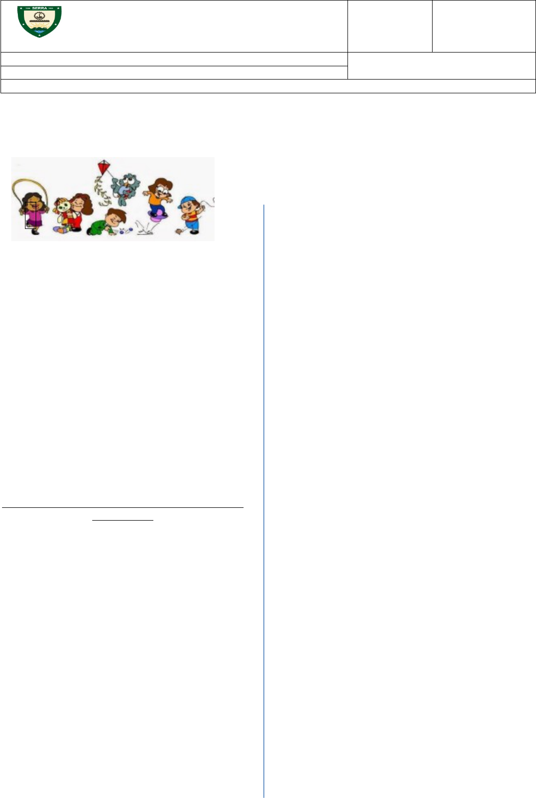 EMEF “ABRAHÃO GOMES DE ARAÚJO” Valor: 5,0 PONTOS Nota alcançada: NOME: PROFESSORA: Data: / / Turma: DISCIPLINA: Educação Física TEMA: BRINQUEDOS, JOGOS E BRINCADEIRAS POPULARES Os brinquedos, jogos e brincadeiras tradicionais surgiram através dos povos que deram origem à nossa civilização. Infelizmente,devido ao crescimento da informatização, a tendência é que muitas brincadeiras tradicionais aos poucos vão perdendo espaço nas preferências das crianças, pois muitas preferem os jogos eletrônicos. Entretanto, é importante destacar que os jogos e os brinquedos possuem um valor muito grande para todos, pois atividades mais manuais são mais benéficas para o nosso corpo, e temos a certeza que o espaço destas atividades está garantido na cultura do Brasil. Vamos agora conhecer algumas brincadeiras bem legais. Estátua Nesta brincadeira, as crianças dançam com uma música ou circulam pela sala e sob o comando do adulto (ao falar: ESTÁTUA!) devem ficar imóveis. Aquele que se mexer e sair da posição de “estátua” deve sair da brincadeira. Carrinho de mão Enquanto a criança coloca as mãos no chão, com os braços estendidos, o adulto (ou outra criança) levanta suas pernas e empurra, como se fosse um carrinho de mão. CONCLUSÃO Brincar é um momento importante para o desenvolvimento das pessoas. Através da brincadeira, a gente aprende e experimenta novas oportunidades para o aperfeiçoamento da linguagem e da habilidade motora. Texto: Tudo Sala de Aula, 2021 ATIVIDADADES SOBRE O QUE VOCÊ APRENDEU 1. O estudo de hoje fala principalmente sobre: a) a cultura do Brasil. b) os jogos eletrônicos. c) os jogos e as brincadeiras. d) as habilidades motoras. 2. Como surgiram os brinquedos, os jogos e as brincadeiras tradicionais? ___________________________________________________________________________________________________________________________ 3. Segundo o texto, por que as brincadeiras tradicionais vão perdendo espaço nas preferências das crianças? ___________________________________________________________________________________________________________________________ 4. Complete de acordo com o texto: Através do brincar, a criança experimenta oportunidades para o aperfeiçoamento da ________________________ e da habilidade ___________________. 5. O que pode levar o participante a sair da brincadeira “estátua”? _________________________________________ 6. Você acha que brincar é mais importante do que jogar no celular? ___________________________________________________________________________________________________________________________ 7. Qual sua brincadeira favorita? __________________________________________________________________________________ image1.png image2.png