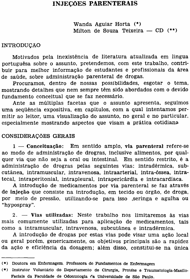 INJEÇÕES PARENTERAIS Wanda Aguiar Horta ( * ) Milton de Souza Teixeira — CD ( * * ) INTRODUÇÃO Motivados pela inexistência de literatura atualizada em lingua portuguesa sobre o assunto, pretendemos, com este trabalho, contri buir para melhor informação de estudantes e profissionais da área de saúde, sobre administração parenteral de drogas. Procuramos, dentro de nossas possibilidades, esgotar o tema, mostrando detalhes que nem sempre têm sido abordados com o devido fundamento conceituai que se faz necessário. Ante as múltiplas facetas que o assunto apresenta, seguimos uma seqüência expositiva, em capítulos, com a qual intentamos per mitir ao leitor, uma visualização do assunto, no geral e no particular, especialmente mostrando aspectos que visam a prática cotidiana CONSIDERAÇÕES GERAIS 1 — Conceituação: Em sentido amplo, via parenteral refere-se ao modo de administração de drogras, inclusive alimentos, por qual quer via que não seja a oral ou intestinal. Em sentido restrito, é a administração de drogras pelas seguintes vias: intradérmica, sub cutánea, intramuscular, intravenosa, intraarterial, intra-óssea, intra- tecal, intraperitonial, intrapleural, intrapericárdia e intracardiaca. A introdução de medicamentos por via parenteral se faz através de injeção que consiste na introdução, em tecido ou órgão, de droga, por meio de pressão, utilizando-se para isso .seringa e agulha ou "hypospray". 2. — Vias utilizadas: Neste trabalho nos limitaremos às vias mais comumente utilizadas para aplicação de medicamentos, tais como a intramuscular, intravenosa, subcutánea e intradérmica. A introdução de drogas por estas vias pode visar uma ação local ou geral porém, genericamente, os objetivos principais são a rapidez da ação e eficiência da dosagem; além disso, constitui-se na única ( * ) Doutora em Enfermagem. Professora de Fundamentos de Enfermagem ( * ) Instrutor Voluntário do Departamento de Cirurgia, Prótese e Traumatologia-Maxilo- Faciais da Faculdade de Odontologia <?& Universidade de São Paulo. maneira de se administrar determinadas drogas que são destruidas pelos sucos digestivos, como é o caso da insulina. 3. Drogas injetadas: Para aplicação por via parenteral, respei tadas as especificidades de cada droga, devem elas, de maneira geral, obedecer às seguintes características: a) serem absolutamente esté reis; b) líquidas; c) isentas de substâncias pirogénicas; d) apresen tarem pH dentro dos limites fisiológicos. 4 — Material utilizado: 4.1 — "Hypospray": É um aparelho manual ou elétrico, conti- tuido de um cilindro de metal com pequena abertura numa das ex tremidades. A droga é colocada neste cilindro e sob forte pressão, o líquido, em forma de micropartículas, é introduzido na pele, sem o auxílio de agulha. Este aparelho é usado para a aplicação de drogas em grande número de indivíduos, como em campanhas de vacinação, tratamentos em massa nas epidemias, etc. Bico Corpo ou cil indro Embolo obeça do embolo F i g . 1 4.2 — Seringas e agulhas: As seringas são constituídas por duas peças: o corpo ou cilindro e o embolo (fig. 1). Podem ser metá licas, de vidro ou plástico. O corpo, numa das extremidades termina em tubo afilado, onde se encaixa a agulha, denominado bico. As agulhas são, em geral, metálicas. Seus comprimentos e cali bres variam segundo as vias utilizadas. Cada agulha possui duas partes: uma porção dilatada, que se encaixa na seringa, o canhão, e a parte afilada, a haste, que termina em bizel (fig. 2 ) ; este pode ser curto ou longo. As agulhas têm suas medidas indicadas no canhão. Há várias escalas como a inglesa, a americana e a francesa. As agulhas fabricadas no Brasil, têm comprimento e calibre indicados -Biztl -Hasta C o n h õ o Fig. 2 em milímetros; p. ex., a medida 25x8 significa 25 mm de comprimen to por 8/10 de milímetro de diâmetro. 4.2.1 — Condições para uso: Para que a injeção surta efeito, é necessário que o material tenha as seguintes características: a) seja absolutamente estéril (do princípio ao fim da aplicação devem ser mantidos livres de contaminação as seguintes partes do material: a haste da agulha, interna e externamente, a face interna do corpo da seringa e o bico interna e externamente e todo o corpo do embolo em* contato com a face interna do corpo da seringa); b) apresente en caixe perfeito dos componentes da seringa e, nela, da agulha; c) seja material íntegro, isento de rachaduras, de pedaços com reparos grosseiros e de hastes tortas ou sinuosas das agulhas; d) apresente bizel afiado. 4.3 — Material acessório: Para serrarmos uma ampola podemos utilizar pequenas serras metálicas, previamente desinfetadas com álcool ou água e sabão, ou serras de cartolina com esmeril. Estas após o uso, devem ser guardadas em recipientes fechado. O gargalo das ampolas será limpo antes de quebrado, para evitar que fragmen tos do esmeril caiam no seu interior, no ato da abertura. O algodão usado para a antissepsia da pele deve ser hidrófilo e conservado em recipiente limpo e tampado. Para as endovenosas utiliza-se garrote (tira elástica) que deve ser de borracha flexível, levemente áspera, afim de que, por atrito, se mantenha firme em contato com a pele. O comprimento ideal é de 35 a 45 cm. 4.4. —• Apresentação de material: São muito variadas as formas de apresentação, motivo pelo qual nos limitaremos à descrição das principais. 4.4.1 — Material descartável: Seringas e agulhas de plásticos já vêm montadas e esterilizadas, não oferecendo problemas, desde que se obedeça rigorosamente às normas de assepsia ao manipulá-las. 4.4.2 — Material fervido: Dentro de um rigoroso conceito de assepsia, este material não é considerado estéril, mesmo que ferva durante o tempo médio de 30 minutos, mínimo necessário para a des truição de virus resistentes ao calor, como os da hepatite; o material é considerado des