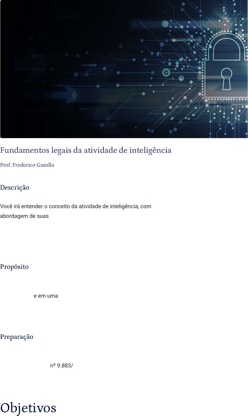 Fundamentos legais da atividade de inteligência Prof. Frederico Gazolla Descrição Você irá entender o conceito da atividade de inteligência, com abordagem de suas características conforme a Constituição Federal, como a atividade de inteligência se estrutura no Brasil e no mundo, seus impactos na atividade pública e privada e os impactos das leis de proteção de privacidade pessoal sobre a atividade de inteligência. Propósito A atividade de inteligência é essencial para as ações de segurança, principalmente em uma perspectiva preventiva. Compreender os contornos e limites legislativos é fundamental para uma atividade de inteligência segura e válida. Preparação Antes de iniciar seus estudos, tenha em mãos a Constituição Federal de 1988 e acesso à Lei nº 9.883/1999. Também é recomendável ter acesso ao Marco Civil da Internet e à Lei Geral de Dados Pessoais. Objetivos Módulo 1 A atividade de inteligência Reconhecer o conceito de atividade de inteligência e sua relação com o ordenamento jurídico. Módulo 2 As agências de inteligência Aplicar o conceito de inteligência na criação das agências de inteligência. Módulo 3 Proteção da privacidade Analisar os principais conceitos legais correlatos à atividade de inteligência. Introdução A atividade de inteligência desempenha papel fundamental na segurança nacional e no desenvolvimento estratégico do Brasil. A Agência Brasileira de Inteligência (Abin) é responsável por produzir e disseminar informações estratégicas para o governo, seguindo rigorosamente princípios legais estabelecidos na Constituição Federal de 1988 e na Lei nº 9.883/1999. A legislação brasileira assegura que a atividade de inteligência deve ser conduzida dentro dos limites da lei, respeitando os direitos fundamentais dos cidadãos e a privacidade, proibindo discriminação e violação dos direitos humanos. A atividade de inteligência no Brasil visa proteger o país contra ameaças internas e externas, como terrorismo, crime organizado e espionagem, colaborando com outros órgãos de segurança e defesa para tomar decisões governamentais informadas. Em resumo, a inteligência desempenha papel crucial na segurança e no desenvolvimento do Brasil, sempre mantendo o respeito aos direitos humanos e dentro dos limites legais. Analisaremos a evolução histórica do conceito de atividade de inteligência em cenário global e sua regulação conforme os comandos da Constituição Federal de 1988. Material para download Clique no botão abaixo para fazer o download do conteúdo completo em formato PDF. Download material 1 - A atividade de inteligência Ao �nal deste módulo, você será capaz de reconhecer o conceito de atividade de inteligência e sua relação com o ordenamento jurídico. javascript:CriaPDF() O que é atividade de inteligência? Uma atividade de inteligência é um processo sistemático de coleta, análise e disseminação de informações relevantes e sigilosas para orientar decisões estratégicas e políticas. Seu objetivo principal é fornecer insights e compreensão sobre ameaças, oportunidades e tendências, permitindo que governos, organizações e agências tomem medidas informadas para proteger interesses nacionais ou institucionais. A evolução histórica da atividade de inteligência remonta a civilizações antigas, como os egípcios e os romanos, que empregavam espiões para obter informações sobre seus inimigos. No entanto, o desenvolvimento moderno da inteligência ganhou impulso durante as guerras mundiais do século XX, quando os serviços de inteligência se tornaram cruciais para obter vantagem estratégica. Com o avanço da tecnologia, a coleta e análise de informações se tornaram mais sofisticadas, com a crescente utilização de métodos de inteligência eletrônica, vigilância e análise de dados. Exemplo Podemos citar o projeto Echelon, utilizado para monitorar toda a comunicação global. Esse projeto é um sistema de monitoramento, coleta e análise mundial de dados de inteligência, construído pelos cinco Estados signatários do Tratado de Segurança UK-USA (Five Eyes - em inglês). De acordo com Almeida Neto, a atividade de inteligência pode ser definida em três vertentes: É possível definir inteligência como a atividade permanente e especializada de obtenção de dados, produção e difusão metódica de conhecimentos, a fim de assessorar um decisor na tomada de uma decisão, com o resguardo do sigilo, quando necessário para a preservação da própria utilidade da decisão, da incolumidade da instituição ou do grupo de pessoas a que serve. Tal atividade, em sentido amplo, abrange, ainda, a prevenção, detecção, obstrução e neutralização das ameaças (internas e externas) às informações, áreas, instalações, meios, pessoas e interesses a que a organização serve (contrainteligência). (Almeida Neto, 2009. p. 25) As agências de segurança, como agências de inteligência, são fundamentais na coleta de informações para proteger a segurança nacional e lidar com ameaças à ordem pública. Elas usam atividades de inteligência para monitorar: Organizações terroristas Grupos criminosos Estados adversários Outras ameaças potenciais Isso envolve a coleta de informações por meio de fontes humanas, interceptação de comunicações eletrônicas, vigilância física e análise de dados abertos. As agências de segurança também aplicam a inteligência na tomada de decisões estratégicas, como planejar operações militares, combater o crime organizado, prevenir ataques terroristas e responder a crises. A análise de inteligência ajuda a identificar padrões, prever comportamentos e antecipar ameaças, permitindo que as agências ajam de forma proativa. Atenção! O uso da atividade de inteligência levanta questões éticas e legais relacionadas à privacidade, às liberdades civis e à transparência. O equilíbrio entre a necessidade d