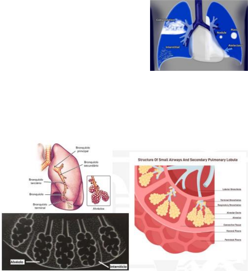 MARIA LAURA R BARROS – MED 108 DIAGNOSTICO POR IMAGEM 1 Lesões hipotransparentes ocupação dos espaços pulmonares, principalmente alvéolos e parênquima pulmonar, por outro material diferente de ar Lesões hipotransparentes / opacidade pulmonar – processos que ocasionam diminuição anormal na transparência de todo ou de parte do pulmão • Atelectasia; • Consolidação; • Doença intersticial; • Nódulos e massas; • Derrame pleural. ANATOMIA FUNCIONAL DO PULMÃO • final de cada bronquíolo terminal termos os alvéolos • o conjunto de alvéolos formam os ácinos • o conjunto de ácinos formam o lóbulo pulmonar secundário • Alvéolos: estruturas localizadas no final dos bronquíolos, responsáveis pela troca gasosa. São “sacos de ar”. • Interstício: tecido de suporte do parênquima pulmonar, composto por tecido conjuntivo, artérias, veias, linfáticos. MARIA LAURA R BARROS – MED 108 DIAGNOSTICO POR IMAGEM 2 ATELECTASIA Corresponde ao colapso de uma parte do pulmão devido a diminuição da quantidade de ar nos alvéolos, resultando em perda de volume e aumento da densidade. Pode ser total, lobar, segmentar ou subsegmentar. SINAIS RADIOLÓGICOS • Aumento da densidade na região atelectasia. • Deslocamento das fissuras em direção a área da atelectasia. • Elevação do hemidiafragma ipsilateral. • +/- Hiperinsuflação compensatória do pulmão não afetado • +/- Deslocamento de estruturas mediastinais. ATELECTASIA DO LÓBULO SUPERIOR DIREITO deslocamento cefálico e medial da pequena fissura e elevação do diafragma ipsilateral MARIA LAURA R BARROS – MED 108 DIAGNOSTICO POR IMAGEM 3 ATELECTASIA DO LÓBULO INFERIOR DIREITO deslocamento da grande fissura É colabamento do pulmão, os alvéolos estão colabados e não há entrada de ar SINAL DO “S” DE GOLDEN • atelectasia do lóbulo superior direito • massa expandindo o hilo pulmonar • o contorno da massa faz um S ao contrário • fissura abaulada Quando se há uma grande atelectasia, todas as estruturas mediastinais e a traqueia puxam para o lado acometido MARIA LAURA R BARROS – MED 108 DIAGNOSTICO POR IMAGEM 4 DIAGNÓSTICOS DIFERENCIAIS 1. PNEUMECTOMIA • pessoa que tirou o pulmão • pulmão funcionante hiperinsuflado • estruturas mediastinais e traqueia desviada para o lado sem pulmão 2. HIPOPLASIA PULMONAR • pessoa nasce com pulmão, mas muito pequeno e sem função • pulmão funcionante hiperinsuflado • estruturas mediastinais e traqueia desviada para o lado sem pulmão 3. AGENESIA • pessoa que nasceu sem pulmão • pulmão funcionante hiperinsuflado • estruturas mediastinais e traqueia desviada para o lado sem pulmão MARIA LAURA R BARROS – MED 108 DIAGNOSTICO POR IMAGEM 5 CONSOLIDAÇÃO É o resultado da substituição de ar nos alvéolos por algum conteúdo líquido (transudados, pus, sangue, células ou outras substâncias) infeccioso ou não. A doença geralmente começa dentro dos alvéolos e se espalha de um alvéolo para o outro. ACHADOS RADIOLÓGICOS Opacidade homogênea mal definida que obscurece os vasos pulmonares Sinal da silhueta – perda de interface de pulmão / tecido mole – o pulmão está tão branco que perdemos a silhueta do coração NÃO DA PARA VER A BORDA CARDIACA MARIA LAURA R BARROS – MED 108 DIAGNOSTICO POR IMAGEM 6 Broncograma aéreo – Brônquio ainda cheio de ar e com uma visão melhor dele Não há perda de volume e não há desvio de estruturas PNEUMONIA LOBAR é causada pela disseminação interalveolar de exsudatos por meio dos poros de Kohn e canais de Lambert. BRONQUIO APARECE POIS AINDA TEM AR DENTRO DELE LINHAS PRETAS MARIA LAURA R BARROS – MED 108 DIAGNOSTICO POR IMAGEM 7 BRONCOPNEUMONIA se dissemina pelas vias aéreas (árvore brônquica) e o aspecto é mais difuso e multifocal que na pneumonia lobar. – Difusa BRONCOPNEUMONIA PNEUMONIA LOBAR MARIA LAURA R BARROS – MED 108 DIAGNOSTICO POR IMAGEM 8 DOENÇA INTERSTICIAL Em um Raio-X de tórax, pode ser muito difícil determinar se há doença pulmonar intersticial e com qual tipo de padrão estamos lidando. Ocorre devido espessamento dos septos interlobulares – linhas muito evidentes O padrão mais comum é reticular. “parece uma rede” DIAGNOSTICO PARA SITUAÇÕES DE DOENÇA INTERSTICIAL • Edema – insuficiência cardíaca descompensada • pneumonia intersticial – mycoplasma • linfangite carcinomatosa • fibrose pulmonar • medicamentoso INSUFICIÊNCIA CARDICA CONGESTIVA O edema pulmonar é definido como um acúmulo anormal de líquido nos compartimentos extravasculares do pulmão. Sinais vistos no raio x • Aumento da silhueta cardíaca • Edema intersticial pulmonar - linhas septais e espessamento dos septos interlobares • Edema alveolar pulmonar: consolidações • Derrame pleural Linhas B de Kerley – linhas na periferia MARIA LAURA R BARROS – MED 108 DIAGNOSTICO POR IMAGEM 9 MARIA LAURA R BARROS – MED 108 DIAGNOSTICO POR IMAGEM 10 NÓDULOS OU MASSAS O nódulo pulmonar é definido como uma opacidade pulmonar intraparenquimatosa, bem circunscrita, com menos de 3 cm de diâmetro, não associada à atelectasia ou adenopatia. Opacidades nodulares maiores que 3 cm são consideradas massas pulmonares Sempre correlacionar com história clínica Devem ser mais bem avaliados por TC: • Calcificação - chance alta e ser benigno. • Tamanho – quanto maior, maior a malignidade • Crescimento – crescimento rápido indica malignidade • Forma - regular ou irregular • Margem • Realce pelo contraste Novo exame em 6 meses. Avaliação do nódulo deve ser pela TC. Nódulos até 3cm Massas acima de 3cm. MARIA LAURA R BARROS – MED 108 DIAGNOSTICO POR IMAGEM 11 POSSIBILIDADES DE NÓDULOS ÚNICOS - Granulomas – residual – lesão cicatricial calcificada POSSIBILIDADES DE MÚLTIPLOS NÓDULOS - Infecção, neoplasia, embolia séptica. DERRAME PLEURAL Caracteriza-se pelo acúmulo anormal de líquido entre as pleuras parietal e visc