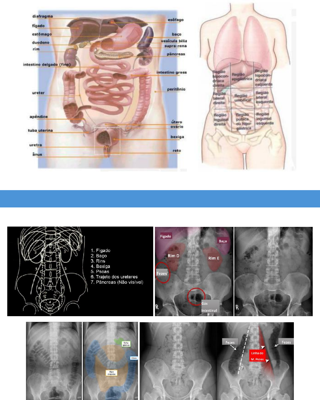 MARIA LAURA R BARROS – MED 108 DIAGNOSTICO POR IMAGEM 1 Avaliação radiográfica do abdômen ANATOMIA BÁSICA ANÁLISE SISTEMÁTICA 1. IDENTIFICAÇÃO DOS ÓRGÃOS (FÍGADO, BAÇO, RINS, MÚSCULO ILIOPSOAS E BEXIGA); MARIA LAURA R BARROS – MED 108 DIAGNOSTICO POR IMAGEM 2 2. DISTRIBUIÇÃO GASOSA; O padrão normal de gás intestinal varia de nenhuma até a existência de gases em três ou quatro alças intestinais, de formato variável medindo menos de 2,5 cm de diâmetro. Níveis hidroaéreos são observados em pacientes normais, geralmente no estômago e no intestino delgado. Gases no intestino delgado geralmente aparecem como várias pequenas coleções aéreas, espalhadas de modo aleatório por todo o abdome. O cólon normalmente contém certa quantidade de gás e matéria fecal e seu diâmetro varia de 3 cm a 8 cm, sendo o ceco a porção de maior diâmetro. Ar livre na cavidade peritoneal é um sinal importante de perfuração intestinal. Radiografias convencionais mostram melhor o pneumoperitônio em posição ortostática, principalmente nas radiografias de tórax, pois pequenos volumes de ar podem ser bem visualizados sob as cúpulas do diafragma. MARIA LAURA R BARROS – MED 108 DIAGNOSTICO POR IMAGEM 3 3. PROCURAR SINAIS DE MASSA ABDOMINAL OU PÉLVICA OU CORPO ESTRANHO; Com o advento da tomografia e da ultrassonografia, não utilizamos mais a radiografia na avaliação de tumores abdominais, mas estes podem ser achados incidentais em pacientes submetidos a radiografias de abdome por diversos motivos, principalmente quando muito volumosos. Geralmente se apresentam ao raio x como uma grande opacidade com densidade de partes moles, que desloca as estruturas abdominais. Corpos estranhos podem ser ingeridos ou inseridos, através da vagina, reto ou uretra. O reconhecimento é importante para evitar complicações, que incluem hemorragia, formação de abscessos, septicemia, perfuração ou obstrução do intestino. Muitos corpos estranhos ingeridos por via oral são radiopacos, como moedas, alfinetes, peças de brinquedos, e outros. A maioria passa através do trato intestinal, causando danos mínimos na mucosa. Estes objetos devem ser acompanhados para garantir que consigam passar inteiramente ao longo do intestino. MARIA LAURA R BARROS – MED 108 DIAGNOSTICO POR IMAGEM 4 4. PROCURAR SINAIS DE ASCITE; O líquido na cavidade peritoneal origina-se de fontes diferentes e varia muito na sua composição. Ascite é o termo empregado para definir a existência de líquido seroso na cavidade peritoneal, mais comumente causada por cirrose, hipoproteinemia ou insuficiência cardíaca congestiva. O diagnóstico por radiografia convencional de casos de ascite requer uma coleção de, pelo menos, 500 ml de líquido. Os achados são: • Aumento difuso da densidade do abdome; • Margens indistintas do fígado, do baço e do músculo psoas; • Deslocamento medial das alças colônicas, afastando-se da faixa do flanco; • Abaulamento dos flancos; • Aumento da separação das alças do intestino delgado cheias de gás. 5. PROCURAR CALCIFICAÇÃO Calcificações intra-abdominais podem ser um sinal de doença intra-abdominal e devem ser procuradas em cada exame de imagem do abdome. TC e US são mais sensíveis à detecção de calcificação do que as radiografias convencionais. Calcificações podem ser: • Vasculares: são comuns na aorta e nos vasos ilíacos. • Cálculos biliares; • Cálculos renais/ureterais; • Granulomas do fígado e baço: focos cicatrizados de doenças granulomatosas; • Calcificações pancreáticas: associado a pancreatite crônica. MARIA LAURA R BARROS – MED 108 DIAGNOSTICO POR IMAGEM 5