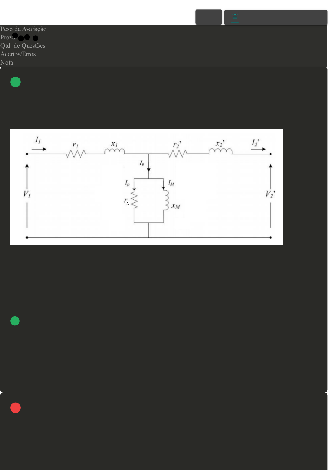 Prova Impressa GABARITO | Avaliação Final (Objetiva) - Individual (Cod.:944287) Peso da Avaliação 3,00 Prova 84753491 Qtd. de Questões 10 Acertos/Erros 8/2 Nota 8,00 Em um transformador de dois enrolamentos, a relação entre a tensão aplicada ao primário e a tensão induzida no secundário dependerá do número de espiras que temos nos dois enrolamentos. Em um transformador ideal podemos chegar a essa relação considerando que o fluxo magnético que passa na primeira espira é o mesmo que passa na segunda. Contudo, na prática, é necessário considerar as perdas presentes no transformador, as diferentes perdas serão consideradas dependendo da finalidade do estudo. Sabendo disso, considere o circuito elétrico equivalente a seguir: Sobre o circuito elétrico equivalente apresentado, classifique V para as sentenças verdadeiras e F para as falsas: ( ) Trata-se de um circuito equivalente T de um transformador. ( ) A variável X1 representa a reatância de dispersão do primário, e Xm se trata da reatância de magnetização do núcleo do transformador. ( ) A variável X1 representa a reatância de dispersão do núcleo do transformador, e Xm se trata da reatância de magnetização do primário. ( ) O circuito elétrico equivalente apresenta um modelo mais completo que o transformador ideal. Assinale a alternativa que apresenta a sequência CORRETA: A V - V - F - V. B V - F - V - F. C F - V - F - V. D F - F - V - F. [Laboratório Virtual – Lei da Indução de Faraday] Através do experimento, foi possível verificar a relação entre a variação do fluxo magnético próximo a um condutor e a corrente elétrica gerada no mesmo. Esse fenômeno é conhecido como lei da indução de Faraday ou lei da indução eletromagnética. Os motores de imãs permanentes possuem um princípio de funcionamento similar, podendo ser encontrados em duas principais estruturas: Armadura rotativa e campo estacionário ou Armadura fixa e campo rotativo. Com relação a essas estruturas de motores de ímã permanente, assinale a alternativa CORRETA: VOLTAR A+ Alterar modo de visualização 1 2 01/07/2024, 12:08 Avaliação Final (Objetiva) - Individual about:blank 1/5 Fabio Evertech Destacar A O estator de uma máquina elétrica com armadura fixa e campo rotativo é composto por ímãs permanentes. B Em uma máquina elétrica com armadura rotativa e campo estacionário, a excitação é realizada através dos enrolamentos presentes no rotor. C A excitação de uma máquina elétrica com armadura rotativa e campo rotativo é realizada através dos enrolamentos presentes no rotor. D O campo de uma máquina elétrica com armadura rotativa e campo estacionário é posicionado no rotor da máquina. Na configuração estrela-delta (Y-Δ) de transformadores trifásicos, a combinação das duas configurações oferece um conjunto de vantagens e desvantagens distintas. Essas características influenciam a escolha da configuração adequada dependendo das necessidades específicas de aplicação. Essa combinação de estrela-delta em transformadores trifásicos aproveita o melhor dos dois mundos: a estabilidade e a distribuição equilibrada das tensões na ligação estrela, e a capacidade de suportar correntes na ligação delta. Isso a torna uma escolha versátil e eficiente em aplicações industriais, comerciais e de distribuição de energia. Com relação ao tema abordado, analise as sentenças a seguir: I- Na ligação estrela-delta, as correntes de fase e de linha são iguais na configuração estrela, enquanto na configuração delta, a corrente de linha é maior que a corrente de fase. II- A ligação estrela-delta é aplicada principalmente em transformadores onde há a possibilidade de falta de fase, não sendo necessárias todas as fases. III- Na ligação estrela-delta, a tensão de linha é maior que a tensão de fase na configuração estrela, enquanto na configuração delta, as tensões de linha e de fase são iguais. IV- Na ligação em questão, é encontrada a capacidade de lidar de forma eficaz tanto com as altas tensões no lado primário quanto as altas correntes no lado secundário. Assinale a alternativa CORRETA: A Somente a sentença II está correta. B As sentenças I, II e IV estão corretas. C As sentenças I e II estão corretas. D As sentenças I, III e IV estão corretas. E As sentenças II e III estão corretas. Motores elétricos apresentam, em sua estrutura, um conjunto de elementos que, quando excitados por tensão elétrica, promovem o movimento rotativo do motor. Uma das principais partes dos motores com ímãs permanentes são, justamente, os ímãs. Desta forma, os ímãs permanentes existentes em motores elétricos sempre são componentes de parte do motor. Sobre esta parte do motor, assinale a alternativa CORRETA: A Rotor. B Campo. C Rolamento. D Estator. Revisar Conteúdo do Livro 3 4 01/07/2024, 12:08 Avaliação Final (Objetiva) - Individual about:blank 2/5 Um motor de indução trifásico de 7HP, fator de potência de 0,85 e escorregamento de 2%, possui uma corrente induzida no rotor de 15A e uma resistência no rotor de 0,3 ohms. Com base na perda no cobre do rotor e a potência convertida, assinale a alternativa CORRETA: A 90 W e 4410 W. B 218 W e 7486 W. C 202,5 W e 9922 W. D 212 W e 8954 W. O método de acionamento de motores é um assunto que sempre foi estudado e aprimorado para uma maior eficiência energética. Os motores síncronos de imãs permanentes possuem três técnicas básicas de acionamento, cada uma delas possui propriedades próprias e podem ter diferentes aplicações. Sobre as técnicas de acionamento de motores síncronos de imãs permanentes, associe os itens, utilizando o código a seguir: I- Partida do motor pela redução da frequência elétrica. II- Partida do motor com uma máquina motriz externa. III- Partida do motor usando enrolamento amortecedores. ( ) Nessa técnica de partida, é reduzida a velocidade de campo do estator por me