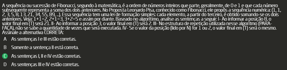 A seguência sucessão de Fibonacci, segundo à matemática, é a ordem de números inteiros que parte, geralmente, de 0e e que cada número representa a soma dos dois anteriores. No Proposta Leonardo Pisa, conhecido como Fibonacci, ele propôs a numérica: (1,1, 2,3,5,8,13,21, 34, 55, Essa sequência tem uma lei de formação simples: cada elemento, a partir do terceiro, é obtido somando-se dois anteriores. Veja: e assim por diante. Baseado no algorítimo, analise as sentencas a Ao informar a posição 8, valor final em será 21. II- Ao informar a posição 3, valor final em será 2. III- No estrutura de repetição utilizada nesse algoritmo (PARA- FAÇA), não se sabe a quantidade de vezes que será executada. IV- Se 0 valor da posição (lido por N) for 1 ou 2, valor final em será mesmo. Assinale a alternativa CORRE TA: A As sentenças le III estão corretas. Somente a sentença II está correta. As sentenças I, e IV estão corretas. D As sentenças III e IV estão corretas.