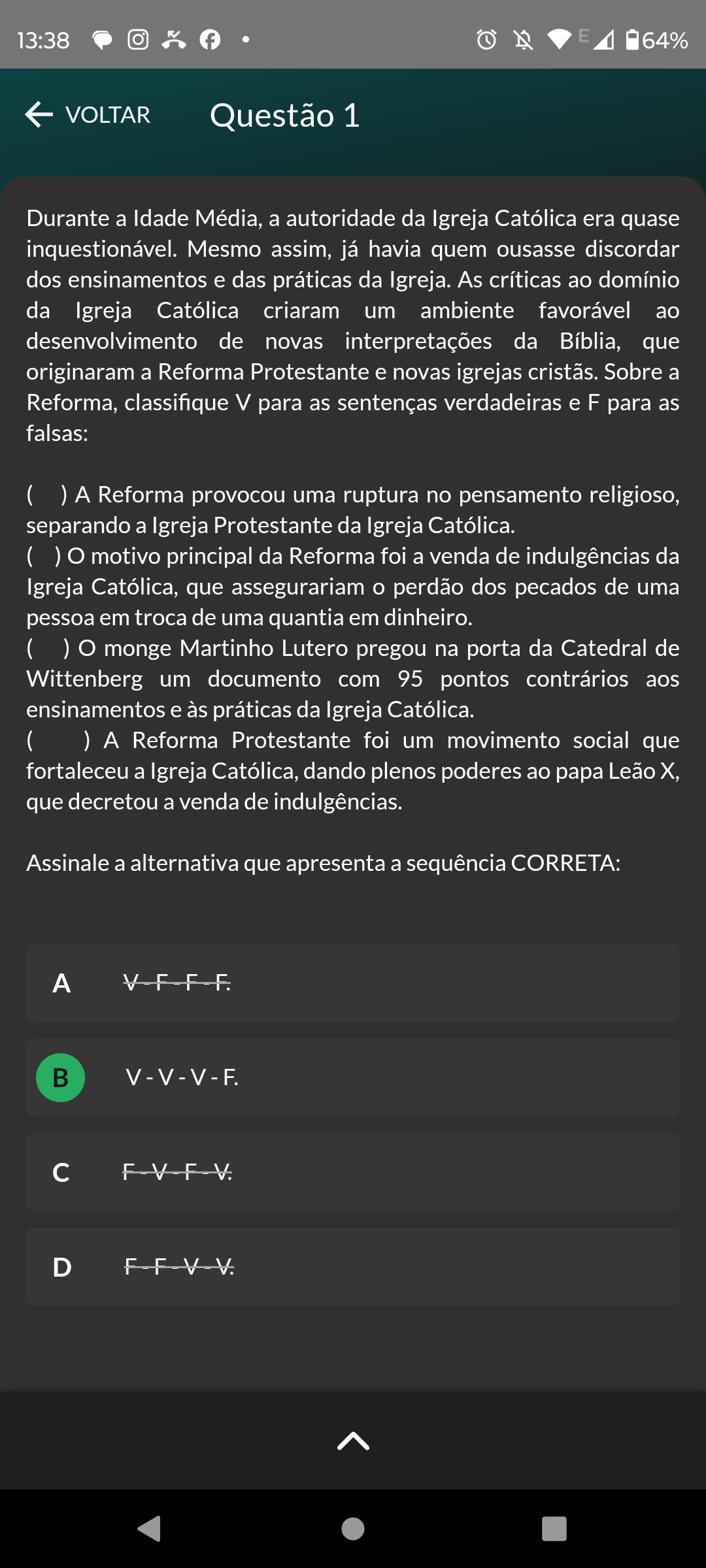 13:38 E 64% VOLTAR Questão 1 Durante a Idade Média, a autoridade da Igreja Católica era quase inquestionável. Mesmo assim, já havia quem ousasse discordar dos ensinamentos e das práticas da Igreja. As críticas ao domínio da Igreja Católica criaram um ambiente favorável ao desenvolvimento de novas interpretações da Bíblia, que originaram a Reforma Protestante e novas igrejas cristãs. Sobre a Reforma, classifique V para as sentenças verdadeiras e F para as falsas: ( ) A Reforma provocou uma ruptura no pensamento religioso, separando a Igreja Protestante da Igreja Católica. ( ) O motivo principal da Reforma foi a venda de indulgências da Igreja Católica, que assegurariam O perdão dos pecados de uma pessoa em troca de uma quantia em dinheiro. ( ) O monge Martinho Lutero pregou na porta da Catedral de Wittenberg um documento com 95 pontos contrários aos ensinamentos e às práticas da Igreja Católica. ( ) A Reforma Protestante foi um movimento social que fortaleceu a Igreja Católica, dando plenos poderes ao papa Leão X, que decretou a venda de indulgências. Assinale a alternativa que apresenta a sequência CORRETA: A V-V-V-F C D