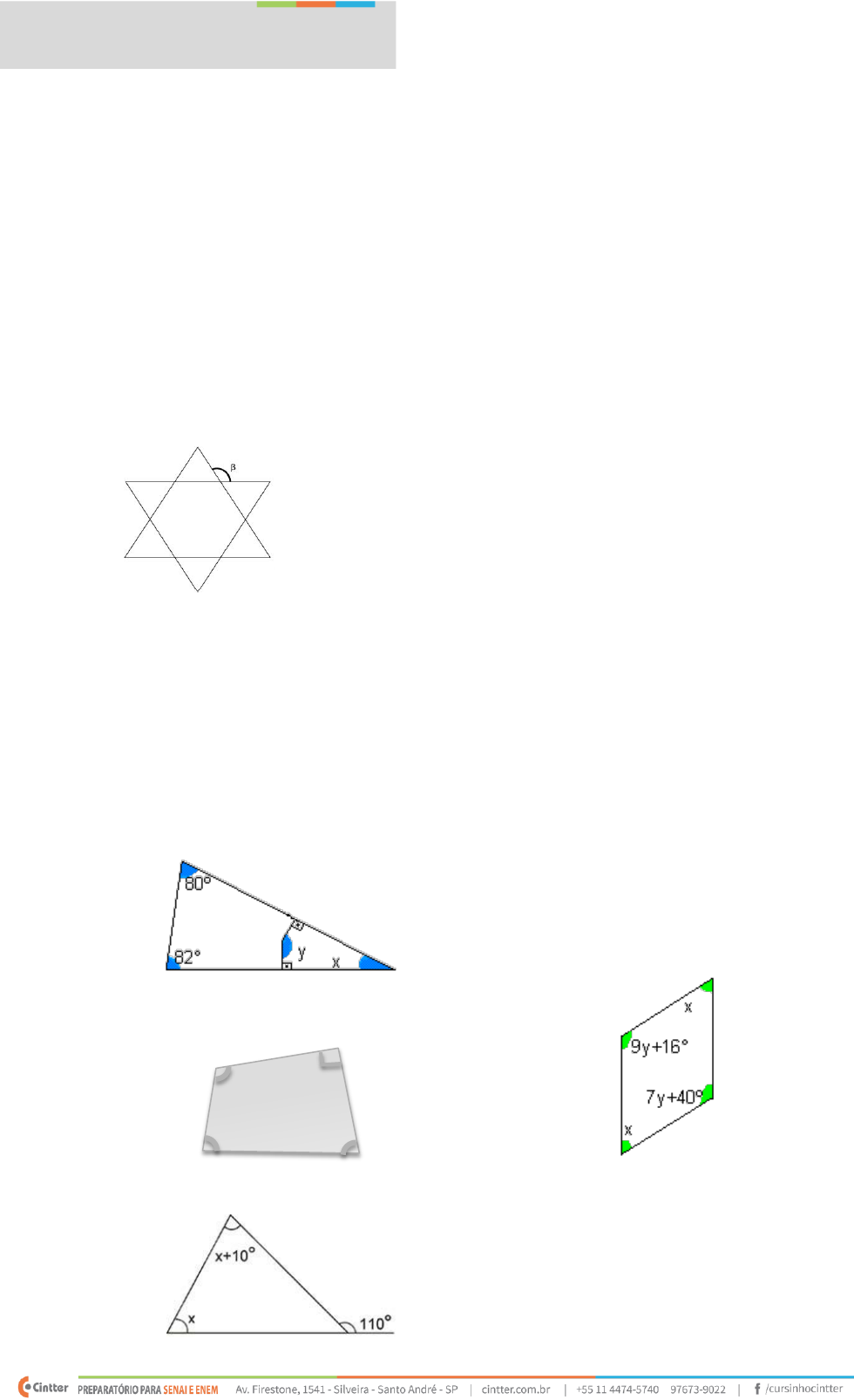 Apoio de Geometria Ângulos Internos e Externos A 1. Quais são os elementos de um polígono? a. arestas, vértices, faces e diagonais b. arestas, vértices, faces, ângulos internos, ângulos externos, diagonais c. lados, vértices, ângulos externos d. lados, faces, vértices, ângulos internos, ângulos externos, diagonais e. lados, vértices, ângulos internos, ângulos externos e diagonais. 2. (CGE 2061) A estrela de Davi a seguir é um símbolo religioso formado por dois triângulos equiláteros iguais e sobreposto. Podemos concluir, então, que o ângulo externo destacado ß vale: a. 45º b. 60º c. 100º d. 120º e. 150º Do exercício 2 ao 4, calcule os valores das incógnitas nas figuras a seguir: 3. (Só Matemática) a. 163º e 19º b. 162º e 17º c. 18º e 162º d. 19º e 161º e. 22º e 171º 4. (Adaptado) a. 210º b. 70º c. 162º d. 43º e. 30º 5. (Prova Brasil) a. 100º b. 85º c. 50º d. 31º e. 30º 6. A soma dos ângulos internos de um eneágono é: a. 1080º b. 1260º c. 860º d. 780º e. 720º 7. (CGE 2041 adaptada) A diferença entre a soma das medidas dos ângulos internos de um octógono e de um hexágono é: a. 180º b. 720º c. 900º d. 360º e. 540º 8. Quantos lados tem o polígono cuja soma dos ângulos internos é 1800º? a. 5 b. 6 c. 8 d. 10 e. 12 9. Num triangulo ABC qualquer, o ângulo B mede o triplo do ângulo C e o ângulo A mede o dobro do ângulo B. Qual é a medida do ângulo B? a. 90º b. 48º c. 54º d. 36º e. 18º 10. (Só Matemática) No paralelogramo ao lado, determine as medidas de x e y. a. 12º e 56º b. 47º e 12º c. 68º e 47º d. 56º e 12º e. 72º e 35º 11. (CGE 2036) Uma indústria de tecidos está preparando uma nova coleção, utilizando 2x x 60º triângulos equiláteros e quadrados para a estampagem dos tecidos, como mostra a figura. A medida do ângulo α é: a. 120º b. 150º c. 180º d. 300º e. 360º 12. Qual o polígono regular cujo ângulo interno é o triplo do externo? a. Dodecágono b. Pentágono c. Octógono d. Heptágono e. Hexágono 13. (PUC-Rio) Os ângulos internos de um quadrilátero medem 3x - 45, 2x + 10, 2x + 15 e x + 20 graus. O menor ângulo mede: a. 90° b. 65° c. 45° d. 105° e. 80° 14. Determine os valores dos ângulos internos e externos, de um polígono qualquer, sabendo que suas medidas são respectivamente: 5x + 60º e x. a. 35°e 145° b. 28°e 152° c. 20°e 160° d. 40°e 140° e. 50°e 130° 15. (CGE 2044) Sabe-se que em certo polígono regular a medida de cada um de seus ângulos externos é 72º. Assim, tal polígono possui: a. 8 lados b. 7 lados c. 6 lados d. 5 lados e. 4 lados 16. (PUC -PR) O nome do polígono regular cuja a soma dos ângulos internos resulta em 720º é: a. Octógono b. Heptágono c. Quadrado d. Eneágono e. Hexágono 17. (FAAP-SP 97) A medida mais próxima de cada ângulo externo do heptágono regular da moeda de R$ 0,25 é: a. 60° b. 45° c. 36° d. 83° e. 51° 18. A soma dos ângulos internos de um polígono é 900°. O nome deste polígono é: a. Hexágono b. Eneágono c. Heptágono d. Decágono e. n.d.a. 19. (Fuvest-2000) Na figura adiante, ABCDE é um pentágono regular. A medida, em graus, do ângulo α é: a. 32° b. 34° c. 36° d. 38° e. 40° 20. (CGE 2051) Quanto ao dodecágono regular, ele possui: a. dez lados; cada ângulo interno mede 150°; não possui lados perpendiculares entre si. b. dez lados; cada ângulo interno mede 120°; possui um par de lados perpendiculares entre si. c. doze lados; cada ângulo interno mede 120°; não possui lados perpendiculares entre si. d. doze lados; cada ângulo interno mede 150°; não possui lados perpendiculares entre si. e. doze lados; cada ângulo interno mede 150°; possui um par de lados perpendiculares entre si. Gab: 1-e; 2-d; 3-c; 4-b; 5-c; 6-b; 7-d; 8-e; 9-c; 10-d; 11-b; 12-c; 13-b; 14-c; 15-d; 16-e; 17-e; 18-c; 19-c; 20-d.