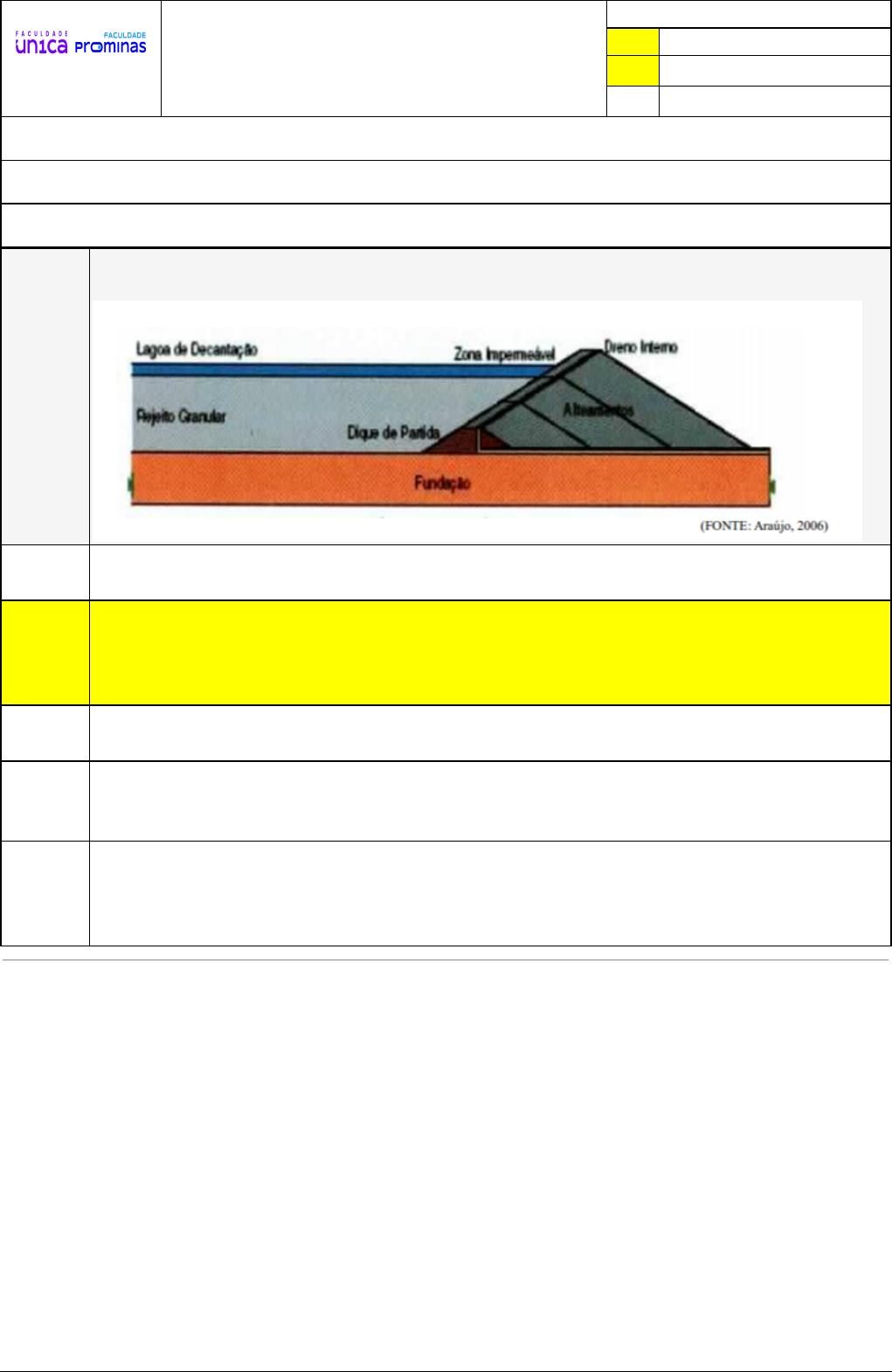 Pincel Atômico - 25/03/2024 11:36:14 1/5 CLEISON RANIERE VIEIRA DA SILVA Avaliação Online (SALA EAD) Atividade finalizada em 10/08/2023 21:42:10 (1082999 / 1) LEGENDA Resposta correta na questão # Resposta correta - Questão Anulada X Resposta selecionada pelo Aluno Disciplina: MECÂNICA DOS SOLOS II [204123] - Avaliação com 10 questões, com o peso total de 50,00 pontos [capítulos - Todos] Turma: Graduação: Engenharia Civil - Grupo: FEVEREIRO/2021 - ENG.CIV [21015] Aluno(a): 91433206 - CLEISON RANIERE VIEIRA DA SILVA - Respondeu 7 questões corretas, obtendo um total de 35,00 pontos como nota [360743_1706 35] Questão 001 (IFES/2012 – Adaptada) Entre as características do método construtivo de barragens de rejeito que mostra a figura abaixo, podemos citar: Trata-se do método construtivo conhecido como alteamento por linha de centro e tem como sua principal característica a construção usando o overflow de hidrociclones. X É o método de alteamento a jusante que tem como características gerais a construção de dique inicial impermeável e barragem de pé, separação dos rejeitos na crista do dique por meio de hidrociclones e barragem com dreno interno e impermeabilização a montante que tem como vantagem ser o método mais seguro. O método mostrado na figura é o alteamento a montante, que se considera o mais seguro no quesito sismicidade. A figura esquematizada representa o método de alteamento por linha de centro, onde não há necessidade de um bom sistema de drenagem, já que o barramento comporta grande volume de estéril. O método que é representado na figura é o alteamento a jusante que tem como vantagens a facilidade construtiva, o material para o alteamento pode vir de áreas de empréstimo, estéril ou do “underflow” dos hidrociclones e permite o controle da linha freática no talude de jusante. Pincel Atômico - 25/03/2024 11:36:14 2/5 [360743_1706 45] Questão 002 O gráfico abaixo representa as produções indexadas entre o período de 1999 e 2018 referentes ao termo geossintético. Gráfico - Publicações por faixas anuais de teses de geossintéticos Disponível em: < https://repositorio.ufersa.edu.br/bitstream/prefix/2968/2/LIGIARRS_ART.pdf> Acesso em 19 agosto 2021 Considerando as informações apresentadas, avalie as asserções a seguir e a relação proposta entre elas. I.O número de produções indexadas da pesquisa entre o período de 2014 e 2018 foi quase cinco vezes maior que o primeiro período estudado (1999 a 2003). PORQUE II.Os geossintéticos são materiais com aplicação crescente em obras geotécnicas. O baixo custo, a facilidade de aplicação e sua versatilidade comparados a metodologias e materiais tradicionais resultam em interessantes materiais de construção, o que justifica grande aumento da sua utilização. A respeito dessas asserções, assinale a opção correta. X A asserção I é uma proposição falsa, e a II é uma proposição verdadeira. As asserções I e II são proposições falsas. A asserção I é uma proposição verdadeira, e a II é uma proposição falsa. As asserções I e II são proposições verdadeiras, e a II é uma justificativa correta da I. As asserções I e II são proposições verdadeiras, mas a II não é uma justificativa correta da I. [360743_1706 48] Questão 003 A NBR 12553/99 classificada o geotêxtil como um produto têxtil bidimensional, permeável, composto de fibras cortadas, filamentos contínuos, monofilamentos, laminetes ou fios, formando estruturas tecidas, não tecidas ou tricotadas, cujas propriedades permitem que desempenhe várias funções numa obra geotécnica. As propriedades que os geotêxteis possuem são: X Físicas, durabilidade, elasticidade e tensionamento. Físicas, durabilidade, químicas e biológicas. Físicas, químicas, hidráulicas e mecânicas. Físicas, hidráulicas, mecânicas e durabilidade. Físicas, químicas, biológicas e mecânicas. Pincel Atômico - 25/03/2024 11:36:14 3/5 [360743_1705 63] Questão 004 (ENADE/2017) Para a avaliação da resistência ao cisalhamento dos solos, emprega- se, comumente, o critério de ruptura de Mohr-Coulomb, que consiste na utilização do círculo de Mohr, representando as solicitações, e de uma envoltória, que representa a resistência ao cisalhamento do solo. Os círculos representam as tensões (normais e cisalhantes) em qualquer plano da massa de solo e a envoltória define os limites de resistência ao cisalhamento para cada um desses planos. Os esquemas de 1 a 4 ilustram os círculos de Mohr e as envoltórias para quatro diferentes estados de tensão em um ponto de uma massa de solo. Nos esquemas, C representa a coesão do solo, Φ é o ângulo de atrito, σ representa as tensões normais (sendo σ1 a tensão principal maior, σ2 a tensão principal intermediária e σ3 a tensão principal menor) e τ representa as tensões cisalhantes. A respeito desses esquemas, avalie as afirmações a seguir: I.O esquema 1 corresponde a uma amostra de solo que se encontra submetida somente a uma pressão hidrostática e, nesse estado, a tensão de cisalhamento é nula. II.O esquema 2 corresponde a uma amostra de solo que excedeu a resistência ao cisalhamento em mais de um plano, o que não é permitido pelo critério de Mohr- Coulomb. III.O esquema 3 corresponde a uma amostra de solo que se encontra submetida a uma tensão cisalhante inferior à sua resistência ao cisalhamento. IV.O esquema 4 corresponde a uma amostra de solo que atingiu a resistência ao cisalhante em algum plano e, por essa razão, ocorreu ruptura. É correto o que se afirma em: I e II, apenas. I e III, apenas. III e IV, apenas. X II e IV, apenas. I, II, III e IV. [360743_1705 78] Questão 005 Um solo residual oriundo de um talude foi levado para o laboratório onde foram realizados diversos ensaios, incluindo o ensaio de cisalhamento direto, cujo resultado se apresenta no gráfico abaixo, através da envoltória de resistência. Fonte: adapta