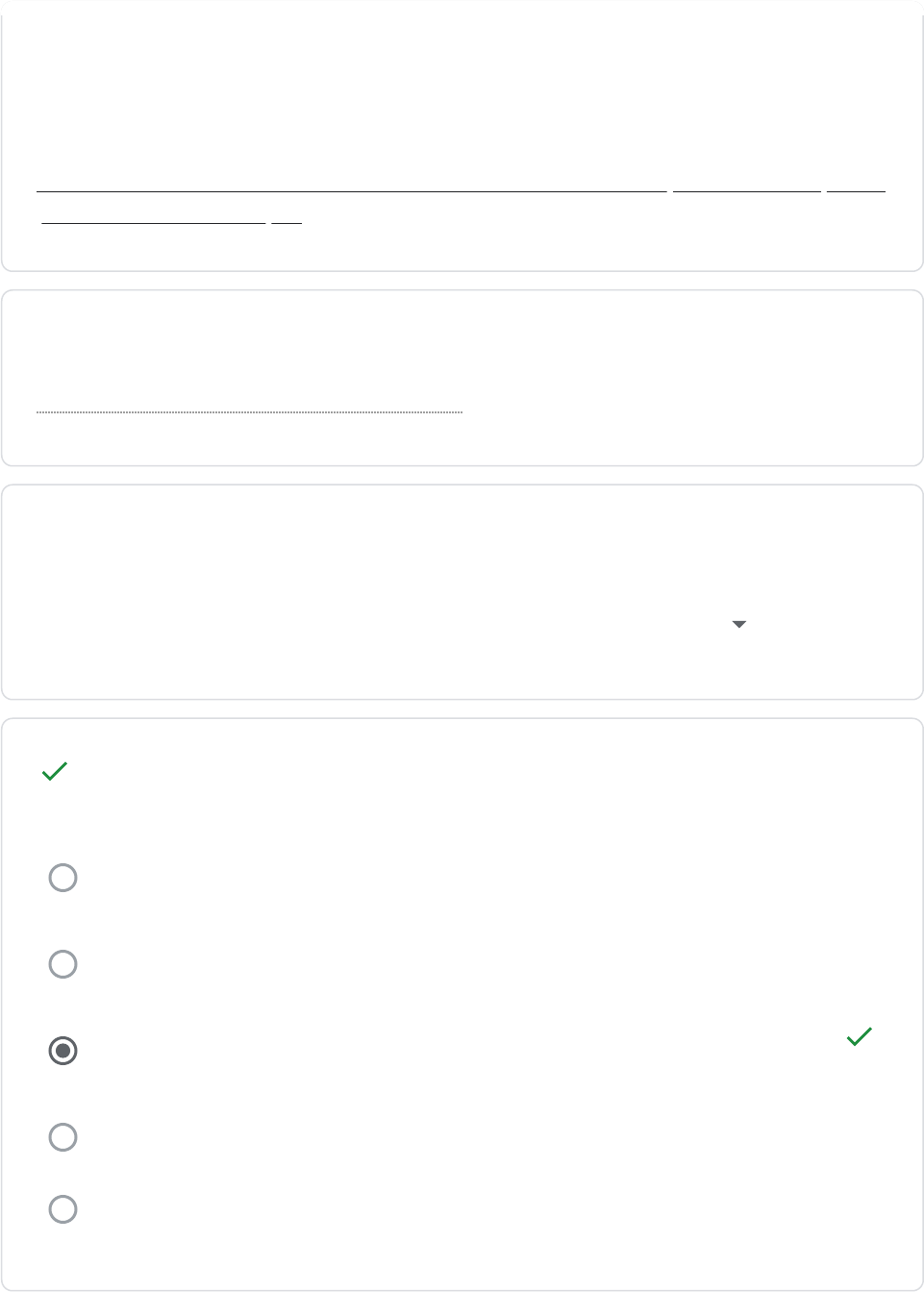 E-mail * ernestinasouza@mtprev.mt.gov.br A - Ele instituiu o manual técnico de processos e procedimentos e também as alterações dos prazos; B - Não está vigente pois o prazo para entrega dos Manuais Técnicos de Processos e Procedimentos encerrou em 2022; C - Está vigente pois estabelece o prazo para entrega dos Manuais Técnicos de Processos e Procedimentos bem como sua atualização anual; D - É utilizado como instrumento de gestão visando manter os processos e procedimentos sem um padrão definido; E - Nenhuma das respostas anteriores. Atividade Módulo 4 - Mapeamento de Processos Esta atividade tem caráter educacional e não deve ser considerada para contabilização de pontos visando certificação. Nome Completo * ERNESTINA PEREIRA CARDOSO DE SOUZA 1) Sobre o Decreto nº 1375/2018 é correto afirmar que: * 01/07/2024, 16:11 Atividade Módulo 4 - Mapeamento de Processos https://docs.google.com/forms/d/e/1FAIpQLSfhXHZf8oGkZsRheu87C14OOAkSPYyuQKibFcLD-WtK4uCTsw/viewscore?viewscore=AE0zAgAfMj… 1/3 A - primeiro; B – segundo; C – terceiro; D - Quarto; E - Quinto. Resposta correta B – segundo; A - Atividades e subatividades; B - Processo e subprocessos; C - Envolvido e seus executores; D - Projeto e subprocessos; E - Nenhuma das anteriores. Resposta correta B - Processo e subprocessos; Este formulário foi criado em MTI - Empresa Mato-grossense de Tecnologia da Informação. Denunciar abuso 2) Complete a frase: Realizar reunião de sensibilização com todas as unidades envolvidas é o ____________________ passo para o mapeamento de processos. * 3) Complete a frase: Um escopo bem definido é essencial para a obtenção de um consenso sobre o entendimento de um _____________ e seus ____________ que serão mapeados. * Formulários 01/07/2024, 16:11 Atividade Módulo 4 - Mapeamento de Processos https://docs.google.com/forms/d/e/1FAIpQLSfhXHZf8oGkZsRheu87C14OOAkSPYyuQKibFcLD-WtK4uCTsw/viewscore?viewscore=AE0zAgAfMj… 2/3 https://docs.google.com/forms/u/0/d/e/1FAIpQLSfhXHZf8oGkZsRheu87C14OOAkSPYyuQKibFcLD-WtK4uCTsw/reportabuse?source=https://docs.google.com/forms/d/e/1FAIpQLSfhXHZf8oGkZsRheu87C14OOAkSPYyuQKibFcLD-WtK4uCTsw/viewform?viewscore%3DAE0zAgAfMjSWzxQhur-FulT95yPCWJP4UKF52kGd0S36xbALNWUN5JyO7sfAjdG2SQ https://www.google.com/forms/about/?utm_source=product&utm_medium=forms_logo&utm_campaign=forms https://www.google.com/forms/about/?utm_source=product&utm_medium=forms_logo&utm_campaign=forms https://www.google.com/forms/about/?utm_source=product&utm_medium=forms_logo&utm_campaign=forms 01/07/2024, 16:11 Atividade Módulo 4 - Mapeamento de Processos https://docs.google.com/forms/d/e/1FAIpQLSfhXHZf8oGkZsRheu87C14OOAkSPYyuQKibFcLD-WtK4uCTsw/viewscore?viewscore=AE0zAgAfMj… 3/3