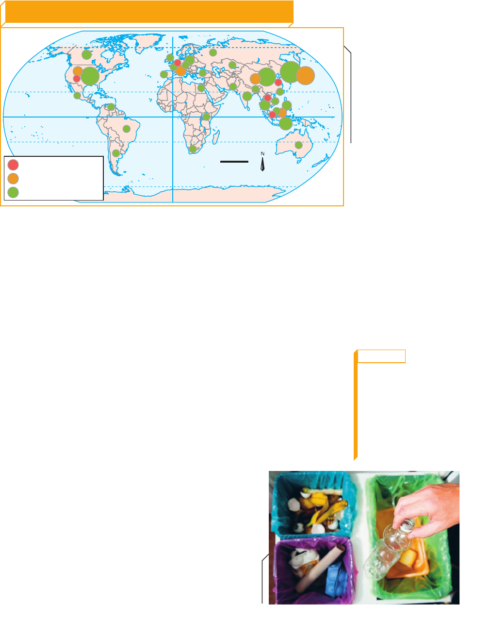 No mapa estão representadas as unidades, em 2020, de uma das maiores empresas do setor automobilístico no mundo. É possível observar que a multinacional está presente em todos os continentes, com notável concentração no Sudeste Asiático. veganismo movimento de conscientização a respeito da exploração dos animais pelo ser humano. Na prática, as pessoas veganas não consomem nenhum produto de origem animal. MUNDO: LOCAIS DE PRODUÇÃO E CENTROS DE PESQUISA DE UMA GRANDE MONTADORA DE VE ÍCULOS (2020) Círculo Polar Ártico Círculo Polar Antártico Trópico de Câncer Trópico de Capricórnio Equador 0º 0º OCEANO PACÍFICO OCEANO PACÍFICO OCEANO ATLÂNTICO OCEANO ÍNDICO OCEANO GLACIAL ÁRTICO OCEANO GLACIAL ANTÁRTICO M er id ia n o d e G re en w ic h M er id ia n o d e G re en w ic h 1 1 1 13 1 3 9 16 1 2 3 2 2 1 1 1 1 1 5 4 1 1 1 1 1 1 1 1 21 1 2 1 1 9 2 1 1 Sedes mundiais Fábricas de produção Centros de design, pesquisa e desenvolvimento 5 15 69 0 3320 km Fonte: elaborado com base em TOYOTA Brasil. Disponível em: https://www.toyota.pt/world- of-toyota/toyota-no-mundo/ toyota-in-the-world.json. Acesso em: 25 ago. 2020. Separação do lixo doméstico é uma prática cotidiana de cuidado com o meio ambiente. A separação do lixo entre materiais orgânicos e recicláveis deve começar dentro de casa, para facilitar o posterior recolhimento pelas agências sanitárias e o processo de reciclagem. Essas empresas passaram a produzir suas mercadorias dispersamente em diferentes países emergentes e em desenvolvimento, atraídas pela obtenção de matérias-primas e emprego de mão de obra local a preços mais baixos. Dessa forma, os lucros são potencializados ao máximo. Nesses países, o rigor das leis ambientais que enquadram as empresas nos modelos sustentáveis de produção é bastante falho. Por isso, as empresas con- seguem produzir mais, pois conseguem explorar de forma predatória os recur- sos naturais e a mão de obra local, muitas vezes, sem responderem legalmente por danos ambientais ou trabalhistas. Várias ONGs que atuam na causa ambiental, ativistas independentes e agên- cias internacionais de voluntariado costumam marcar presença nesses países, denunciando os abusos das empresas e tentando fazer alguma mediação com os governos. No entanto, os problemas ambientais, bem como as desigualdades sociais, continuam aumentando nos países menos desenvolvidos. A SOCIEDADE E AS PRÁTICAS SUSTENTÁVEIS As práticas sustentáveis, pouco a pouco, passaram a fazer parte do cotidiano das pessoas. A atuação de campanhas de governos e ONGs, as informações difundidas pela mídia, bem como iniciativas e projetos de educação ambiental, contribuíram para que a preocupação com o meio ambiente fosse incorporada ao senso comum. De modo geral, a população se engaja em alguns preceitos sustentáveis, como cuidar do lixo, preservar árvores e plantas, evitar o consumo de plástico, evitar su- jar ruas, praias e espaços públicos. Há também movimentos em prol do uso de bicicletas, como o cicloativismo, e em prol da causa animal, como o vegetarianismo e o veganismo, que conquistam um número cada vez maior de adeptos. Entre- tanto, essa adesão depende de investimentos estruturais em educação, infraestrutura e diminuição da desigualdade social. Logo, é expressivamente maior nos países desenvolvidos. A le k s a n d ra S u zi /S h u tt e rs to ck P o rt a l d e M a p a s /A rq u iv o d a e d it o ra 115 V3_CIE_HUM_Vainfas_g21Sa_Cap5_104a125_LA.indd 115V3_CIE_HUM_Vainfas_g21Sa_Cap5_104a125_LA.indd 115 9/27/20 1:05 PM9/27/20 1:05 PM Essen, Alemanha, exemplo de cidade sustentável na Europa e no mundo, em foto de 2018. Essa cidade foi eleita a Capital Verde da Europa em 2017. Cerca de metade da área urbana é composta de parques, e a maioria dos habitantes mora a cerca de 300 metros de um ponto de transporte coletivo. I N F R A E S T R U T U R A U R B A N A E S U S T E N T A B I L I D A D E Nas chamadas “cidades sustentáveis”, a infraes- trutura urbana é pensada e planejada visando à di- minuição dos impactos ambientais. Ciclovias, ampla rede de transporte público sobre trilhos, ônibus eco- lógicos (que utilizam combustíveis pouco poluentes), parques amplos e bem cuidados, ruas arborizadas são exemplos de elementos urbanos que contribuem para a redução da poluição do ar e para diversos ou- tros benefícios. Essas características aumentam a qualidade de vida das pessoas que vivem nas cidades. Paisagem da metrópole de Nova Délhi, na Índia, tomada pela poluição atmosférica. Em primeiro plano, é possível observar a presença de um depósito de lixo. Foto de 2014. As grandes metrópoles globais dos países em de- senvolvimento e emergentes, por sua vez, são marca- das por níveis profundos de desigualdades sociais, que se refletem na infraestrutura urbana. Nesses espaços complexos, há ausência de equipamentos urbanos como áreas verdes e parques, presença diária de gran- des congestionamentos de automóveis, redes de trans- porte público obsoletas e saturadas, ineficácia do siste- ma de coleta seletiva de lixo, rios poluídos, altos índices de poluição do ar, entre muitos outros problemas. O p te ri x /S h u tt e rs to ck A lt a f Q a d ri /A P /G lo w I m a g e s Para a população dessas metrópoles, por sua vez, é mais difícil incorporar os preceitos da sustentabilidade no dia a dia, pois o espaço urbano não favorece essas práticas. Apenas uma parcela das elites que habitam os pequenos mas bem estruturados bairros e distritos ricos tem condições de adotar um estilo de vida mais conectado à natureza. O resultado é que as popula- ções mais empobrecidas, que são maioria no mundo, convivem de perto com os problemas ambientais, os quais afetam sobremaneira a saúde humana. 116 V3_CIE_HUM_Vainfas_g21Sa_Cap5_104a125_LA.indd 116V3_CIE_HUM_Vainfas_g21Sa_Cap5_104a125_LA.indd 116 9/27/20 1:05 PM9/27/20 1:05 PM