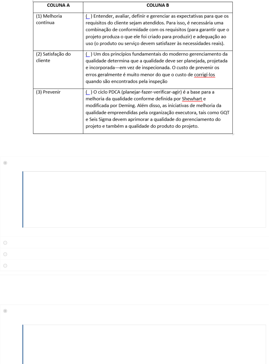 Questão 1/10 - Gestão de Projetos O objetivo dos processos envolvidos no gerenciamento da qualidade visa assegurar que o projeto será concluído com a qualidade desejada, portanto satisfazer as necessidades do cliente e os requisitos do produto. O gerenciamento da qualidade em projetos se baseia no tripé apresentado na tabela abaixo. Relacione a coluna A com a coluna B e, em seguida, assinale a alternativa que apresenta a sequência CORRETA: Nota: 10.0 A 2 – 3 – 1 Você assinalou essa alternativa (A) B 1 – 3 – 2 C 3 - 2 – 1 D 2 – 1 - 3 Questão 2/10 - Gestão de Projetos O risco sistêmico pode ser definido como a possibilidade latente, desconhecida pelos participantes do mercado. Com base no contexto supramencionado assinale a alternativa correta que apresenta possíveis causas de riscos sistêmicos. Nota: 10.0 A Ocorre quando a empresa não possui controle nem informações perfeitas sobre as ações da concorrência, sobre as ações regulatórias do governo, sobre a conjuntura macroeconômica. Você assinalou essa alternativa (A) Você acertou! O gerenciamento da qualidade em projetos se baseia no seguinte tripé: ¦ Satisfação do cliente: entender, traduzir, definir e gerenciar as expectativas do cliente de forma que os requisitos de projetos sejam consistentes com a necessidade do cliente (adequação ao uso). ¦ Prevenir ao invés de corrigir: a qualidade deve conter aspectos que promovam a prevenção de problemas, atuando para evitar que eles ocorram, procurando eliminar ao máximo as correções. ¦ Melhoria contínua: o PDCA (Plan – Do – Check – Act, ou, no português, Planejar – Fazer – Verificar – Agir) é a base para a melhoria da qualidade, não só do produto, mas também do projeto Material para impressão AULA TEÓRICA 4 – páginas 5 e 6 Você acertou! Riscos Sistêmicos: o risco sistêmico pode ser definido como a possibilidade latente, desconhecida pelos participantes do mercado. Ocorre quando a empresa não possui controle nem informações perfeitas sobre as ações da concorrência, sobre as ações regulatórias do governo, sobre a conjuntura macroeconômica. Os riscos sistêmicos são desencadeados por fatores extra projeto. A globalização da economia e a fluidez do mercado financeiro trouxeram enorme instabilidade aos mercados, em parte, decorrente do grande volume de capitais especulativos existentes no mundo e dispostos a 01/07/2024, 19:42 AVA UNIVIRTUS https://univirtus.uninter.com/ava/web/#/ava/AvaliacaoUsuarioHistorico/QTc2Usnlx%2BH0IBrEbS7UYw%3D%3D/novo/2/J43VBM7X7C6ih4O%2B… 1/5 B Ocorre quando a tecnologia que suporta o projeto pode não estar disponível ou não ter a maturidade suficiente. C Quanto menos claros forem os objetivos dos usuários em sua especificação maior a probabilidade de que suas expectativas não sejam atingidas. D Quando o projeto ao ser concluído não atende aos requisitos que o motivaram. Questão 3/10 - Gestão de Projetos Toda decisão sobre projetos de investimento pode ser feita a partir de duas abordagens: a primeira requer que o tomador de decisão opte entre aceitar ou rejeitar um dado projeto; a segunda exige a classificação entre propostas diversas. Assinale a alternativa correta que apresenta como poderá ser escolhido um dos critérios. Nota: 10.0 A A escolha de um desses critérios irá depender do volume de recursos disponíveis para a aplicação e do tipo de projeto analisado. Você assinalou essa alternativa (A) B A escolha é definida a partir de cálculos sobre o impacto ambiental do projeto e seu financiamento. C A escolha é definida a partir da capacidade de converter ativos em desempenho operacional. D A escolha deve ser pautada nos índices de absenteísmo e rotatividade de pessoal, vinculados ao projeto específico. Questão 4/10 - Gestão de Projetos Planejar a qualidade é identificar quais são os requisitos e padrões da qualidade que serão aplicados ao projeto, bem como ao produto do projeto, ou seja, é definir as métricas e critérios, procedimentos e políticas, que serão utilizados pelo projeto. Analise as opções de ferramentas utilizada no planejamento da qualidade de projetos e assinale a alternativa que contém a informação correta. I - Análise de custo-benefício; II - Custo da Qualidade (CDQ); III – Amostragem estatística; IV - Design of experiments (DOE); V – Benchmarking. Nota: 10.0 A Apenas as sentenças I e II estão corretas. B Apenas as sentenças III e IV estão corretas. C Apenas as sentenças I, II, III e V estão corretas. D As sentenças I, II, III, IV e V estão corretas. Você assinalou essa alternativa (D) Questão 5/10 - Gestão de Projetos QUESTÃO PADRÃO ENADE - Conforme apresentado por PMI 2017, há vários métodos de comunicação usados para compartilhar informações entre as partes interessadas do projeto. Esses métodos podem ser classificados em Comunicação interativa, Comunicação Ativa circular em busca da melhor remuneração momentânea. Crises locais transformaram-se em riscos para todo o mercado mundial (Consalter, 2012, p. 150). Você acertou! A escolha de um desses critérios irá depender do volume de recursos disponíveis para a aplicação e do tipo de projeto analisado. Devemos efetuar os cálculos sobre a eficiência econômica do projeto e seu financiamento. Trata-se de analisar os resultados que podem ser obtidos por meio de índices econômicos apropriados (Consalter, 2012, p. 120). Você acertou! Resposta Correta D. Material para impressão AULA TEÓRICA 4 – páginas 6. 01/07/2024, 19:42 AVA UNIVIRTUS https://univirtus.uninter.com/ava/web/#/ava/AvaliacaoUsuarioHistorico/QTc2Usnlx%2BH0IBrEbS7UYw%3D%3D/novo/2/J43VBM7X7C6ih4O%2B… 2/5 e Comunicação Passiva. Analise as afirmações abaixo: I A comunicação Interativa abrange os portais de conhecimento corporativos, intranets e e-learnings. II - Na comunicação ativa, as informações, por exemplo e-mails devem ser encaminhadas para as partes i