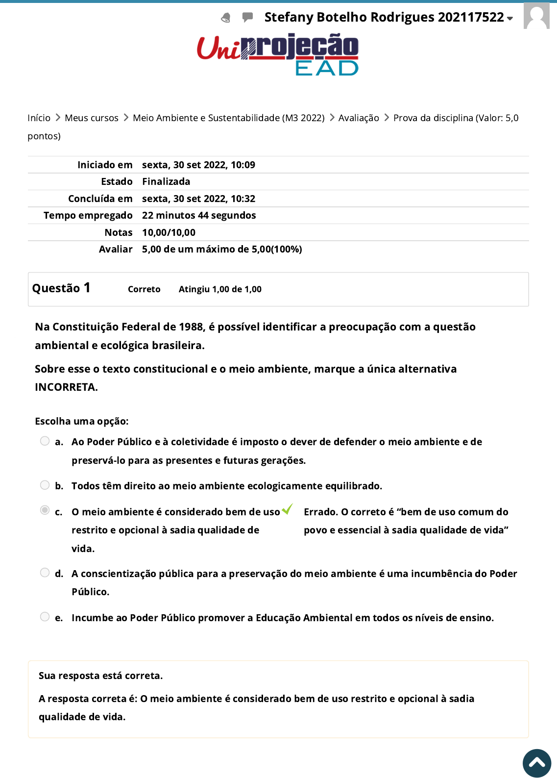 Iniciado em sexta, 30 set 2022, 10:09 Estado Finalizada Concluída em sexta, 30 set 2022, 10:32 Tempo empregado 22 minutos 44 segundos Notas 10,00/10,00 Avaliar 5,00 de um máximo de 5,00(100%) Questão 1 Correto Atingiu 1,00 de 1,00 Na Constituição Federal de 1988, é possível identi�car a preocupação com a questão ambiental e ecológica brasileira. Sobre esse o texto constitucional e o meio ambiente, marque a única alternativa INCORRETA. Escolha uma opção: a. Ao Poder Público e à coletividade é imposto o dever de defender o meio ambiente e de preservá-lo para as presentes e futuras gerações. b. Todos têm direito ao meio ambiente ecologicamente equilibrado. c. O meio ambiente é considerado bem de uso restrito e opcional à sadia qualidade de vida. Errado. O correto é “bem de uso comum do povo e essencial à sadia qualidade de vida” d. A conscientização pública para a preservação do meio ambiente é uma incumbência do Poder Público. e. Incumbe ao Poder Público promover a Educação Ambiental em todos os níveis de ensino. Sua resposta está correta. A resposta correta é: O meio ambiente é considerado bem de uso restrito e opcional à sadia qualidade de vida. Stefany Botelho Rodrigues 202117522 Início › Meus cursos › Meio Ambiente e Sustentabilidade (M3 2022) › Avaliação › Prova da disciplina (Valor: 5,0 pontos) https://faculdadeprojecao.nucleoead.net/ava/user/view.php?id=2951&course=545 https://faculdadeprojecao.nucleoead.net/ava https://faculdadeprojecao.nucleoead.net/ava javascript:void(0) https://faculdadeprojecao.nucleoead.net/ava/my/ https://faculdadeprojecao.nucleoead.net/ava/course/view.php?id=545 https://faculdadeprojecao.nucleoead.net/ava/course/view.php?id=545§ion=9 https://faculdadeprojecao.nucleoead.net/ava/mod/quiz/view.php?id=23711 https://faculdadeprojecao.nucleoead.net/ava/mod/quiz/view.php?id=23711 Questão 2 Correto Atingiu 1,00 de 1,00 Em 1800, apenas 3% da população mundial vivia em cidades. Em 1950, 83 cidades tinham mais de 1 milhão de habitantes no mundo. Em 1990, mais da metade da população dos Estados Unidos já vivia em metrópoles com mais de 1 milhão de habitantes. Em 2007, eram 468 as metrópoles desse porte no mundo. Até 2030, a população urbana aumentará para mais de 5 bilhões, ou 60% da população do mundo. Uma das características dessa explosão urbana, especialmente em países em desenvolvimento, é: Escolha uma opção: a. A adesão maior à política de promoção do saneamento básico por parte dos governos locais. b. O aumento signi�cativo no IDH (Índice de Desenvolvimento Humano). c. O aumento da expectativa de vida, que, de maneira geral, proporciona maior qualidade de vida à população. d. A grande desigualdade na distribuição de renda e de oportunidades econômicas. Certa. e. Os altos níveis de escolaridade veri�cados na população. Sua resposta está correta. A resposta correta é: A grande desigualdade na distribuição de renda e de oportunidades econômicas. Questão 3 Correto Atingiu 1,00 de 1,00 O início da conscientização dos governantes e da opinião pública sobre os problemas e os danos ambientais causados pelo crescimento econômico e pela produção industrial, como a polui- ção da terra, do ar e da água, ocorreu na Conferencia das Nações Unidas sobre o Meio Ambiente Humano, realizada em 16 de junho de 1972, em Estocolmo, na Suécia, com a participação de países desenvolvidos e em desenvolvimento. Compareceram representantes de 113 países, organizações não governamentais e organismos da ONU. Na Conferência de Estocolmo, foi criado: Escolha uma opção: a. O documento intitulado “Convenção da Biodiversidade”. b. O Programa das Nações Unidas para o Meio Ambiente (PNUMA). Certa. c. O Protocola da Agenda 21. d. Painel Intergovernamental sobre Mudanças Climáticas. e. O Protocolo de Kyoto. Sua resposta está correta. A resposta correta é: O Programa das Nações Unidas para o Meio Ambiente (PNUMA). Questão 4 Correto Atingiu 1,00 de 1,00 Sabemos que a perspectiva futura sobre o meio ambiente não é muito clara. A sociedade deve reconhecer que os recursos do meio ambiente são �nitos. Com base nas informações apresentadas, avalie as asserções a seguir e a relação proposta entre elas. I. O impacto da espécie humana sobre o meio ambiente tem sido comparado por alguns cientistas às grandes catástrofes do passado geológico da Terra. PORQUE II. A humanidade deve reconhecer que agredir o meio ambiente põe em perigo a sobrevivência de sua própria espécie, e pensar que o que está́ em jogo não é uma causa nacional ou regional, mas a existência da humanidade toda. É a vida que está em jogo. Podemos conceber um ecossistema sem o homem, não podemos encontrar o homem sem algum ecossistema. A respeito dessas asserções, assinale a opção correta. Escolha uma opção: a. As asserções I e II são falsas. b. A asserção I é uma proposição verdadeira e a II é uma proposição falsa. c. A asserção I é uma proposição falsa e a II é uma proposição verdadeira. d. As asserções I e II são verdadeiras, mas a II não é uma justi�cativa correta da I. e. As asserções I e II são verdadeiras, e a II é uma justi�cativa correta da I. Sua resposta está correta. A resposta correta é: As asserções I e II são verdadeiras, e a II é uma justi�cativa correta da I. Questão 5 Correto Atingiu 1,00 de 1,00 A Conferência das Nações Unidas sobre Meio Ambiente e Desenvolvimento da ONU, em 1992, produziu a Declaração Rio 92, em que rea�rmou os valores consagrados na Declaração de Estocolmo, reconheceu a natureza integral e interdependente da Terra e apresentou 27 princípios que deveriam ser observados para a proteção ao meio ambiente local e internacional. A única opção que NÃO contém um valor ou princípio consagrado na Declaração Rio 92 é: Escolha uma opção: a. Os Estados têm o direito de explorar seus rec