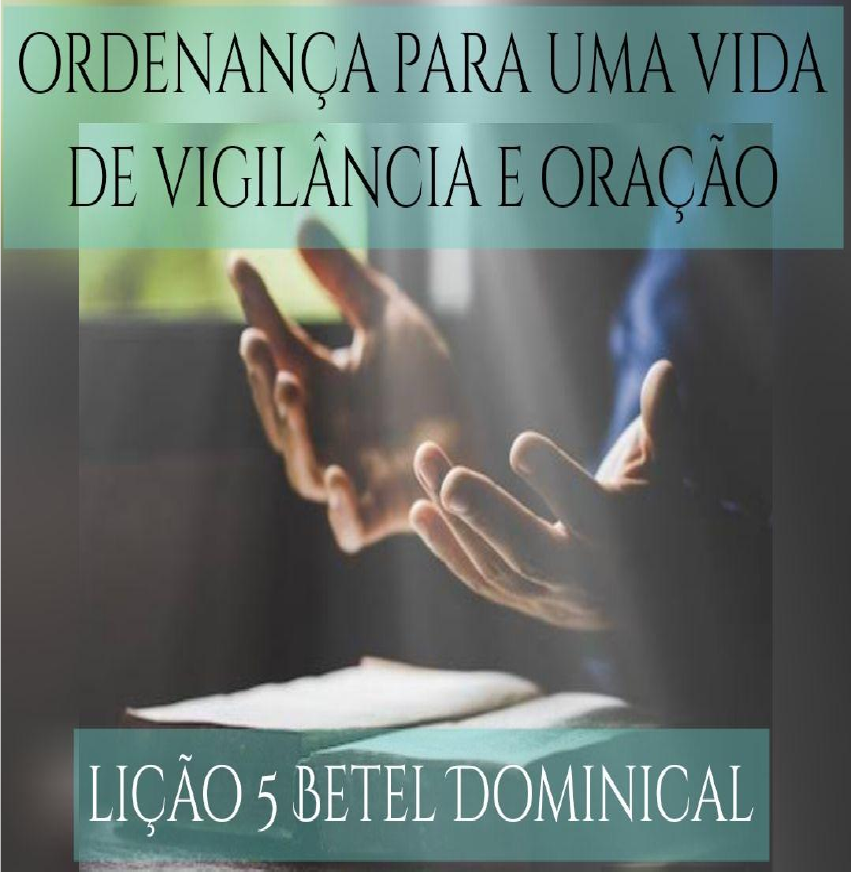 2° Trimestrre De 2024 TEMA: ORDENANÇAS BÍBLICAS – Doutrina Fundamentais Imperativas aos Cristãos para uma vida bem-sucedida e de Comunhão com Deus Lição 05: Ordenança para uma vida de Vigilância e Oração TEXTO ÁUREO “Orando em todo tempo com toda a oração e súplica no Espírito, e vigiando nisto com toda a perseverança e súplica por todos os santos.” Efésios 6.18 VERDADE APLICADA Em todo o tempo, o discípulo de Cristo deve orar e vigiar para não ceder às tentações, enquanto espera a volta de Jesus. OBJETIVOS DA LIÇÃO Mostrar os diversos aspectos da oração. Destacar a oração como meio de acesso a Deus. Ressaltar a importância da vigilância. TEXTOS DE REFERÊNCIA MATEUS 24 42- Vigiai, pois, porque não sabeis a que hora há de vir o vosso Senhor. 43- Mas considere isto: se o pai de família soubesse a que vigília da noite havia de vir o ladrão, vigiaria e não deixaria minar a sua casa. 44- Por isso, estai vós apercebidos também, porque o Filho do Homem há de vir à hora em que não penseis. MATEUS 26 41- Vigiai e orai, para que não entreis em tentação; na verdade, o espírito está pronto, mas a carne é fraca. LEITURAS COMPLEMENTARES SEGUNDA | Mc 13.33 Olhai, vigiar e orar. TERÇA | EF 6.18 Orando em todo o tempo. QUINTA | Tg 5.14-15 A oração da fé salvará o doente. SEXTA | Tg 5.16 A oração pode muito em seus efeitos. QUARTA | CI 4.2 Exortação à oração. SÁBADO | Ap 16.15 Bem-aventurado aquele que vigia e guarda. HINOS SUGERIDOS: 296, 427, 577 MOTIVO DE ORAÇÃO Ore por uma vida de vigilância e de não abandono dos momentos de oração. ESBOÇO DA LIÇÃO Introdução 1- A falta de vigilância põe tudo a perder 2- Aprendendo a orar 3- A dedicação à oração Conclusão INTRODUÇÃO Enquanto prosseguimos na jornada cristã, para vencermos e perseverarmos, não podemos desprezar estes dois aspectos destacados por Nosso Senhor e pelos escritos dos Seus apóstolos: vigilância e oração. Em um tempo repleto de distrações, é preciso convicção e disciplina no imprescindível cultivo destas práticas, com a ajuda do Espírito Santo. PONTO DE PARTIDA – Devemos orar e vigiar. 1- A FALTA DE VIGILÂNCIA PÕE TUDO A PERDER A palavra gregoreo é a mais utilizada no Novo Testamento para a palavra vigiar, que significa (WYCLIFFE, 2010, p. 2018): “ficar acordado, alerta, dar total atenção, para evitar que por negligência ou indolência algumas calamidades destrutivas atinjam a vida de alguém [Mt 24.42; 25.13; Ap 16.15], ou ainda para evitar que alguém negue ou abandone a Cristo [Mt 26.41] ou caia em pecado [1Ts 5.6; 1Co 16.13: 1Pe 5.8]”. 1.1. Vigiai, porque o espírito está pronto, mas a carne é fraca. O próprio Jesus nos alertou: “Vigiai e orai, para que não entreis em tentação; na verdade, o espírito está pronto, mas a carne é fraca.” (Mt 26.41]. A vigilância vê a tentação chegar; a oração dá força para resistir a ela. Vigilância é saber que um simples vacilo pode ser fatal. Não adianta ser PHD, ter doutorado, se não vigiar. Não adianta ser excelente executor, se não vigiar, não adianta ser exímio conhecedor bíblico, se não vigiar, não adianta ter fé que transporta montes, se não vigiar, não adianta ser de oração, se não vigiar. Não adianta orar vinte e quatro horas por dia, se, quando se levanta da oração, não vigia, murmura, fala mal de alguém, xinga, mente e outras coisas mais que entristecem o Espírito Santo de Deus. Você está jogando fora toda a oração. Se fosse só pelo espírito, ele resistiria, mas quando entra a carne há um enfraquecimento natural peculiar ao ser humano. Comentário Bíblico Beacon sobre Mateus 26.36-46: “Quando Jesus retornou aos três discípulos, que deveriam estar vigiando [Mt 26.38], Ele os encontrou adormecidos [Mt 26.40]. Como Pedro havia se vangloriado de forma tão elevada, o Mestre o repreendeu. Então, nem uma hora pudeste vigiar comigo? E Cristo lhes deu outra advertência solene: Vigiai e orai, para que não entreis em tentação [Mt 26.41]. Esta é uma advertência à qual todo cristão precisa dar atenção, durante todas as horas de todos os dias.” 1.2. Vigiai, porque o adversário busca a quem possa tragar. A luta que temos que lutar não é contra carne ou sangue, não é física, não é contra seres humanos, é contra pessoas. Nossa luta é contra os principados, contra as potestades, contra os príncipes das trevas deste século, contra as hostes espirituais da maldade, nos lugares celestiais [Ef 6.12]. Por isso, precisamos tomar toda a armadura de Deus, para que possamos resistir no dia mau [Ef 6.13-18). O nosso adversário não brinca em serviço. Cuidado! John Stott (A Mensagem de Efésios, ABU Editora, 2001. p. 218): “Talvez mais importante seja o mandamento no sentido de manter-se vigilante e, portanto, alerta [Ef 6.18]. Remonta até ao ensino do próprio Jesus, que enfatizava a necessidade da vigilância tendo em vista que não somente a sua volta (Mc 13.33ss.; Lc 12.37ss.] como também o ataque da tentação (Mc 14.34-38) seriam repentinos. Parece que sempre repetia a mesma advertência: “Digo-vos: Vigiai!”. Os apóstolos ecoavam e estendiam essa mesma admoestação. “Vigiai” era sua conclamação geral à vigilância cristã [1Co 16.3; cf. Ap 3.2- 3), em parte porque o diabo sempre estava à espreita como um leão faminto, e os falsos mestres, como lobos ferozes [1Pe 5.8; At 20.31], e, em parte, para que a volta do Senhor não nos apanhe de surpresa [1Ts 5.1-8], mas especialmente por causa da nossa tendência de dormir quando deveríamos estar orando [Ef 6.18; Cl 4.2]. “Vigiai e orai”, Jesus insistiu.” 1.3. Vigiai, porque não sabeis o dia nem a hora. “Vigiai, pois, porque não sabeis o dia nem a hora em que o Filho do Homem há de vir.” [Mt 25.13]. “Se o pai de família soubesse a que hora havia de vir o ladrão, vigiaria e não deixaria minar a sua casa. Portanto, estai vós também apercebidos; 
