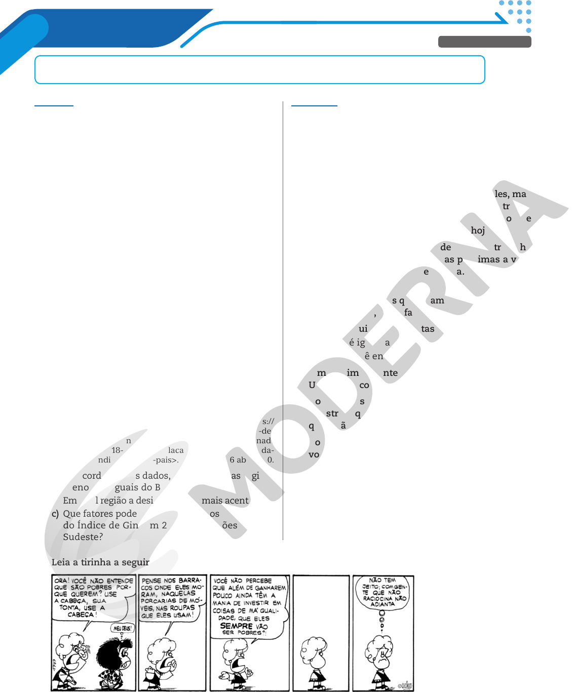 Analisar 1. Imagine que você tenha o poder da invisibilidade: pode entrar em qualquer lugar e agir sem ser notado; pode ouvir conversas alheias, pode saber segredos de amigos e de inimigos; pode fazer muitas coisas que a sociedade considera reprováveis sem ser punido. Você nunca iria para a prisão por seus atos nem seria reprovado pelas pessoas. Partindo da teoria da crítica prática, que tipo de ati- tude Kant consideraria moralmente correta nessa situação hipotética? Justifique sua resposta. 2. Leia o texto e, depois, responda às questões a seguir. “O índice de Gini é um indicador que mede distribuição, concentração e desigualdade econô- mica e varia de 0 (perfeita igualdade) até 1 (máxima concentração e desigualdade). [...] As Regiões Sul (0,448) e Centro-Oeste (0,486) apresentaram os menores índices e, no Nordeste, ele alcançou 0,520. De 2017 para 2018, no Norte, Sudeste e Sul esse indicador subiu, enquanto no Nordeste e Centro-Oeste houve retração. De 2015 a 2018, a trajetória ascendente do indicador foi mais acentuada no Norte (de 0,490 para 0,517) e no Sudeste (de 0,483 para 0,508).” PNAD Contínua 2018: 10% da população concentram 43,1% da massa de rendimentos do país. Agência IBGE de Notícias, 16 out. 2019. Disponível em <https:// agenciadenoticias.ibge.gov.br/agencia-sala-de- imprensa/2013-agencia-de-noticias/releases/25700-pnad- continua-2018-10-da-populacao-concentram-43-1-da- massa-de-rendimentos-do-pais>. Acesso em 16 abr. 2020. a) De acordo com os dados, quais seriam as regiões menos desiguais do Brasil? b) Em qual região a desigualdade é mais acentuada? c) Que fatores podem estar associados ao aumento do Índice de Gini em 2018 nas regiões Norte e Sudeste? (BNCC) Competências específicas: 2, 4, 5 e 6; Habilidades: EM13CHS101 EM13CHS102 EM13CHS103 EM13CHS106 EM13CHS206 EM13CHS402 EM13CHS501 EM13CHS502 EM13CHS503 EM13CHS504 EM13CHS606 Pesquisar O que é igualdade? O que é justiça? A igualdade e a justiça são dois dos principais ele- mentos na constituição do direito das sociedades contemporâneas. Apesar da importância desses con- ceitos, suas definições e interpretações são motivo de controvérsia e questionamentos ao longo da história. Muitos autores refletiram sobre eles, mas suas definições estão em permanente construção e debate, deixando-nos a seguinte questão: o que entendemos por igualdade e justiça hoje? Visando contribuir para esse debate, seu trabalho será investigar o que as pessoas próximas a você pensam sobre igualdade e justiça. Para isso, siga estes passos: 1. Escolha três pessoas que façam parte das suas rela- ções cotidianas, como família, amigos e professores. 2. Faça as seguintes perguntas a essas pessoas: a) O que é igualdade para você? b) O que você entende por justiça? É muito importante que você registre a resposta. Use um bloco de anotações ou um gravador. 3. Compare as respostas dos seus entrevistados e registre o que esses discursos têm em comum e quais são seus principais pontos de divergências. 4. Com base na comparação das respostas e no que você estudou nessa unidade, verifique se as con- cepções de igualdade e justiça de seus entrevista- dos são condizentes ou não com a dos pensadores estudados. 5. Registre suas análises e comparações e compartilhe com os colegas. Debata com eles sobre os resulta- dos encontrados. © JO A Q U ÍN S A LV A D O R L A VA D O (Q U IN O ) T O D A M A FA LD A / FO TO A R E N A a) Você concorda com a afirmativa da perso- nagem de que “as pes- soas são pobres porque querem”? Explique seu posicionamento. b) Como você explicaria o fenômeno da pobreza para um amigo? Argu- mente. Na tirinha, Susanita expõe para Mafalda seu entendimento sobre as cau- sas da desigualdade. Com base nela e nos assuntos tratados no decorrer do capítulo, responda às questões. 3. Leia a tirinha a seguir. R ep ro d uç ão p ro ib id a. A rt .1 84 d o C ód ig o P en al e L ei 9 .6 10 d e 19 d e fe ve re iro d e 19 98 . 46 Atividades Registre em seu cadernoCapítulos 1, 2, 3 e 4 https://agenciadenoticias.ibge.gov.br/agencia-sala-de-imprensa/2013-agencia-de-noticias/releases/25700-pnad-continua-2018-10-da-populacao-concentram-43-1-da-massa-de-rendimentos-do-pais https://agenciadenoticias.ibge.gov.br/agencia-sala-de-imprensa/2013-agencia-de-noticias/releases/25700-pnad-continua-2018-10-da-populacao-concentram-43-1-da-massa-de-rendimentos-do-pais https://agenciadenoticias.ibge.gov.br/agencia-sala-de-imprensa/2013-agencia-de-noticias/releases/25700-pnad-continua-2018-10-da-populacao-concentram-43-1-da-massa-de-rendimentos-do-pais https://agenciadenoticias.ibge.gov.br/agencia-sala-de-imprensa/2013-agencia-de-noticias/releases/25700-pnad-continua-2018-10-da-populacao-concentram-43-1-da-massa-de-rendimentos-do-pais https://agenciadenoticias.ibge.gov.br/agencia-sala-de-imprensa/2013-agencia-de-noticias/releases/25700-pnad-continua-2018-10-da-populacao-concentram-43-1-da-massa-de-rendimentos-do-pais (BNCC) Competências específicas: 1 e 6 Habilidades: EM13CHS101 EM13CHS102 EM13CHS103 EM13CHS106 EM13CHS606Atividades Registre em seu caderno A geografia da fome Como a fome é retratada no Brasil e no mundo atual- mente? Como ela se manifesta em diferentes espaços geográficos? As imagens da fome veiculadas pelos dife- rentes meios de comunicação favorecem a compreensão do fenômeno pelo público que acompanha as notícias? “[...] Josué Apolônio de Castro, professor, geógrafo, médico, sociólogo e político [...] foi indicado três vezes para o prêmio Nobel: [...] Medicina em 1954, e nos anos de 1963 e 1970, ao Nobel da Paz. [...] De 1952 a 1956 ocupou o cargo de presidente do Conselho Executivo da Organização das Nações Unidas para Agricultura e Alimentação FAO/ONU, e, em 1962 foi nomeado Embaixador do Brasil na Organização das Nações Unidas – ONU. [...] A obra em exame, Geografia da fome, o dilema bra- sileiro: pão ou aço foi