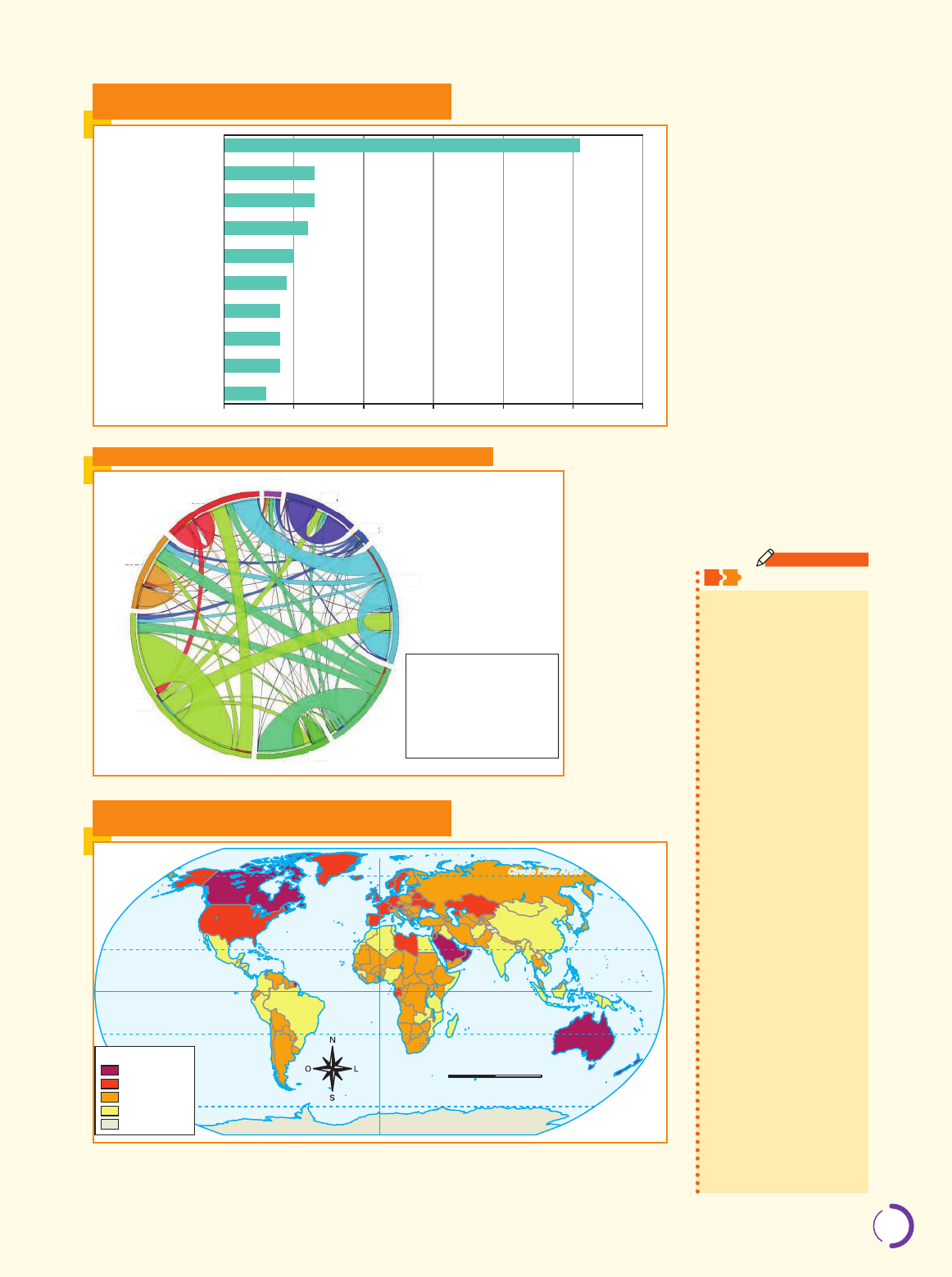 1. Qual país mais recebeu imigrantes no período 2010-2020 e em qual havia maior estoque de imigrantes em 2019? Explique a situação desse país. 2. De qual país mais saíram migrantes no período 2010-2020? Por quê? Justifique a inadequação do uso do termo migrantes para as pessoas que saem desse país. 3. De forma geral, de qual grupo de países mais saem migrantes e em qual grupo mais entram? Por quê? Veja as respostas no Manual do Professor. Interpretar NÃO ESCREVA NO LIVRO Principais rotas migratórias no mundo – 2019 AS OC NASA AN ALC EUR AOSA ACAM DES África subsaariana Oceania Norte da África e Sudoeste Asiático América do Norte América Latina e o Caribe Europa Ásia Oriental e Sudeste Asiático Ásia Central e Ásia Meridional Desconhecido AS OC NASA AN ALC EUR AOSA ACAM DES Fonte: elaborado com base em UNITED NATIONS. Department of Economic and Social Affairs. International Migration 2019: Wall Chart. Disponível em: www. un.org/development/desa/pd/sites/ www.un.org.development.desa.pd/files/ files/documents/2020/Feb/un_2019_ internationalmigration_wallchart.pdf. Acesso em: 14 abr. 2020. Fonte: elaborado com base em UNITED NATIONS. Department of Economic and Social Affairs. International Migration 2019: Wall Chart. Disponível em: www.un.org/development/desa/pd/sites/www.un.org.development.desa.pd/files/files/ documents/2020/Feb/un_2019_internationalmigration_wallchart.pdf. Acesso em: 14 abr. 2020. Fonte: elaborado com base em UNITED NATIONS. Department of Economic and Social Affairs. International Migration Report 2019: Highlights. Disponível em: www.un.org/en/ development/desa/ population/migration/ publications/ migrationreport/docs/ MigrationReport2019_ Highlights.pdf. Acesso em: 14 abr. 2020. B a n c o d e i m a g e n s /A rq u iv o d a e d it o ra 0 10 20 30 40 50 60 Estados Unidos Alemanha Arábia Saudita Rússia Reino Unido Emirados Árabes Unidos França Canadá Austrália Itália Mundo: países com maior número absoluto de imigrantes – 2019 (em milhões) % do total nacional Maior que 20 10-20 1-10 Menor que 1 Sem dados OCEANO PACÍFICO OCEANO ATLÂNTICO OCEANO ÍNDICO OCEANO PACÍFICO OCEANO GLACIAL ÁRTICO OCEANO GLACIAL ANTÁRTICO Círculo Polar Ártico 0º 0º Equador Trópico de Câncer M er id ia n o d e G re en w ic h Trópico de Capricórnio Círculo Polar Antártico 0 3325 6650 km Mundo: percentual de imigrantes em relação à população do país – 2019 G rá fi c o s : F ó rm u la P ro d u ç õ e s /A rq u iv o d a e d it o ra 39 V2_CIE_HUM_Claudio_g21Sa_Cap1_016a043.indd 39V2_CIE_HUM_Claudio_g21Sa_Cap1_016a043.indd 39 9/8/20 5:42 PM9/8/20 5:42 PM DI¡LOGOS NÃO ESCREVA NO LIVRO 1. A migração é um fenômeno social amplo e complexo, cheio de particula- ridades. Busque ou crie uma imagem que represente para você o signi- ficado da migração no mundo atual. Para isso: a) Escolha o suporte com o qual se sinta mais à vontade para trabalhar: sulfite, cartolina, software de cria- ção e edição de imagens e fotos, fo- tografia, colagem, etc. b) Pesquise imagens criadas por outros artistas que se inspiraram nos movi- mentos populacionais para criar al- guma obra; dialogar com referências quase sempre é inspirador. c) Com os colegas e o professor, escolham um local comum da escola para expor os trabalhos feitos. 2. Você está aqui e agora porque seus antepassados migraram. Eles podem ter enfrentado dificuldades e alegrias no processo e tiveram seus motivos para deixar seus lugares de origem. Se você pudesse conversar com eles, o que gostaria de perguntar? a) Elabore essas perguntas e anote-as em seu caderno. b) Ao final, compartilhe com os colegas de sala e, juntos, pensem em pos- síveis respostas que poderiam obter. 3. Leia a seguir trecho de texto publicado no site da ACNUR, agência da ONU para refugiados, sobre o que está se passando na Venezuela: Existem aproximadamente 4,6 milhões de refugiados e migrantes da Venezuela em todo o mundo. Quase 80% estão em países da Améri- ca Latina e do Caribe Os países que mais acolhem venezuelanos são a Colômbia, o Peru e o Equador. Atualmente o Brasil acolhe mais de 220 mil refugiados e migrantes venezuelanos. Segundo projeções do Plano Regional de Resposta a Refugiados e Migrantes (RMRP), 6,5 milhões de refugiados e migrantes venezuela- nos poderão estar fora do país até o final de 2020. Essa é a maior crise de deslocamento da história recente da América Latina. Desde o seu início, em 2014, o ACNUR atua para responder às necessidades de fa- mílias venezuelanas. ACNUR Brasil. 4 dados para entender a situação da Venezuela. 28 nov. 2019. Disponível em: www.acnur.org/portugues/2019/11/28/4-dados-para-entender-a- situacao-da-venezuela/. 28 nov. 2019. Acesso em: 6 maio 2020. Veja as respostas das atividades desta seção no Manual do Professor. Busque diversas referências para compor a sua imagem sobre os movimentos populacionais. V la d im ir S v ir a c e v ic /S h u tt e rs to c k 40 V2_CIE_HUM_Claudio_g21Sa_Cap1_016a043.indd 40V2_CIE_HUM_Claudio_g21Sa_Cap1_016a043.indd 40 9/8/20 5:42 PM9/8/20 5:42 PM