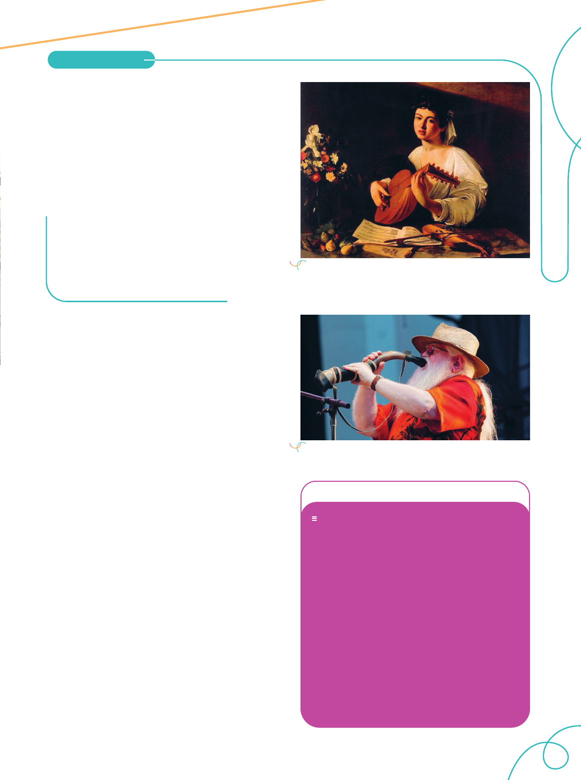 59 O tocador de alaúde, de Caravaggio, 1595-1596 (óleo sobre tela, 94 cm × 119 cm). Museu Hermitage, São Petersburgo, Rússia. Hermeto Pascoal tocando berrante em apresentação em Nova York, Estados Unidos, 2010. J a ck V a rt o o g ia n /G e tt y I m a g e s R e p ro d u ç ã o /M u s e u H e rm it a g e , S ã o P e te rs b u rg o , R ú s s ia . PARA IR MAIS LONGE O Barroco foi um período da história da arte compreendido entre os séculos XVI e XVIII, aproximadamente. Com origem na península Itálica, essa estética foi difundida principalmente pela Europa, mas também chegou ao Brasil e se desenvolveu no país durante o período colonial, com influências na arquitetura, na música e na literatura. Entre suas principais marcas estão o rebuscamento e a valorização dos detalhes, como é o caso da expressiva ornamentação das composições musicais, da presença de contrastes (como a contraposição de claro e escuro na pintura) e de desequilíbrios, como os jogos de luz e sombra e as contorções exageradas nas formas. Na pintura O tocador de alaúde, de Caravaggio (1573-1610), por exemplo, é possível observar como a luz funciona para destacar elementos do aposento escuro, como a figura do jovem, as flores, as frutas, os instrumentos musicais e a partitura. BARROCO Hermeto Pascoal e a improvisação instrumental Compositor, arranjador e multi-instrumen- tista, Hermeto Pascoal nasceu no interior de Alagoas. Começou a fazer música ainda na in- fância, explorando o som de objetos e da natu- reza. Seu primeiro instrumento convencional foi uma sanfona de oito baixos, com a qual se apresentava em festas de sua cidade, como os bailes de forró em que tocava com o irmão desde os 11 anos de idade. Hermeto usa a palavra “mistura” como uma chave para compreender sua música, a qual ele chama de “música universal”, pois abrangeria todos os estilos bem-tocados e bem-mistura- dos. Leia a seguir uma fala de Hermeto a res- peito desse conceito de “música universal”: “Quando falo de ‘música universal’, [...] falo da que é feita a partir do que a pessoa é e ouve. E eu ouço muitas coisas, também música espanhola. Por isso, toco quando me dá na telha e nunca me censuro. Se me chamam dos Estados Unidos para tocar em um festival de jazz, pois muito bem, mas conste que o que eu faço é ‘música universal’: esse é o meu jeito”. MARTÍNEZ, Chema G. Hermeto Pascoal: “Miles Davis me chamou para lutar boxe e lhe dei um cruzado em pleno rosto”, El País, 17 jul. 2018. Disponível em: https://brasil.elpais.com/ brasil/2018/07/17/politica/1531853240_373749. html. Acesso em: 3 jul. 2020. Variação sobre as Folias de Espanha – extrato de Jordi Savall (La Rêveuse: Les Folies d’Espagne de Marin Marais) (vídeo, 1 min). Disponível em: https://youtu.be/ZqVMiIq8LHo. Acesso em: 4 jun. 2020. O músico catalão Jordi Savall (1941-) é um especialista em tocar música antiga na atualidade. Ele utiliza-se de instrumentos construídos na época e reconstitui os modos de tocar. Nesse vídeo, Savall faz uso de uma viola da gamba, instrumento de cordas que precedeu os violinos e violoncelos, e toca um trecho de composição daquela época conhecido como “tema e variações”, um gênero criado a partir de registros que os compositores faziam das próprias improvisações. O compositor dessa obra, Marin Marais (1656-1728), valeu-se de um tema chamado Folia (que significa “loucura”), uma melodia de origem espanhola muito usada em improvisações na época e que foi trabalhada em forma de variações por vários compositores. FICA A DICA V1_LINGUAGENS_Faraco_g21Sa_Cap2_054a087_LA.indd 59V1_LINGUAGENS_Faraco_g21Sa_Cap2_054a087_LA.indd 59 02/09/2020 10:3502/09/2020 10:35 60 A música de Hermeto realmente é uma grande mistura de ritmos, timbres, instrumentos e invenção. É uma música com sotaque do Nor- deste brasileiro, que se utiliza muito de ritmos como o baião e de instru- mentos típicos do forró, mas que também tem um trabalho com os tim- bres e com imprevisibilidades que a aproxima de compositores euro- peus de vanguarda, além de apresentar um tipo de construção musical que a relaciona ao jazz, especialmente pelo modo como as seções de improviso acontecem. 1 Para compreender melhor o fazer musical de Hermeto Pascoal e re- fletir sobre seu processo de criação, ouça um trecho da música “Era pra ser e não foi”, faixa do álbum Brasil, Universo, gravado em 1986 por Hermeto Pascoal & Grupo. a. O que você achou dessa música? Resposta pessoal. b. O que ela tem de semelhante ou diferente em relação a outras músicas que você conhece? Resposta pessoal. c. Em algum momento você percebeu se a música remete a algum estilo de música brasileira que você conhece? d. Você identificou algum trecho que pareça improvisado? e. Quais instrumentos musicais você consegue perceber? Resposta pessoal. Os instrumentos musicais mais perceptíveis são: saxofone, teclado, baixo, triângulo, bateria e a voz (em um pequeno trecho). timbre: propriedade dos sons que possibilita identificar e distinguir cada fonte sonora. seção: possível divisão que pode ser identificada em uma música, geralmente caracterizada pela entrada de melodias diferentes, mudanças de andamento e ritmo, entre outros aspectos. Ao longo de sua carreira musical, Hermeto Pascoal viveu em diversas cidades do Nordeste, como Recife e Caruaru, em Pernambuco, e João Pessoa, na Paraíba. Nessa trajetória, trabalhou com outros artistas e grupos, como o paraibano Sivuca (1930-2006) e a Orquestra Tabajara, criada na Paraíba, na década de 1930. Na década de 1950, muda-se para o Sudeste, onde integra o grupo Quarteto Novo, em São Paulo (SP). Em 1969, viaja para os Estados Unidos, onde grava seu primeiro disco próprio, Hermeto (Nova York: Buddah Records, 1971), e faz parcerias com nomes importantes do jazz, como Miles Davis (1926-1991) e Chick Corea (1941-). Retornando ao Brasil, o artista 