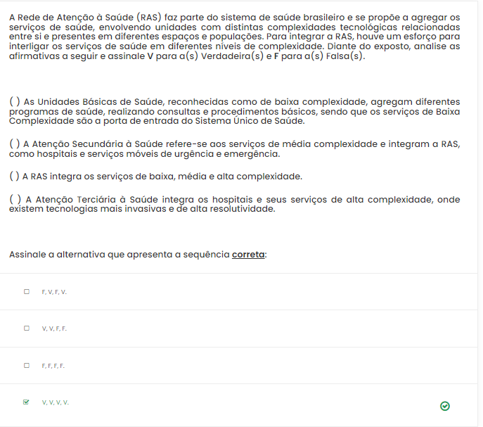 A Rede de Atenção à Saúde (RAS) faz parte do sistema de saúde brasileiro e se propõe a agregar os serviços de saúde, envolvendo unidades com distintas complexidades tecnológicas relacionadas entre si e presentes em diferentes espaços e populações. Para integrar a RAS, houve um esforço para interligar os serviços de saúde em diferentes níveis de complexidade. Diante do exposto, as afirmativas a seguir e V para a(s) Verdadeira(s) e F para a(s) Falsa(s). As Unidades Básicas de Saúde, reconhecidas como de baixa complexidade, agregam diferentes programas de realizando consultas e procedimentos básicos, sendo que os serviços de Baixa Complexidade são a porta de entrada do Sistema Unico de A Atenção Secundária à Saúde refere-se aos serviços de média complexidade e integram a RAS, como hospitais e serviços móveis de urgência e emergência. () A RAS integra os serviços de baixa, média e alta complexidade. A Atenção Terciária à Saúde integra os hospitais e seus serviços de alta complexidade, onde existem tecnologias mais invasivas e de alta resolutividade. Assinale a alternativa que apresenta a sequência correta: F.V.F.V. V.V.F.F. F.F.F.F.