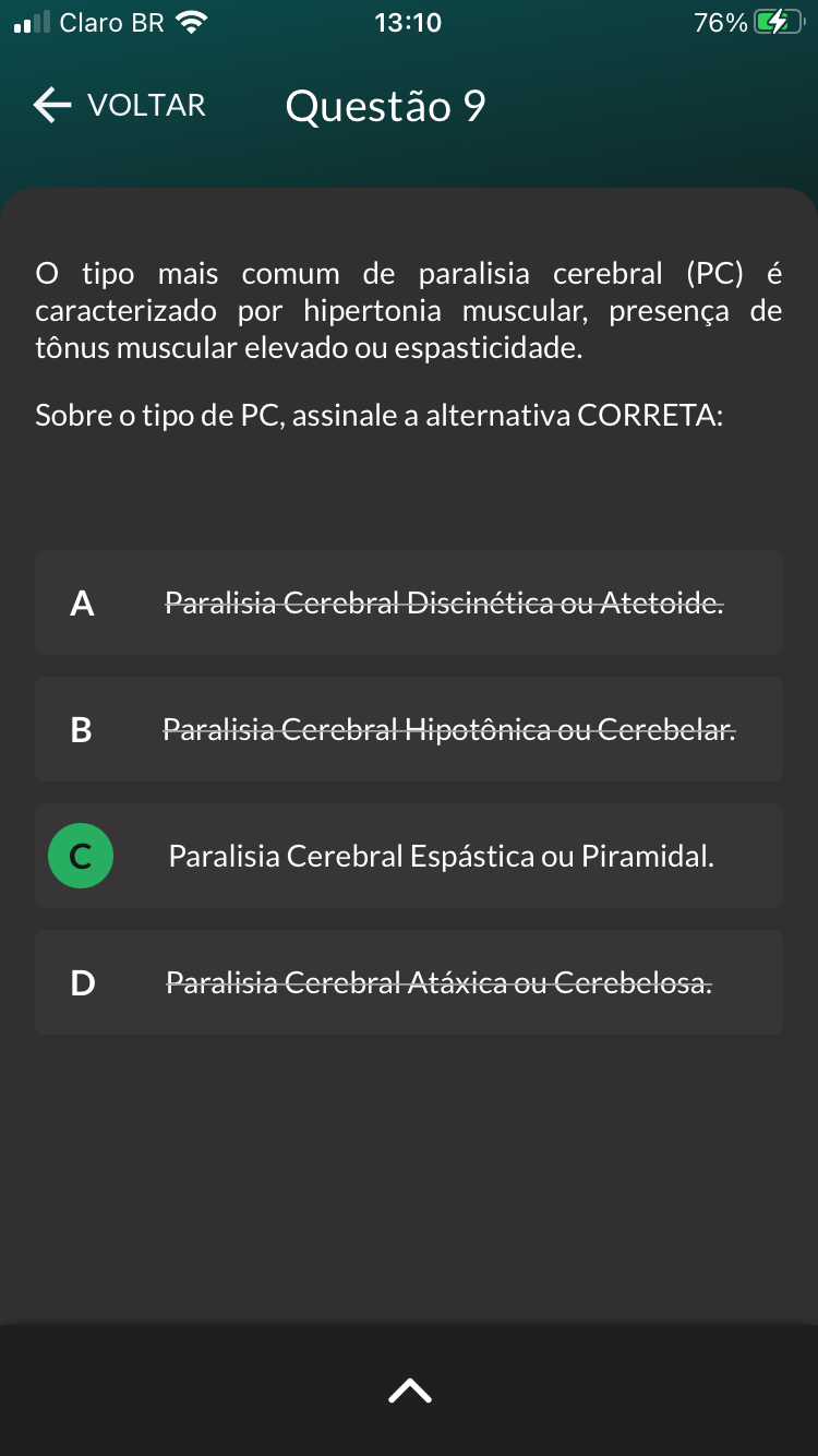 Claro BR 13:10 76% VOLTAR Questão 9 O tipo mais comum de paralisia cerebral (PC) é caracterizado por hipertonia muscular, presença de tônus muscular elevado ou espasticidade. Sobre tipo de PC, assinale a alternativa CORRETA: A Paralisia Cerebral Discinética ou Atetoide. B Paralisia Cerebral ou Cerebelar. C Paralisia Cerebral Espástica ou Piramidal. D Paralisia Cerebral Atáxica ou Cerebelosa.