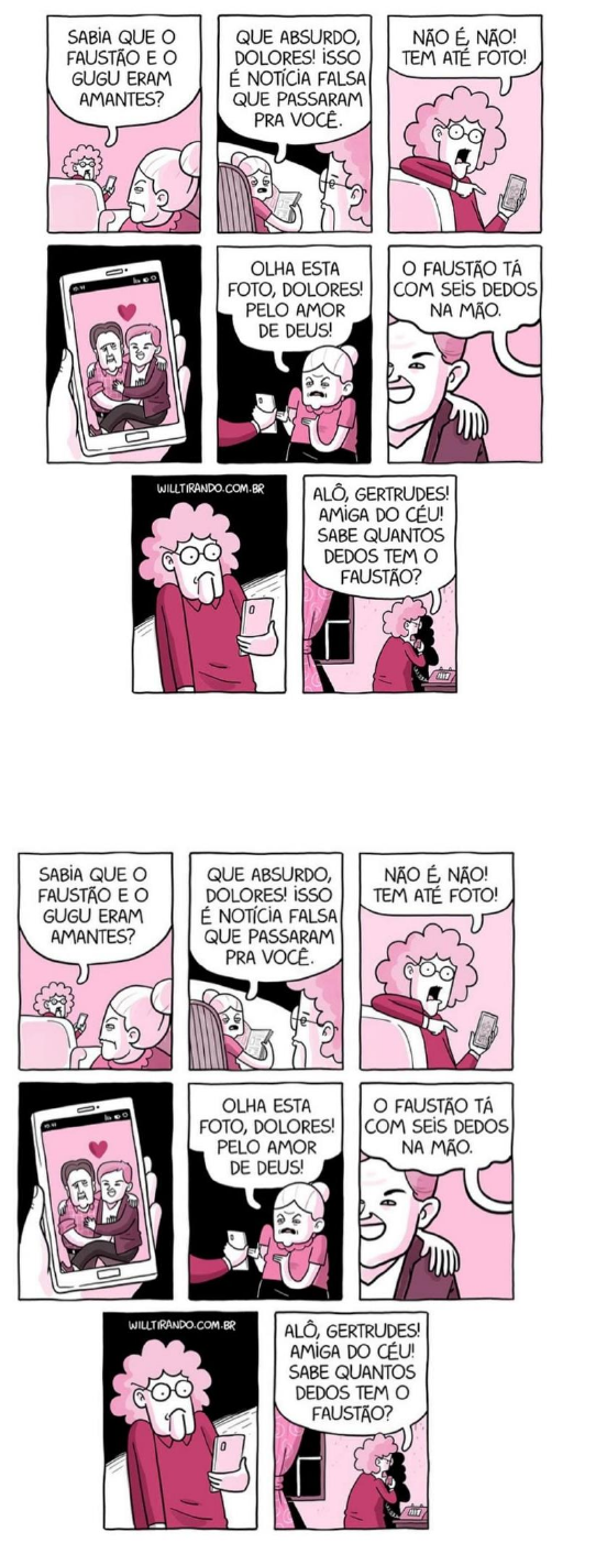 Atividade – Fake News 1- O que é exatamente uma "Fake News"? Qual é o objetivo de quem cria ou dissemina "Fake News"? 2- Como é possível identificar se uma notícia é verdadeira ou falsa? 3- Como as "Fake News" podem afetar a vida de um indivíduo ou a sociedade em geral? 4- As "Fake News" são um fenômeno recente ou sempre existiram? Explique. 5- Há diferença entre "Fake News" e opiniões divergentes? 6- Qual a Fake News contada na tirinha? 7- Como Dolores tentou comprovar que a notícia era verdadeira? Ela conseguiu? 8- Se a foto em questão tivesse sido editada com inteligência artificial a história seria a mesma? 9- Você acha que as “tias do zap”, como Dolores, ajudam a espalhar Fake News? 10- Explique o humor da tirinha. Atividade – Fake News 1- O que é exatamente uma "Fake News"? Qual é o objetivo de quem cria ou dissemina "Fake News"? 2- Como é possível identificar se uma notícia é verdadeira ou falsa? 3- Como as "Fake News" podem afetar a vida de um indivíduo ou a sociedade em geral? 4- As "Fake News" são um fenômeno recente ou sempre existiram? Explique. 5- Há diferença entre "Fake News" e opiniões divergentes? 6- Qual a Fake News contada na tirinha? 7- Como Dolores tentou comprovar que a notícia era verdadeira? Ela conseguiu? 8- Se a foto em questão tivesse sido editada com inteligência artificial a história seria a mesma? 9- Você acha que as “tias do zap”, como Dolores, ajudam a espalhar Fake News? 10- Explique o humor da tirinha.