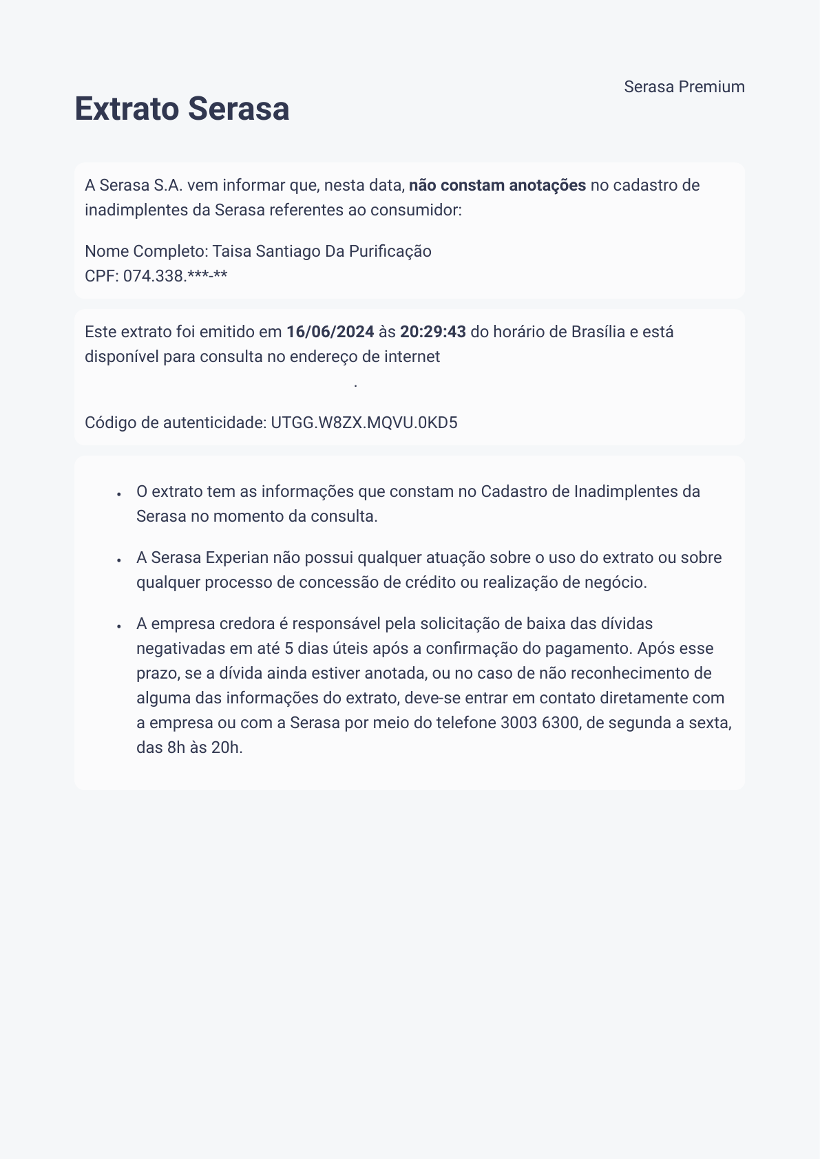 Extrato Serasa Serasa Premium A Serasa S.A. vem informar que, nesta data, não constam anotações no cadastro de inadimplentes da Serasa referentes ao consumidor: Nome Completo: Taisa Santiago Da Purificação CPF: 074.338.***-** Este extrato foi emitido em 16/06/2024 às 20:29:43 do horário de Brasília e está disponível para consulta no endereço de internet https://www.serasa.com.br/area- cliente/meu-cpf/pendencias/extrato. Código de autenticidade: UTGG.W8ZX.MQVU.0KD5 • O extrato tem as informações que constam no Cadastro de Inadimplentes da Serasa no momento da consulta. • A Serasa Experian não possui qualquer atuação sobre o uso do extrato ou sobre qualquer processo de concessão de crédito ou realização de negócio. • A empresa credora é responsável pela solicitação de baixa das dívidas negativadas em até 5 dias úteis após a confirmação do pagamento. Após esse prazo, se a dívida ainda estiver anotada, ou no caso de não reconhecimento de alguma das informações do extrato, deve-se entrar em contato diretamente com a empresa ou com a Serasa por meio do telefone 3003 6300, de segunda a sexta, das 8h às 20h. Extrato Serasa