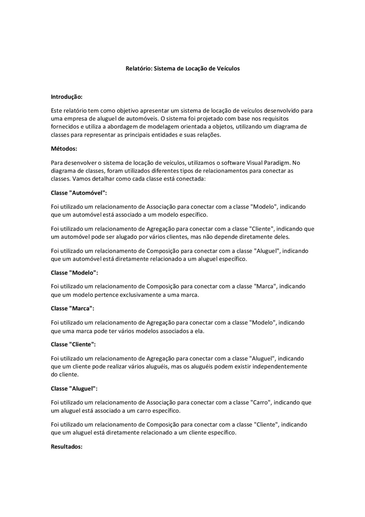 Relatório: Sistema de Locação de Veículos Introdução: Este relatório tem como objetivo apresentar um sistema de locação de veículos desenvolvido para uma empresa de aluguel de automóveis. o sistema foi projetado com base nos requisitos fornecidos e utiliza a abordagem de modelagem orientada a objetos, utilizando um diagrama de classes para representar as principais entidades e suas relações. Métodos: Para desenvolver o sistema de locação de veículos, utilizamos software Visual Paradigm. No diagrama de classes, foram utilizados diferentes tipos de relacionamentos para conectar as classes. Vamos detalhar como cada classe está conectada: Classe "Automóvel": Foi utilizado um relacionamento de Associação para conectar com a classe "Modelo", indicando que um automóvel está associado a um modelo específico. Foi utilizado um relacionamento de Agregação para conectar com a classe "Cliente", indicando que um automóvel pode ser alugado por vários clientes, mas não depende diretamente deles. Foi utilizado um relacionamento de Composição para conectar com a classe "Aluguel", indicando que um automóvel está diretamente relacionado a um aluguel específico. Classe "Modelo": Foi utilizado um relacionamento de Composição para conectar com a classe "Marca", indicando que um modelo pertence exclusivamente a uma marca. Classe "Marca": Foi utilizado um relacionamento de Agregação para conectar com a classe "Modelo", indicando que uma marca pode ter vários modelos associados a ela. Classe "Cliente": Foi utilizado um relacionamento de Agregação para conectar com a classe "Aluguel", indicando que um cliente pode realizar vários aluguéis, mas os aluguéis podem existir independentemente do cliente. Classe "Aluguel": Foi utilizado um relacionamento de Associação para conectar com a classe "Carro", indicando que um aluguel está associado a um carro específico. Foi utilizado um relacionamento de Composição para conectar com a classe "Cliente", indicando que um aluguel está diretamente relacionado a um cliente específico. Resultados: