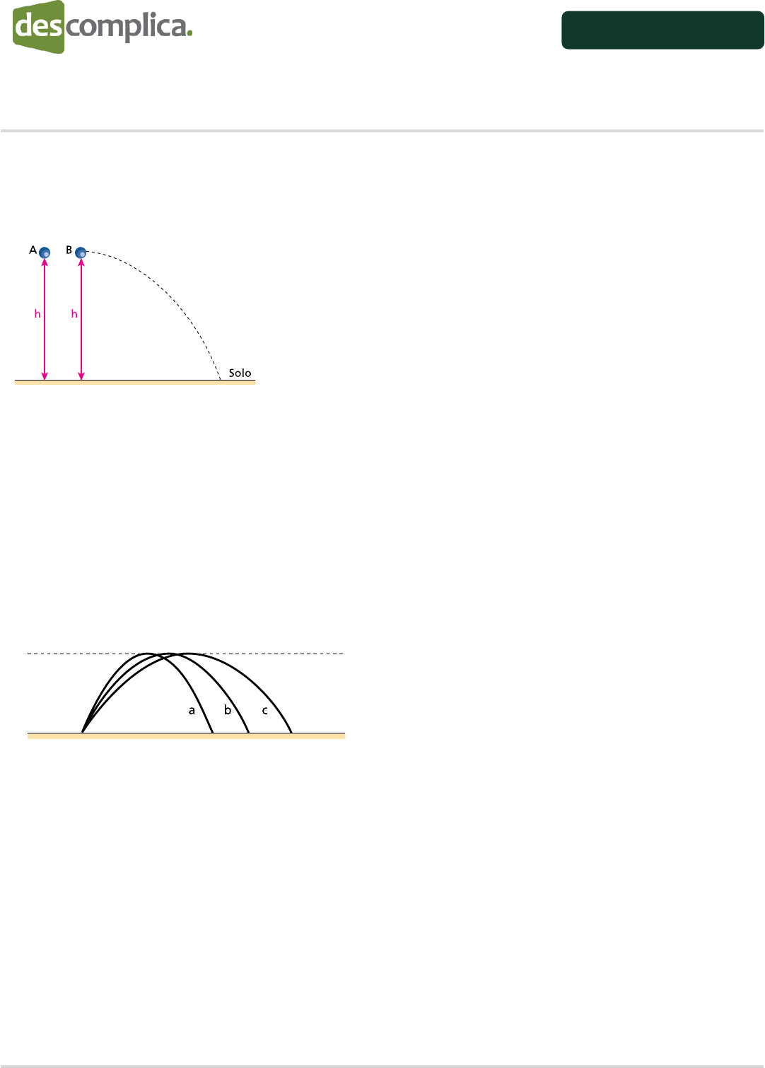 Este conteúdo pertence ao Descomplica. Está vedada a cópia ou a reprodução não autorizada previamente por escrito. Todos os direitos reservados. Lista de Exercícios Física Leonardo Gomes 24.03.2015 Lançamentos Horizontal e Oblíquo 1. De uma mesma altura h e no mesmo instante t0 = 0, uma bola A é abandonada a partir do repouso e outra bola, B, é lançada horizontalmente. As bolas A e B atingem o solo nos instantes tA e tB, com velocidades de módulos VA e VB respectivamente. Desprezando influências do ar, é correto afirmar que: a) tA=tB e VA=VB. b) tB>tA e VB>VA. c) tB>tA e VB=VA. d) tA=tB e VB>VA e) tA=tB e VB<VA. 2. (UFV-MG) A figura abaixo mostra três trajetórias de uma bola de futebol que é chutada de um mesmo ponto. Sejam “t” o tempo de permanência da bola no ar, “Vv” a componente vertical da velocidade inicial da bola e “Vh” a componente horizontal da velocidade inicial. Em relação a essas três grandezas físicas e considerando as três trajetórias a, b e c anteriores, livres da resistência do ar, pode-se concluir que: a) ta<tb<tc, Vva=Vvb=Vvc, Vha=Vhb=Vhc. b) ta=tb=tc, Vva<Vvb<Vvc, Vha<Vhb=Vhc. c) ta=tb=tc, Vva=Vvb=Vvc, Vha<Vhb<Vhc. d) ta=tb=tc, Vva=Vvb=Vvc, Vha>Vhb>Vhc. e) ta<tb<tc, Vva<Vvb<Vvc, Vha=Vhb>Vhc. 3. (UERJ 2013) Tres blocos de mesmo volume, mas de materiais e de massas difernetes, são lançados obliquamente para o alto, de um mesmo ponto do solo, na mesma direção e sentido e com a mesma velocidade. Este conteúdo pertence ao Descomplica. Está vedada a cópia ou a reprodução não autorizada previamente por escrito. Todos os direitos reservados. Lista de Exercícios Física Leonardo Gomes 24.03.2015 Observe as informações da tabela: Material do bloco Alcance de lançamento Chumbo A1 Ferro A2 Granito A3 A relação entre os alcances A1, A2 e A3 está apresentada em: a) A1 > A2 > A3 b) A1 < A2 < A3 c) A1 = A2 > A3 d) A1 = A2 = A3 4. (UEL-PR) Um corpo é lançado para cima, com velocidade inicial de 50m/s, numa direção que forma um ângulo de 60o com a horizontal. Desprezando a resistência do ar, pode-se afirmar que no ponto mais alto da trajetória a velocidade do corpo, em metros por segundo, será: (Dados: sen60o=0,87; cos60o =0,50) a) 5 b) 10 c) 25 d) 40 e) 50 Este conteúdo pertence ao Descomplica. Está vedada a cópia ou a reprodução não autorizada previamente por escrito. Todos os direitos reservados. Lista de Exercícios Física Leonardo Gomes 24.03.2015 Gabarito 1. D 2. C 3. D 4. C