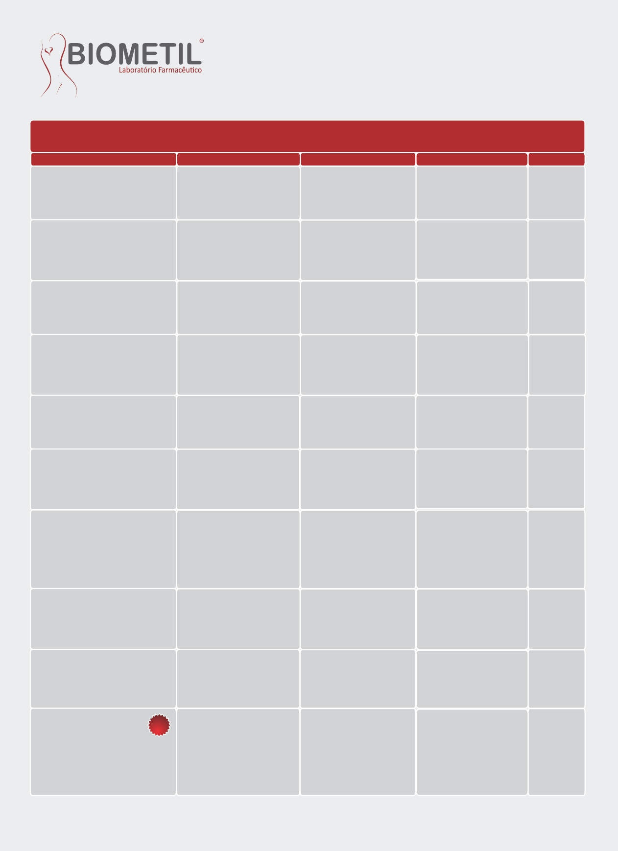 ATIVOS MAIS PERSONALIZADOS* PRESCRIÇÕES MAIS ULTILIZADOS* PREÇO R$ 611,00 APRESENTAÇÃO DE COLÁGENO BIOESTIMULADOR Hidroxiapatita de Cálcio (Biocrystal) COMPOSIÇÃO Hidroxiapatita de cálcio 30% e Gel de carboximetilcelulose 70% Microcânula 22 G Aplicação Derme Profunda / Subcutâneo Agulha 26 G 1/2 + Agulha para pertuito 21 G Seringa estéril com 1,5 ml + Microcânulas 22 G + Misturador R$ 633,40 (Rejuvenescimento Facial - ID) Solução de Rejuvenescimento Polirrevitalizante SKIN BOOSTER Minerais - 05 Ácidos nucleicos - 06 Coenzimas - 02 Antioxidantes - 23 5.0MG/ml - 13 Vitaminas - 06 Hyaluronic Acid No Reticulated Aminoácidos Agulha de Lebel 4 mm a 6 mm Agulha de Insulina 8x0,30 mm Aplicação Intradérmica, Microagulhamento ou Microcânula Caixa com 5 frascos, contendo 3 ml + 15 seringas de 1 ml R$ 506,10 GORDURA SUBMENTONIANA (Redução de papada) Ácido Deoxicólico 20 mg/2 ml Aplicação Subcutânea agulha de Insulina 8x0,30 mm Intervalo de 21 a 30 dias 0,1 a 0,2 ml por ponto Caixa com 4 ampolas de 2 ml + 4 seringas com agulha R$ 77,20EMAGRECIMENTO FACIAL Dmae 3% SAC 0,5% Desoxicolato de sódio 1% Tripeptídeo 41 0,5% Lidocaína 1% Intervalo de 30 dias 0,1 a 0,2 ml por ponto Aplicação Subcutânea Agulha de Lebel 4 mm a 6 mm Caixa com 2 ampolas de 5 ml R$ 244,00DMAE – COMPLEX mg/ml - Ácido Alfa Lipóico 0,5% - Dmae 3% - Ácido Hialurônico Lidocaína 1% 40 mg/2 ml - Silício Orgânico 1 Aplicação Intradérmica ou Microagulhamento Agulha de Lebel 4 mm a 6 mm ou agulha de Insulina Caixa com 5 frascos de 10 ml R$ 52,60FATOR DE CRESCIMENTO FACIAL 1 Amp/5 ml - EGF + TGF 25 mg/5 ml + 1 Amp/5 ml REV – FACE Dmae 1.5% - Silício Orgânico 0.1% - Coenzima Q.10 - 0.6% - Lidocaína 0.5% Aplicação Intradérmica ou Microagulhamento Agulha de Lebel 4 mm a 6 mm ou agulha de Insulina Caixa com 2 ampolas de 5 ml R$ 78,20F-1 FLACIDEZ FACIAL Silício Orgânico 1 mg/ml 2 ml (Ácido Hialurônico 2,5%+Condroitín 10 %) Solução Gel - Frasco Dmae 3% 2 ml Ácido Alfa Lipóico 0,5% - 2 ml Elastina 20 mg/2 ml - 2 ml Lidocaína 1% 2 ml Aplicação Intradérmica, Microagulhamento agulha de Insulina Agulha de Lebel 4 mm a 6 mm ou Frasco + 5 ampolas de 2 ml (aspirar o conteudo das ampolas e misturar no frasco) Kit R$ 57,30MELASMA Ácido Kójico 2 mg - Ácido Tranexâmico 8 mg - Sulfato de Magnésio 200 mg - Vitamina C 400 mg - Lidocaína 20 mg Agulha de Lebel 4 mm a 6 mm ou agulha de Insulina Aplicação Intradérmica ou Microagulhamento Caixa com 2 Ampolas de 5 ml R$ 50,40MELASMA Frasco Estéril 10 ml - Ácido Kójico 4 mg/ml – 2 ml - Sulfato de Magnésio 10% - 2 ml - Vitamina C 20% -2 ml - Lidocaína 1% - 2 ml 0,1% - 2 ml - Ácido Tranexâmico Agulha de Lebel 4 mm a 6 mm ou agulha de Insulina Aplicação Intradérmica ou Microagulhamento 5 Ampolas 2 ml + Frasco Estéril (aspirar o conteúdo das ampolas e misturar no frasco) Kit R$ 98,10 DESPIGMENTANTE FACIAL Cisteamina 2,5% - 2 ml – Frasco Ácido Tranexâmico 0,3% - 2 ml TGFB3 1,5% + TGP2 3% - 2 ml + Alfa Arbutin 15 mg/ml – 2 mL Ácido Fítico 1,5% - 2 ml Ácido Lático 1% + CoQ10 2,5% + Glutationa 75 mg/ml + L-Cisteína 3% Lidocaína 2% - 2 mL Agulha de Lebel 4 mm a 6 mm ou agulha de Insulina Aplicação Intradérmica ou Microagulhamento Frasco + 5 ampolas de 2 ml (aspirar o conteúdo das ampolas e misturar no frasco) Kit Os valores citados abaixo são uma sugestão, devido ao fato de que serão calculados individualmente mediante prescrição do profissional habilitado. TRATAMENTOS FACIAIS – ID (pós-microagulhamento ou intradermoterapia) NOVO Revisão 00/2023 Usualmente associado a ADN. IMAGEM MERAMENTE ILUSTRATIVA | MATERIAL DE AJUDA VISUAL. O LABORATÓRIO BIOMETIL SEGUE A LEGISLAÇÃO VIGENTE ANVISA RDC 67/2007. USO EXCLUSIVO DE PROFISSIONAIS PRESCRITORES HABILITADOS. É OBRIGATÓRIO E INDISPENSÁVEL O ENVIO DA PRESCRIÇÃO. ** L IS T A R E F E R E N T E A S P R E S C R IÇ Õ E S M A IS E N V IA D A S A O L A B O R A T Ó R IO B IO M E T IL N O S Ú LT IM O S 1 2 M E S E S A T É E S T A E D IÇ Ã O . RELAÇÃO DOS ATIVOS MAIS PRESCRITOS POR PROFISSIONAIS NOS ÚLTIMOS 12 MESES ** 01 R$ 105,00 R$ 112,10 R$ 198,20 R$ 264,20ÓLEO LIPOSSOMADO DE GIRASSOL Óleo Lipossomado de Girassol Heli Gel 6,8% + L-Carnitina 500 mg/5 ml Agulha 0,30x13mm Intervalo 7 dias 0,2 a 0,5 ml por ponto Aplicação Subcutânea 5 seringas de 5 ml + 10 agulhas Caixa com 5 ampolas de 5 ml + R$ 145,30Gel 6,8% + L-Carnitina 500 mg/5 ml Óleo Lipossomado de Girassol Heli + Bloqueador Ppar-y Intervalo 7 dias Agulha 0,30x13mm 0,2 a 0,5 ml por ponto Aplicação Subcutânea Caixa com 2 ampolas de 5 ml R$ 282,50M 5 L.G - GORDURA LOCALIZADA Agulha 0,30x13 mm Intervalo 7 dias Aplicação Subcutânea 0,2 a 0,5 ml por ponto Caixa com 5 frascos com 10 ml pronto para uso Os valores citados abaixo são uma sugestão, devido ao fato de que serão calculados individualmente mediante prescrição do profissional habilitado. ÓLEO LIPOSSOMADO DE GIRASSOL 6,8% - SAC 5 mg/ml - L-Carnitina Lipossomado de Girassol Heli Gel 10% - Tripeptídeo 41 1,2% - Lidocaína 1% Benzopirona 0,1% - Óleo PREÇOAPRESENTAÇÃOCOMPOSIÇÃO Caixa com 3 ampolas Hialuronidase + 3 ampolas 5 ml diluente Os valores citados abaixo são uma sugestão, devido ao fato de que serão calculados individualmente mediante prescrição do profissional habilitado. HIALURONIDASE Hialuronidase 2.000 UTR Hialuronidase 3.000 UTR Hialuronidase 20.000 UTR HIALURONIDASE (correção de Ácido Hialurônico Re�culado) LIPOSSOMADO DE GIRASSOL (GORDURA LOCALIZADA) R$ 54,70G-6 GORDURA LOCALIZADA Aplicação Subcutânea 0,2 a 0,5ml por ponto Agulha 0,30x13mm Intervalo 7 dias Tripeptídeo 41 1,2% - 2 ml Hialuronidase 3000 UTR - Frasco SAC 5 mg/ml -2 ml Desoxicolato 120mg/2 ml – 2 ml L Carnitina 600mg /2 ml – 2 ml Lidocaína 1%- 2 ml R$ 272,20M 5-T GORDURA LOCALIZADA 10% - Tripeptídeo 41 1,2% -Lidocaína 1% Benzopirona 0,1% - Desoxicolato 3% - SAC 5 mg/ml - L Carnitina Intervalo 7 dias Aplicação Subcutânea 0,2 a 0,5m