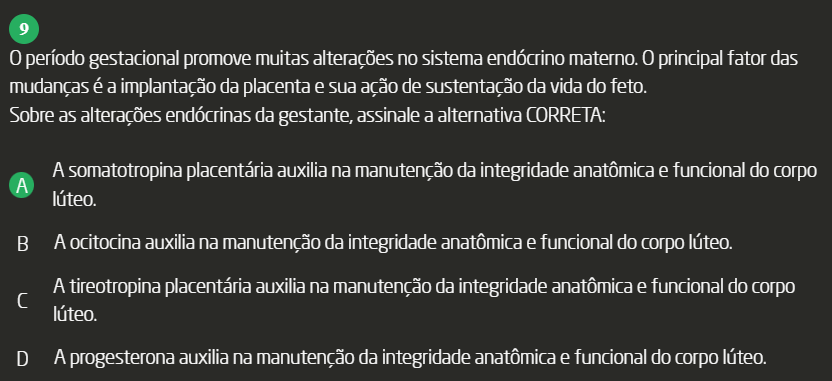 9 0 período gestacional promove muitas alterações no sistema endócrino materno. 0 principal fator das mudanças é a implantação da placenta e sua ação de sustentação da vida do feto. Sobre as alterações endócrinas da gestante, assinale a alternativa CORRETA: A somatotropina placentária auxilia na manutenção da integridade anatômica e funcional do corpo A lúteo. B A ocitocina auxilia na manutenção da integridade anatômica e funcional do corpo lúteo. A tireotropina placentária auxilia na manutenção da integridade anatômica e funcional do corpo C lúteo. D A progesterona auxilia na manutenção da integridade anatômica e funcional do corpo lúteo.