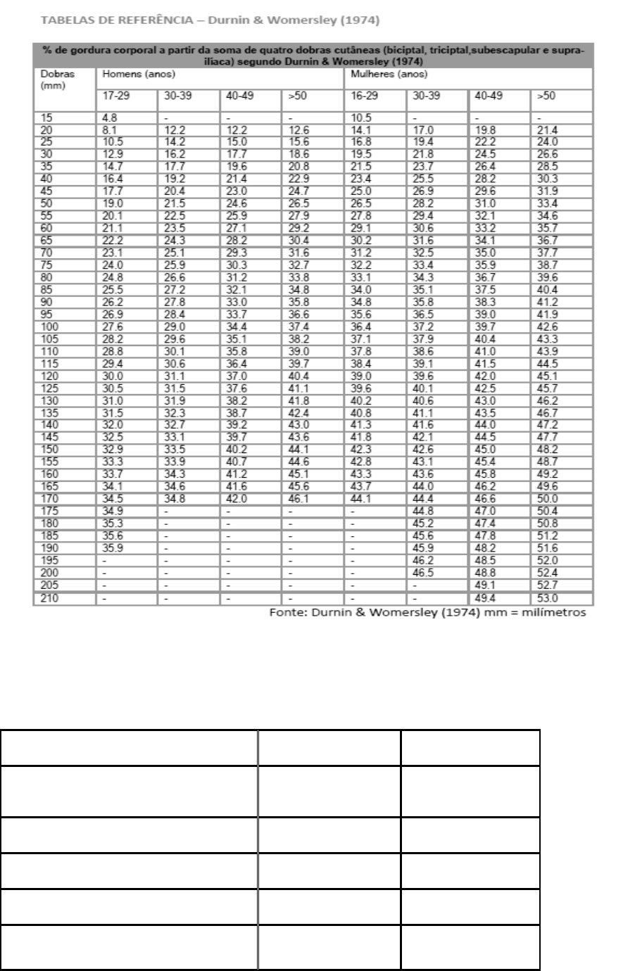 Homens : 17 a 72 anos / Mulheres: 16 a 68 anos Avaliação do percentual de gordura corporal: Homens Mulheres Risco de doenças associadas à desnutrição ≤ 5% ≤ 8% Abaixo da média 6 – 14% 9 – 22% Média 15% 23% Acima da média 16 – 24% 24 – 31% Risco de doenças associadas à obesidade ≥ 25% ≥ 32% (Lohman, 1992)