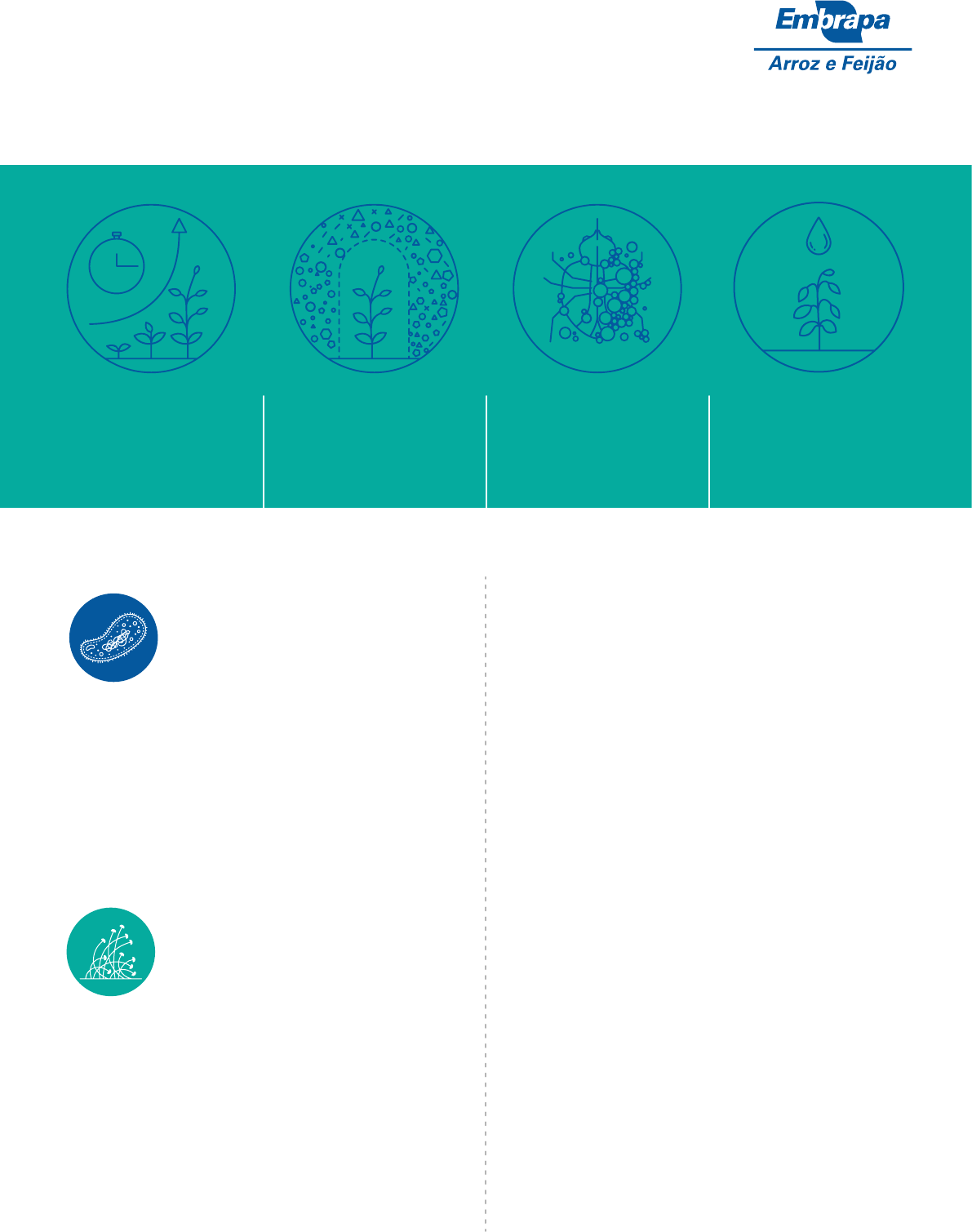 Indução de Resistencia em Plantas e Controle Biológico de Doenças Promotores do Crescimento das Plantas PORTFÓLIO DE MICRORGANISMOS MULTIFUNCIONAIS Parasita de Artrópodes Praga Tolerância à Dé�cit Hídrico Bactérias Fungos 1. Serratia sp. 2. Burkholderia sp. 3. Bacillus sp. 1. Metarhizium anisopliae 2. Cordyceps (=Isaria) javanica 3. Beauveria sp. 4. Trichoderma sp. 5. Phanerochaete australiani Este portfólio descreve, de modo prático, os principais microrganismos seleciona- dos e caracterizados pela Embrapa Arroz e Feijão. Aqui são agrupados pelo tipo e funcionalidade, representando excelen- tes oportunidades de negócios. Esses microrganismos foram seleciona- dos e aprovados seguindo rigorosos pro- tocolos de qualidade e eficiência em três níveis de teste: Laboratório » Estufa » Campo Alguns desses microrganismos surpeen- dem pela capacidade de gerar impacto positivo em mais de um dos processos de desenvolvimento da planta. A Embrapa Arroz e Feijão conta ainda com um Banco de Germoplasma com- posto por mais de 16.000 acessos, o que o torna um dos mais valiosos ativos de uma instituição de pesquisa que tem a inovação em seu DNA. Bactérias Resultado Esperado / Impacto • Melhora da produtividade; • Redução no custo com fertilização; • Manejo de doenças e pragas. Principais Culturas Arroz, braquiária, feijão, milho e soja. Bactéria que produz celulases, fosfatase, sideróforos e ácido indo- lacético (AIA). Essa bactéria destaca-se como promotora de cres- cimento e indutora de compostos de defesa (β-1,3 glucanase, peroxidase, lipoxigenase, fenilalanina amônia-liase e ácido salicíli- co), quando associada à planta do arroz, proporcionando ganhos no desenvolvimento de raízes (87%) e biomassa vegetal (63%). Além do antagonismo comprovado em laboratório para as princi- pais doenças da cultura do arroz, proporcionam supressão de até 65% de brusone foliar, e 60% do gorgulho aquático em campos de arroz. O controle de nematoides em soja também apresentou resultados promissores em casa de vegetação, com redução de 72% de Pratylenchus brachyurus. Os isolados desse gênero também proporcionaram ganhos nas trocas gasosas, absorção de macro e micronutrientes, desenvolvi- mento de raízes e biomassa, produção de fosfatases, componen- tes produtivos e aumento no rendimento de grãos de arroz, milho, feijão-comum e caupi, soja e braquiária, tanto em estudos em estufa ou campo. F o to : M ar ia na A . S ilv a 1. Serratia sp. Planta de soja tratada com Serratia sp. (esquerda) e a planta de soja sem microrganismo (direita). Bactérias Bactéria capaz de produzir enzimas como lipase, protease, celula- se, sideróforos e solubilizadores de fostato, além de compostos de defesa como quitinase, β-1,3 glucanase, peroxidase, lipoxigenase, fenilalanina amônia-liase e ácido salicílico, quando associada às plantas de arroz. Suas características permitem que atue na promoção de crescimento, no aumento da resiliência ao déficit hídrico e no controle biológico de forma direta, como antagonista para as principais doenças da cultura: brusone, mancha-parda e queima da bainha, e indireta, induzindo a resistência das plantas a patógenos. Estudos em casa de vegetação comprovaram também a eficiên- cia do isolado como promotor de crescimento em plantas de feijão-comum e caupi, milho, soja e braquiária. 2. Burkholderia sp. Resultado Esperado / Impacto • Aumento da produtividade; • Manejo de doenças em arroz. Principais Culturas Arroz, braquiária, feijão, milho e soja. F o to : M ar ia na A . S ilv a F o to s: M . C ris tin a C . F ili p p i Planta de soja tratada com Burkholderia sp. (esquerda) e planta de soja sem microrganismo (direita). Planta de arroz tratada com Burkholderia sp. (esquerda) e severidade de brusone reduzida, e planta de arroz sem microrganismo (direita) com alta severidade de brusone Bactérias 3. Bacillus sp. Resultado Esperado / Impacto • Manejo integrado de pragas e doenças; • Aumento de produtividade; • Redução do impacto ambiental. Principais Culturas Arroz, feijão-comum, milho e soja. Essa bactéria já é conhecida por sua capacidade de parasitar inse- tos. No entanto, quando em contato com a planta, é capaz de induzir enzimas e compostos de defesa (celulase, β-1,3 glucanase, peroxidase, lipoxigenase, fenilalanina amônia-liase e ácido salicíli- co). É produtor de outros compostos (lipase, celulase, fosfatase e sideroforos) que conferem a ele estabelecer relação de antagonis- mos a patógenos (fungos e nematoides). Um exemplo é a redução do crescimento micelial de M. oryzae (agente causal da brusone das folhas) de 40 a 50%. Como promotor de crescimento, promove ganhos nas trocas gasosas, absorção de macro e micronutrientes, desenvolvimento radicular, biomassa da parte aérea, componentes de produção. Sua atuação como promotor de crescimento foi comprovada em estufa, combinado a diferentes isolados, nas culturas de arroz, milho, feijão e soja. Nesse ambiente também foi possível verificar a eficiência para redução de estresse hídrico em arroz e na solubi- lização de fosfato em feijão. F o to : M ar ia na A . S ilv a Plantas de soja tratadas com Bacillus sp. (esquerda) e plantas de soja sem o microrganismo (direita). 1. Metarhizium anisopliae Resultado Esperado / Impacto • Manejo integrado de pragas; • Redução do impacto ambiental; • Controle e�ciente de pragas. Principais Culturas Algodão, arroz, feijão e soja. O isolado genuíno de M. anisopliae causa epizootias (infecção de grande número de insetos ao mesmo tempo) e infecta ovos, ninfas e adultos do percevejo-do-colmo do arroz Tibraca limbativentris. Estudos de campo realizados com esse fungo, aplicado isolada- mente ou combinado com inseticidas, mostraram alta eficiência no controle dessa praga. Além disso, este isolado apresentou alta virulência ao bicudo-do- algodoeiro, Anthonomus grandis, aos percevej