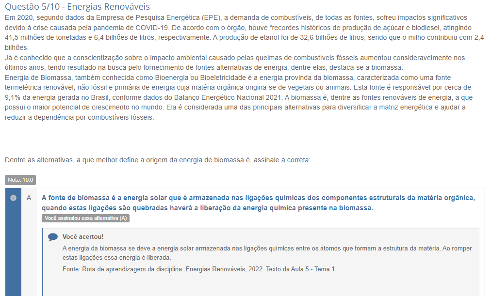 Questão 5/10 - Energias Renováveis Em 2020, segundo dados da Empresa de Pesquisa Energética (EPE), a demanda de combustíveis, de todas as fontes, sofreu impactos significativos devido à crise causada pela pandemia de COVID-19. De acordo com órgão, houve "recordes históricos de produção de açúcar e biodiesel, atingindo 41,5 milhões de toneladas e 6,4 bilhões de litros, respectivamente. A produção de etanol foi de 32,6 bilhões de litros, sendo que milho contribuiu com 2,4 Já é conhecido que a conscientização sobre impacto ambiental causado pelas queimas de combustíveis fósseis aumentou consideravelmente nos últimos anos, tendo resultado na busca pelo fornecimento de fontes alternativas de energia, dentre elas, destaca-se a Energia de Biomassa, também conhecida como Bioenergia ou Bioeletricidade é a energia provinda da caracterizada como uma fonte termelétrica renovável, não fóssil e primária de energia cuja matéria orgânica origina-se de vegetais ou Esta fonte é responsável por cerca de 9,1% da energia gerada no Brasil, conforme dados do Balanço Energético Nacional 2021. A biomassa é, dentre as fontes renováveis de energia, a que possui maior potencial de crescimento no Ela é considerada uma das principais alternativas para diversificar a matriz energética e ajudar a reduzir a dependência por combustíveis Dentre as alternativas, a que melhor define a origem da energia de biomassa é, assinale a correta: 10.0 A A fonte de biomassa é a energia solar que é armazenada nas ligações químicas dos componentes estruturais da matéria orgânica, quando estas ligações são quebradas haverá a liberação da energia química presente na biomassa. Você assinalou essa alternativa (A) Você acertou! A energia da biomassa se deve a energia solar armazenada nas ligações químicas entre os átomos que formam a estrutura da matéria. Ao romper estas ligações essa energia é Fonte: Rota de aprendizagem da disciplina: Energias Renováveis, 2022. Texto da Aula 5 Tema 1.