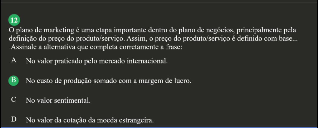 12 O plano de marketing é uma etapa importante dentro do plano de negócios, principalmente pela definição do preço do produto/serviço. Assim, preço do produto/serviço é definido com base... Assinale a alternativa que completa corretamente a frase: A No valor praticado pelo mercado internacional. B No custo de produção somado com a margem de lucro. C No valor sentimental. D No valor da cotação da moeda estrangeira.