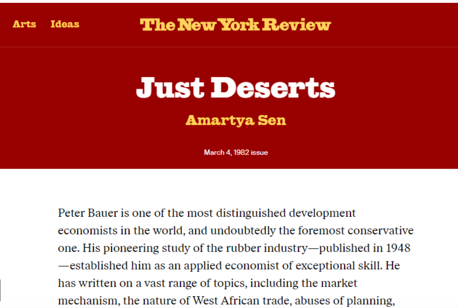 continuing reading... https://www.nybooks.com/articles/1982/03/04/just-deserts/ ___________________________________________________________ Peter Bauer is one of the most distinguished development economists in the world, and undoubtedly the foremost conservative one. His pioneering study of the rubber industry—published in 1948—established him as an applied economist of exceptional skill. He has written on a vast range of topics, including the market mechanism, the nature of West African trade, abuses of planning, and occupational statistics. There are few branches of development economics in which Bauer has not had something interesting and important to say. And he has gone beyond development economics into the study of comparative economic systems, international economic relations, and general political economy. This book, consisting of a collection of Bauer’s essays (most of which were published elsewhere earlier), gives an excellent account of his main theses on development policy and international relations. It also presents his approach to economic equality and inequality in general, and places his discussions of development against the background of some of the broadest issues of political economy. It is an exciting book. It is also extremely provocative—Bauer is no compromiser—and I have to confess to being suitably provoked. I shall argue that Bauer’s approach—in spite of its power and appeal—is fundamentally flawed, and that his analysis cannot bear the weight of the conclusions that he rests on it. Bauer sees himself as standing very much against the current. The “economic delusion” he refers to in the title of the book is, he argues, shared widely. “The poor are seen,” he complains, “as passive but virtuous, the rich as active but wicked.” This picture is painted by certain groups who regard themselves as standing apart from rich and poor, and perhaps as above both. They are, in the main, politicians, social reformers, welfare administrators, social scientists, writers, artists, media people, churchmen and even entertainers. As noted in the Introduction, they now form much of what was once called the political nation. It is certainly true that the views that Bauer attacks are widely shared. But Bauer isn’t particularly isolated himself. His arguments develop and reinforce deep-seated conservative beliefs. Also, as it happens, both in Bauer’s own country—Britain—and that of his publisher—the United States—the governments in power share Bauer’s economic outlook, even though that outlook is rarely defended as fluently and cogently as Bauer defends it. Bauer is, in fact, an eloquent, original, and influential member of the powerful conservative tradition in political economy. He may be facing a multitude of opponents, but he is also leading a large group himself. It is best to get this straight if his book is to be seen in perspective. If Bauer sees himself as David facing Goliath, then David has come to the battleground on the shoulders of a second Goliath—one that rules much of the world. Bauer’s arguments not only attack widely held views; they also provide justification for some of the most entrenched beliefs underlying official policy in such countries as the United States and Britain. Two different types of reasoning can be found in Bauer’s book. They may be called—for want of better terms—“direct” and “indirect.” Direct arguments take the form of denying or disputing the substance of the claims—empirical or otherwise—of the opponents. Indirect arguments debunk opponents by showing that they stand to gain from the acceptance of the “delusions” they spread. The latter method of arguing is more common in law courts than in academic discussions, but Bauer is cogent in his defense of it. It is both understandable and legitimate to ask how it comes about that leading academics or other influential people canvass plainly insubstantial notions which must affect both the intellectual scene and the course of events. Indeed, even if these ideas are successfully refuted, some doubts are likely to remain in the minds of readers, unless the critic can suggest some acceptable reasons why these ideas have come to be advanced. Bauer then proceeds to argue that “the emergence and survival of most of the transgressions reviewed in this book” serve the interests of those who champion them, whether they are planners, economists, or politicians. “Almost all of these [transgressions] promote or underpin policies which enhance the role and power of groups which comprise a major part of the contemporary political nation,” and “the acceptance of these transgressions therefore serves their emotional, political and material interests.” Bauer’s indirect arguments might look plausible, adding force to his main theses (indeed they are part of his main theses), but they are, in fact, inconclusive. First, they point to a very broad and rather vague congruence of the interests with the views of the people he attacks. In order to carry conviction, linking opinions with personal advantage has to be done much more precisely, discriminating between alternative hypotheses and examining the available evidence in detail, to refute some hypotheses and confirm others. Bauer, whose standards of empirical economics are exacting, is astonishingly tolerant of his conjectures about the sociological and psychological bases of economic and political theorizing. Second, the indirect arguments essentially depend on the direct arguments, and if the opposing views cannot be rejected on direct evidence, they cannot be rejected on the grounds that these views coincide with the interests of their proponents. This point is not, in fact, in conflict with Bauer’s own case for pursuing indirect arguments, which are put forward essentially as supplementing direct arguments. The need to explain why “leading academics or other influential people canv