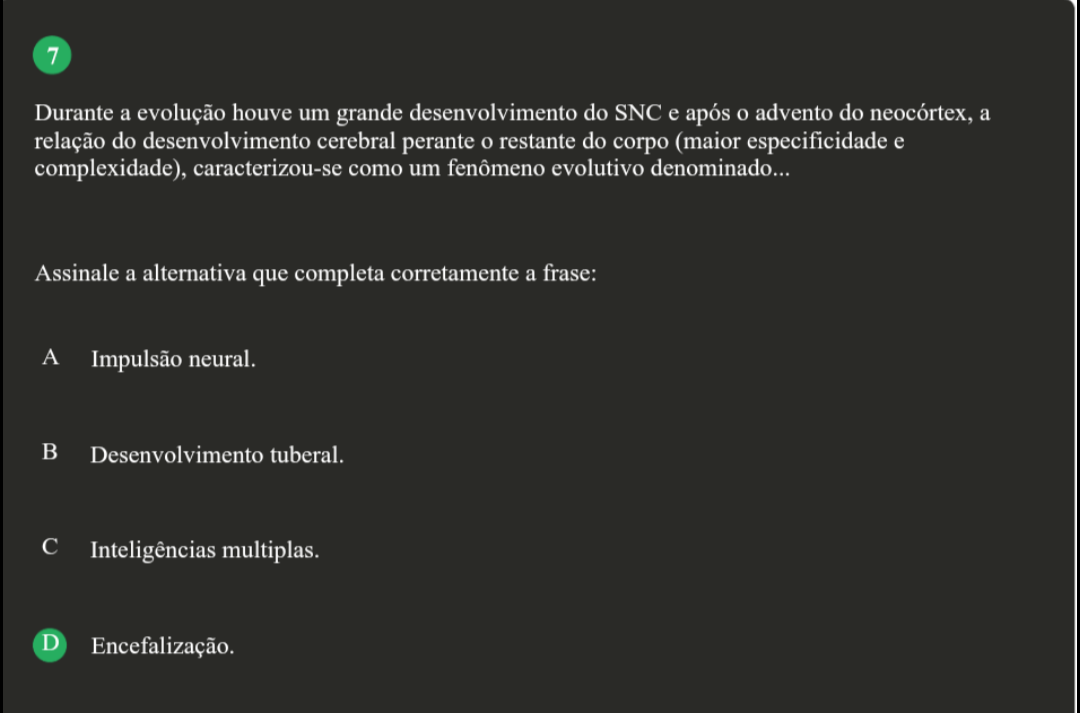 7 Durante a evolução houve um grande desenvolvimento do SNC e após o advento do neocórtex, a relação do desenvolvimento cerebral perante restante do corpo (maior especificidade e complexidade), caracterizou-se como um fenômeno evolutivo denominado... Assinale a alternativa que completa corretamente a frase: A Impulsão neural. B Desenvolvimento tuberal. C Inteligências multiplas. D Encefalização.