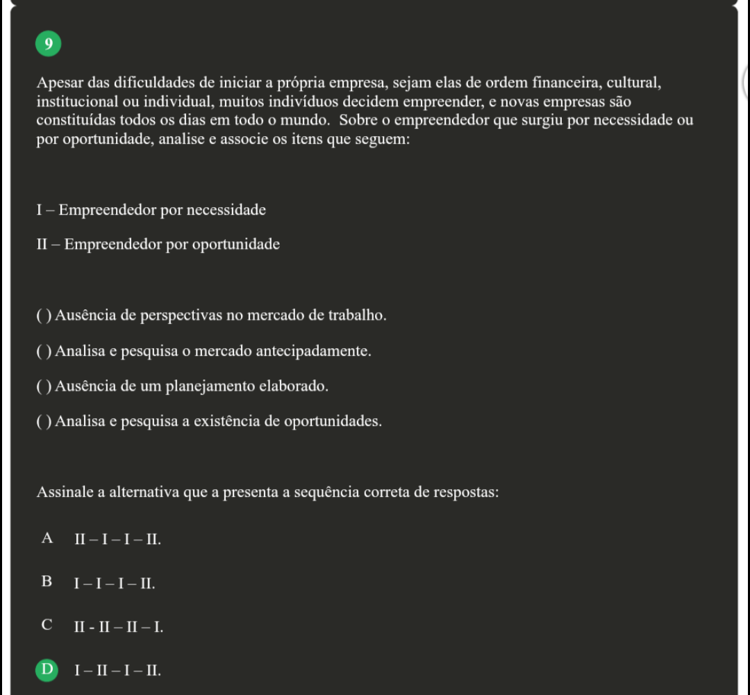 9 Apesar das dificuldades de iniciar a própria empresa, sejam elas de ordem financeira, cultural, institucional ou individual, muitos indivíduos decidem empreender, e novas empresas são constituídas todos os dias em todo o mundo. Sobre empreendedor que surgiu por necessidade ou por oportunidade, analise e associe os itens que seguem: I - Empreendedor por necessidade II - Empreendedor por oportunidade () Ausência de perspectivas no mercado de trabalho. () Analisa e pesquisa mercado antecipadamente. () Ausência de um planejamento elaborado. () Analisa e pesquisa a existência de oportunidades. Assinale a alternativa que a presenta a sequência correta de respostas: A B I-I-I-II. C - I. D