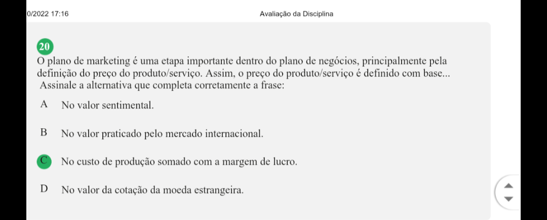 0/2022 17:16 Avaliação da Disciplina 20 plano de marketing é uma etapa importante dentro do plano de negócios, principalmente pela definição do preço do produto/serviço. Assim, o preço do produto/serviço é definido com base... Assinale a alternativa que completa corretamente a frase A No valor sentimental. B No valor praticado pelo mercado internacional. C No custo de produção somado com a margem de lucro. D No valor da cotação da moeda estrangeira.