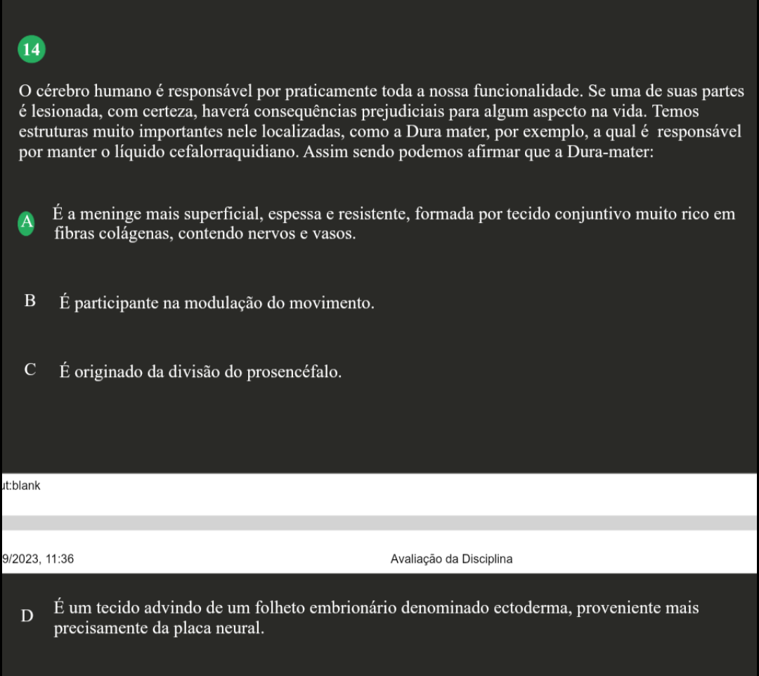 14 O cérebro humano é responsável por praticamente toda a nossa funcionalidade. Se uma de suas partes é lesionada, com certeza, haverá consequências prejudiciais para algum aspecto na vida. Temos estruturas muito importantes nele localizadas, como a Dura mater, por exemplo, a qual é responsável por manter líquido cefalorraquidiano. Assim sendo podemos afirmar que a Dura-mater: A É a meninge mais superficial, espessa e resistente, formada por tecido conjuntivo muito rico em fibras colágenas, contendo nervos e vasos. B É participante na modulação do movimento. C É originado da divisão do prosencéfalo. ut:blank 11:36 Avaliação da Disciplina D É um tecido advindo de um folheto embrionário denominado ectoderma, proveniente mais precisamente da placa neural.