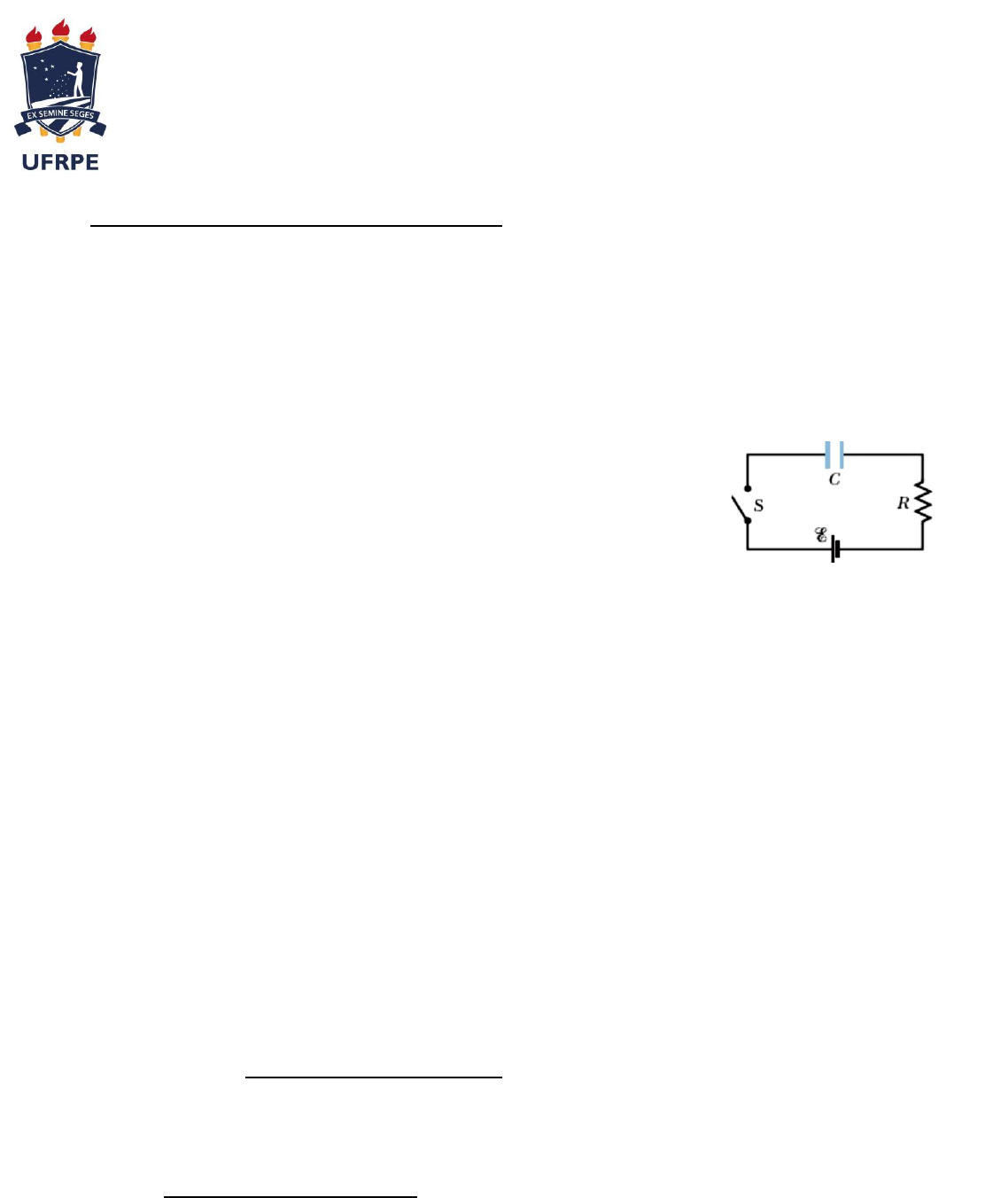 UNIVERSIDADE FEDERAL RURAL DE PERNAMBUCO FÍSICA GERAL 4 – 2023.I UFRPE/UACSA 1ª VA 1ª. Questão:__________ 2ª. Questão:__________ 3ª. Questão:__________ Total: __________ Nome: ______________________________________ Turma: T01 Data: 21 / 11 / 2023 Obs.: Só serão aceitas as respostas com seus respectivos cálculos e justificativas. Use 𝜺𝟎 = 𝟖, 𝟖𝟓 × 𝟏𝟎−𝟏𝟐 𝑪𝟐 (𝑵𝒎𝟐)⁄ , 𝝁𝟎 = 𝟏, 𝟐𝟔 × 𝟏𝟎−𝟔𝑯 𝒎⁄ e 𝒄 = 𝟑, 𝟎 × 𝟏𝟎𝟖𝒎/𝒔 (velocidade da luz no vácuo) Questão 1 [3,0 pontos]: O circuito ao lado é formado por uma chave S, uma fonte ideal de 12,0 V, um resistor de 20,0 MΩ e um capacitor cujo dielétrico é o ar. O capacitor tem placas circulares paralelas com 5,00 cm de raio, separadas por uma distância de 3,00 mm (lembrando que 𝑪 = 𝜺𝟎𝑨 𝒅⁄ ). No instante t = 0, a chave S é fechada e o capacitor começa a se carregar. O campo elétrico entre as placas é uniforme. No instante t = 250 μs, determine: (a) [1,5] Qual a corrente de deslocamento no interior do capacitor. (b) [1,5] Qual é o módulo do campo magnético no interior do capacitor, a uma distância radial de 3,00 cm? Questão 2 [4,0 pontos]: Uma onda eletromagnética plana, com um comprimento de onda de 3,0 m, se propaga no vácuo, no sentido positivo do eixo x. O campo elétrico, cuja amplitude é 300 V/m, oscila paralelamente ao eixo y. Determine: (a) [0,5] A frequência da onda. (b) [0,5] A frequência angular da onda. (c) [0,5] O número de onda. (d) [0,5] A amplitude do campo magnético associado à onda. (e) [0,5] O campo magnético oscila paralelamente a que eixo? (Justifique sua resposta). (f) [0,5] Qual é o fluxo médio de energia, em watts por metro quadrado, associado à onda?. A onda ilumina uniformemente uma placa com uma área de 2,0 m2. Se a placa absorve totalmente a onda, determine: (g) [0,5] A taxa com a qual o momento é transferido à placa. (h) [0,5] A pressão exercida pela radiação sobre a placa. Questão 3 [3,0 pontos]: Uma mosca de altura H está no eixo central da lente 1. A lente forma uma imagem da mosca a uma distância d = 20 cm da mosca; a imagem é não invertida e tem uma altura HI = 2,0H. Determine: (a) [1,5] A distância focal f1 da lente e a distância p1 entre a mosca e a lente. A mosca abandona a lente 1 e pousa no eixo central da lente 2, que também forma uma imagem não invertida a uma distância d = 20 cm da mosca, mas agora HI = 0,50H. Determine: (b) [1,5] A distância focal f2 da lente e a distância p2 entre a mosca e a lente.