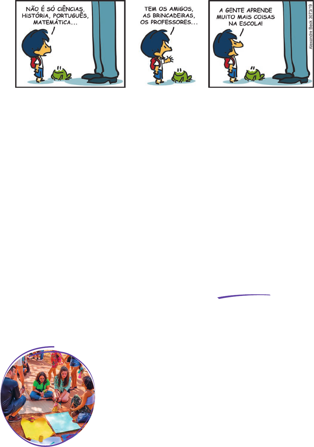 BECK, Alexandre. Tirinha do Armandinho. Zero Hora, Porto Alegre, 2019. � O desenvolvimento de um estudante autônomo e ético Uma questão importante a ser levada em considera- ção é a formação integral. O estudante não vai à escola apenas para aprender conteúdos. Vai também para de- senvolver-se como futuro adulto responsável e dotado da criticidade que o mundo de hoje exige de cada um de nós. Sendo assim, é importante contribuir com a for- mação dos estudantes não somente oferecendo conteú- dos curriculares convencionais ou conceitos específicos de cada disciplina, mas também propostas que dialo- guem com competências e habilidades que vão além de conteúdos puramente disciplinares, como a responsabi- lidade, a empatia, o pensamento científico, a argumenta- ção, entre muitas outras possibilidades. Uma das maneiras de promover a formação integral é favorecendo o desenvolvimento da autonomia por par- te dos estudantes, conforme a própria proposta do Novo Ensino Médio. A sociedade sempre cobra maturidade, responsabilidade e ética dos jovens, mas para isso é ne- cessário que eles possam fazer suas próprias escolhas e agir com autonomia. É necessário dar oportunidades pa- ra que eles aprendam a ser responsáveis e se deparem com desafios que estimularão o desenvolvimento de uma postura ética e crítica. Os pais, mães e outros responsáveis podem dialogar com os estudantes e orientá-los nesse sentido. No entan- to, a autonomia do estudante vai se constituindo com o tempo, com escolhas e decisões do próprio jovem. Os desafios incenti- vam os estudantes a desenvolverem a autonomia. Na foto, jovens organizam ma- teriais para defesa de suas ideias em evento. hpoliveira/Shutterstock Portanto, é preciso partir do pressuposto de que o estudante é um sujeito dotado de história, vontade, cul- tura, identidade e capacidade de reflexão. A educação integral deve considerar o estudante em sua forma inte- gral, não como alguém que precisa apenas memorizar conteúdos para a prova. Em suma, o contexto atual exige que tanto o professor quanto o estudante percebam a etapa do Ensino Médio como uma oportunidade de de- senvolvimento mútuo, que envolve e vai muito além dos conteúdos disciplinares, e não apenas como uma etapa obrigatória antes da vida profissional ou da universidade. Isso não diminui, de modo algum, a importância dos con- teúdos disciplinares. Pelo contrário, são eles que contri- buem com o pensamento científico, com a inovação, com os cuidados com a saúde própria e coletiva, por exemplo. Mas a percepção de que educar é um ato complexo e completo garante que estejamos atentos e contribuindo para a formação de sujeitos responsáveis e dotados de senso crítico e ética. 2. A Base Nacional Comum Curricular (BNCC) A Base Nacional Comum Curricular (BNCC) deve ser entendida como uma série de orientações que balizam as propostas curriculares para toda a Educação Básica. Embora não seja propriamente um currículo, é uma refe- rência curricular cuja adoção é obrigatória e está prevista em lei. A BNCC está de acordo com o Plano Nacional de Educação (PNE) e as Diretrizes Curriculares Nacionais (DCN). Cada etapa do Ensino Básico possui uma seção da BNCC – Educação Infantil, Ensino Fundamental e En- sino Médio. Entre as diferentes motivações para a criação da BNCC está o estabelecimento de referenciais de aprendizagem para todo o Brasil, o que até então não existia. Estabele- cer uma base é uma forma de incentivar que todos os estudantes brasileiros, independentemente da escola que A rm a n d in h o , d e A le x a n d re B e ck /A c e rv o d o c a rt u n is ta ORIENTAÇÕES GERAIS | 165 160_202_V6_CIE_NAT_Mortimer_g21Sc_Parte_Comum_MP.indd 165160_202_V6_CIE_NAT_Mortimer_g21Sc_Parte_Comum_MP.indd 165 22/10/2020 11:1822/10/2020 11:18 frequentem ou de sua classe econômica, sigam a mesma referência comum obrigatória. A BNCC traz um ganho ao garantir que determinados saberes sejam obrigatoria- mente ensinados em todas as escolas. Certamente é desafiador implantar a BNCC con- templando as regionalidades, individualidades e dife- rentes culturas em um país continental e diverso como o Brasil. Todavia, é justamente em virtude dessa diver- sidade que a BNCC deve ser vista literalmente como uma base, para que seja o ponto a partir do qual a es- cola e os professores estabeleçam o currículo. Ou seja, a Base considera a diversidade nacional e permite e incentiva que os profes- sores trabalhem com questões locais diretamente relaciona- das à vida dos estudantes. A escola deve respeitar as- pectos regionais e culturais. Na foto, estudantes da etnia Kalapalo, aldeia Aiha, Querência (MT), 2018. Delf m M artin s/Pulsar Imagens mais amplas que as habilidades, por exemplo, que tratam de conhecimentos mais específicos. Mais adiante discu- tiremos essas diferenças e apresentaremos como as com- petências gerais são desenvolvidas nesta obra. � O ensino por áreas do conhecimento No Ensino Médio, há quatro áreas do conhecimento: Linguagens e suas Tecnologias, Matemática e suas Tec- nologias, Ciências da Natureza e suas Tecnologias e Ciên- cias Humanas e Sociais Aplicadas. O trabalho com áreas do conhecimento não implica a extinção das disciplinas. A BNCC reconhece a impor- tância de trabalhar com a perspectiva integrada dos sa- beres, com as inter-relações dos conceitos de cada disci- plina e também incentiva a interdisciplinaridade desde a concepção do currículo. Isso permite que o estudante possa reconhecer melhor o sentido da educação em re- lação à sua vida e ao seu entorno. Dito de outra forma, a interdisciplinaridade dá mais propósito à aprendizagem, pois, nessa perspectiva, os conhecimentos se conectam e permitem ao estudante chegar a algum lugar. Essa é também uma questão da sociedade contem- porânea, pois o mundo profissional e a própria vida em sociedade exigem de todos n