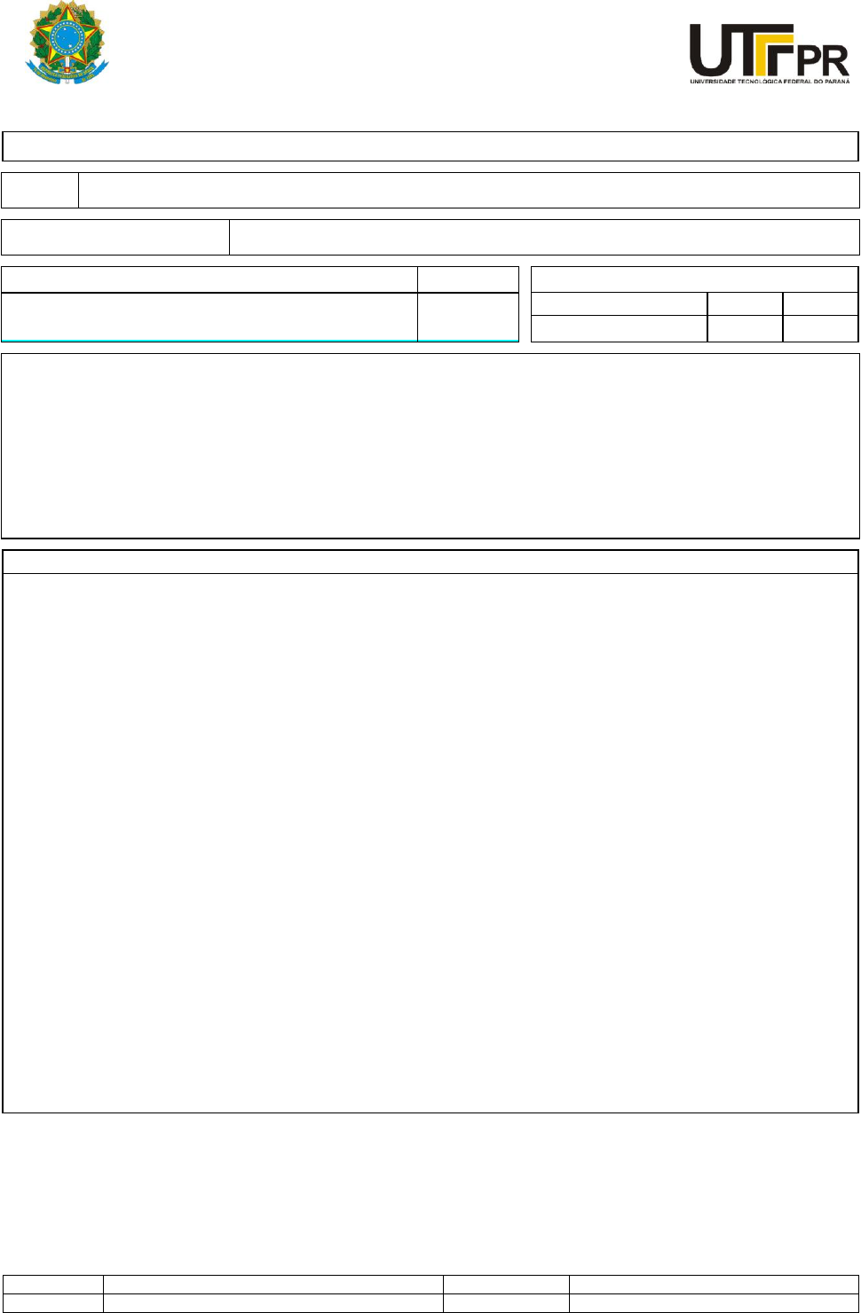 Revisado por: Julio César R. Azevedo Data: 01/2010 Aprovado por: Júlio César R. Azevedo Vigora a partir de: 01/2010 FORMULÁRIO UNIFICADO / GERÊNCIA DE ENSINO Ministério da Educação UNIVERSIDADE TECNOLÓGICA FEDERAL DO PARANÁ Campus Curitiba Ementa de Disciplina CURSO MESTRADO ACADÊMICO EM CIÊNCIA E TECNOLOGIA AMBIENTAL FUNDAMENTAÇÃO LEGAL Reconhecido pela CAPES em 01/2010. DISCIPLINA/UNIDADE CURRICULAR CÓDIGO CARGA HORÁRIA Métodos Instrumentais de Análises Aplicados a Ciências e Tecnologias Ambientais CTA009 Obrigatória Horas Créditos Sim ( ) Não ( X ) 60 4 EMENTA Métodos de diagnóstico e monitoramento de águas, ar e solos. Determinação qualitativa e quantitativa de contaminantes. Caracterização de materiais utilizados na remoção de poluentes. Dentre as técnicas estudadas estão: Espectrometria de Absorção e Emissão Atômica, Espectrometria UV – Visível, Espectroscopia de Infravermelho, Espectrometria de Massa, Análise Térmica, Técnicas Cromatográficas, Difração e Fluorescência de Raio-X, Microscopia Ótica, Microscopia Eletrônica de Varredura e de Transmissão, Espectroscopia Auger e de Fotoelétrons (XPS). REFERÊNCIAS 1. BRAITHWAITE, A.; SMITH, F.J. Chromatographic methods, 5. ed. London: Kluwer Academic Publishers Group r, 1995, 580p. 2. EWING, G.W. Métodos instrumentais de análise química. São Paulo: Edgard Blücher, 1972, 296p. 3. HARRIS, D. C. Análise Química Quantitativa, 6. ed. Rio de Janeiro: Ed. LTC, 2005, 876p. 4. HOLLAS, M. J. Basic atomic and molecular spectroscopy: basic concepts in chemistry. Wiley- RSC, 2002, 186p. 5. KELLNER, R.; OTTO, M.; MERMET, J.M. Analytical Chemistry: a modern approach to analytical science. 2. ed. Weinheim: John Wiley Professional, 2004, 1209p. 6. LANÇAS, F.M. Cromatografia em fase gasosa. São Carlos: Acta, 1993. 7. LATOUNETTE, A.J.; POMBEIRO, O. Técnicas e operações unitárias em química laboratorial, 2. ed. Lisboa: Fundação Calouste Gulbenkian, 1991. 8. PERRY, D.L. (ed). Applications of Analytical Techniques to the Characterization of Materials. New York: Plenum, 1992, 208p. 9. RIVIÉRE, J.C. MYHRA, S. Handbook of surface and interface analysis: methods for problem- solving. New York: Marcel Dekker, 1998, 1000p. 10. SETTLE, F.A. Handbook of instrumental techniques for analytical chemistry. New Jersey: Prentice-Hall, 1997, 995p. 11. SKOOG, D.A.; HOLLER, F.J.; NIEMAN, T.A. Principles of instrumental analysis. 5. ed. Philadelphia: Harcourt Brace, 1998, 700p. 12. SILVERSTEIN, R. M.; BASSLER, G. C.; MORRIL, T. C. Spectrometric identification of organic compounds. 7. ed. USA: John Wiley & Sons, 2005, 512p. 13. WILLARD, H.H.; MERRIT, L.L.; DEAN, J. Análise instrumental. 2. ed. Lisboa: Fundação Calouste Gulbenkia, 1974, 986p. OBS: Este formulário não serve como documento oficial.